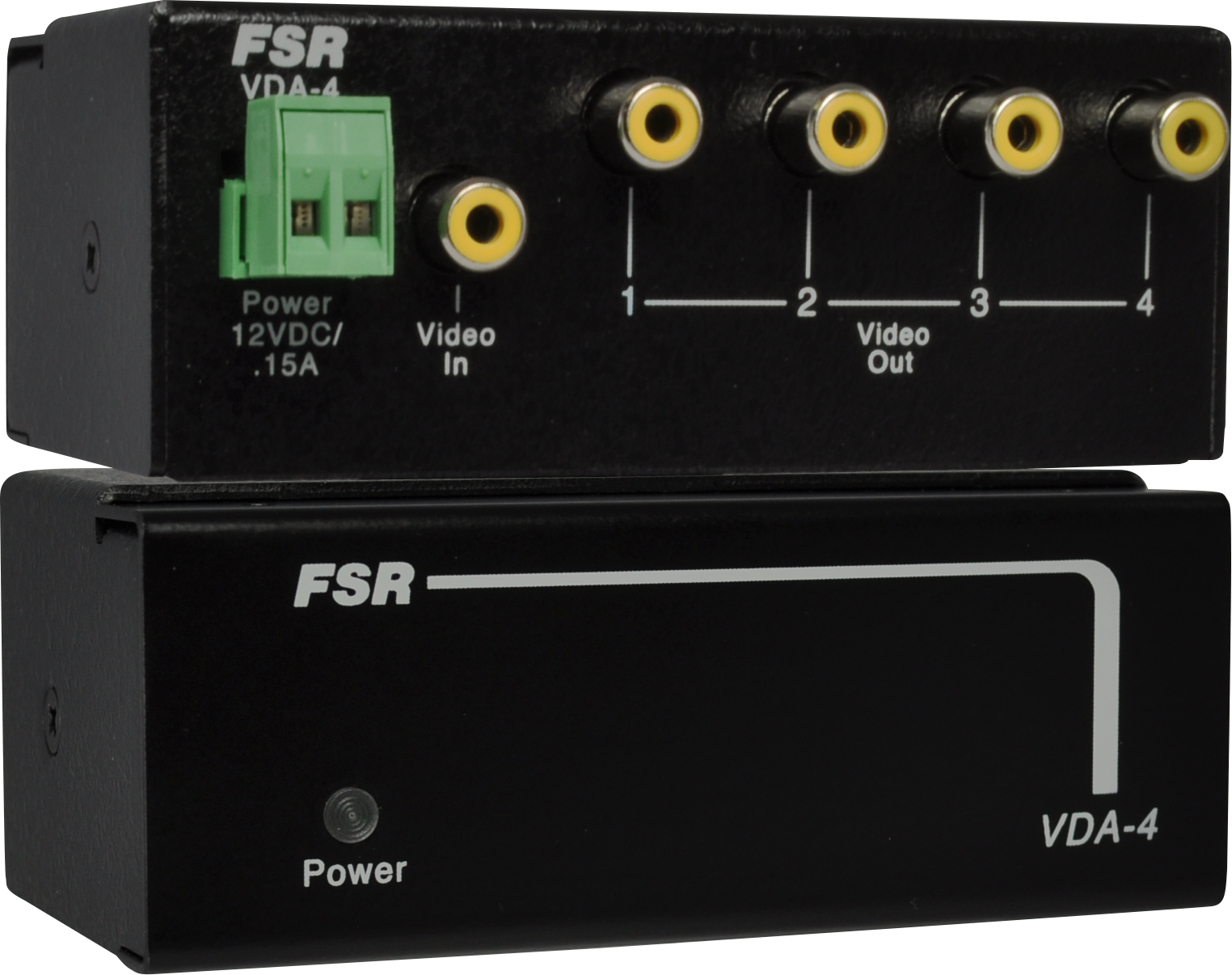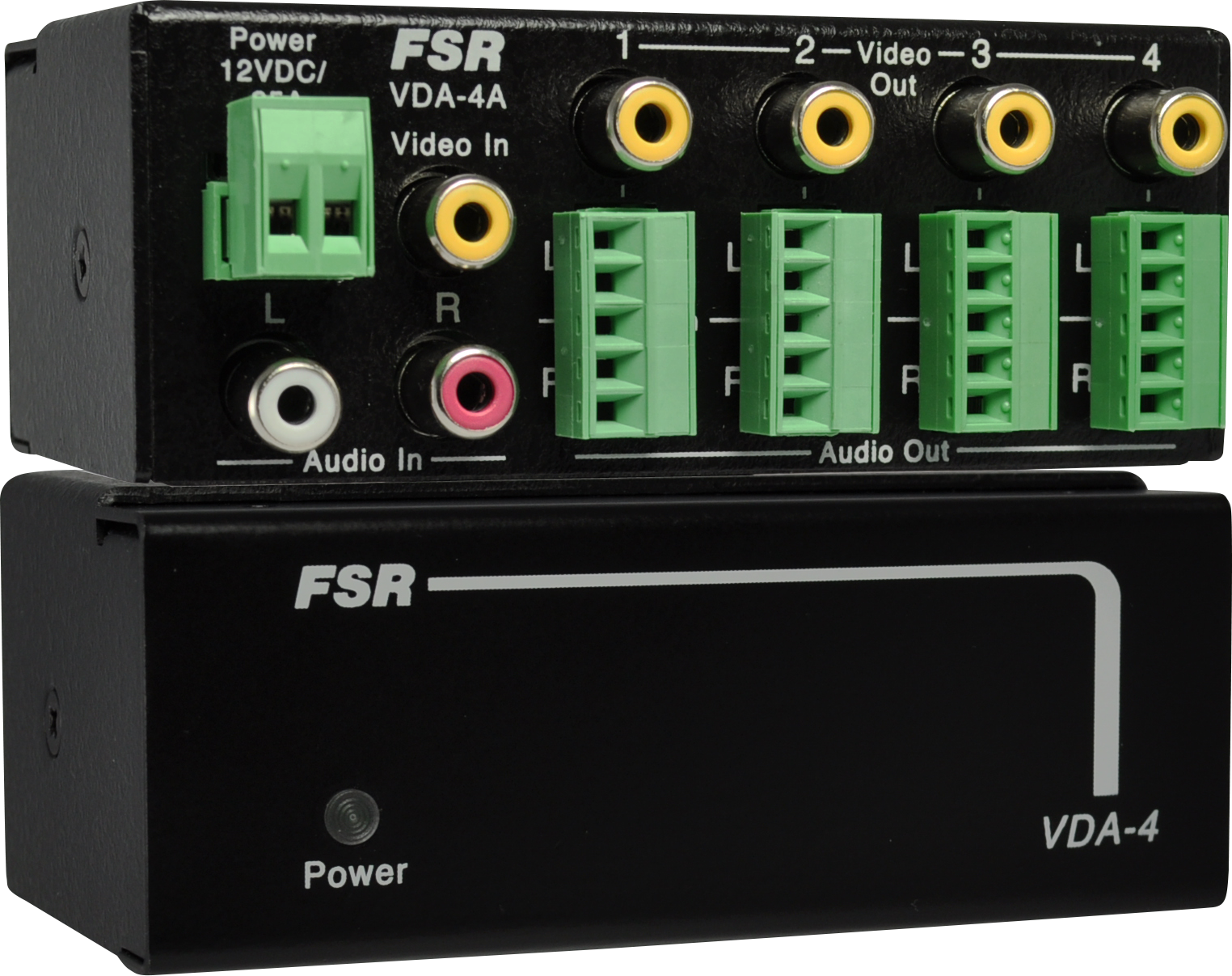 The VDA-4 and VDA-4A 1x4 Distribution Amplifiers provide a convenient method to distribute one composite video and one line level stereo audio signals (VDA-4A) to four AV output devices such as projectors, monitors and audio amps (VDA-4A). Both models will split any NTSC, PAL or SECAM input signal and individually buffer the four video outputs.