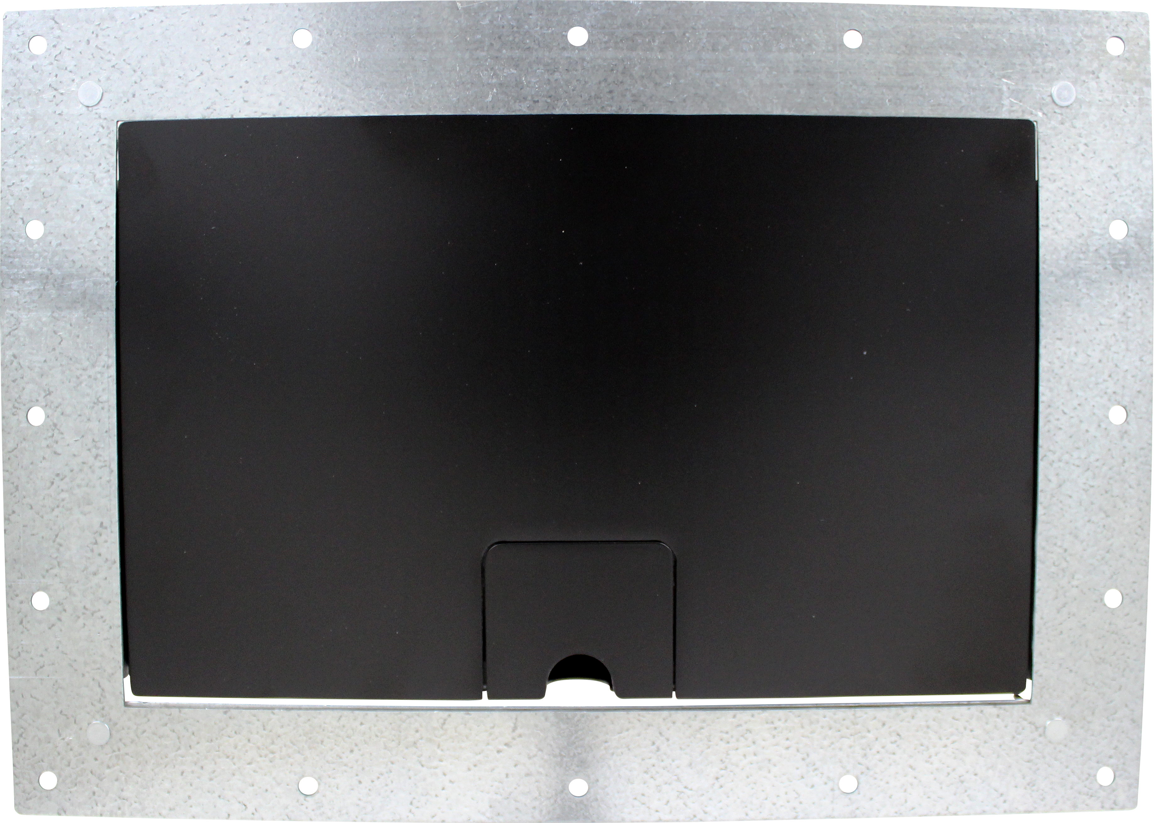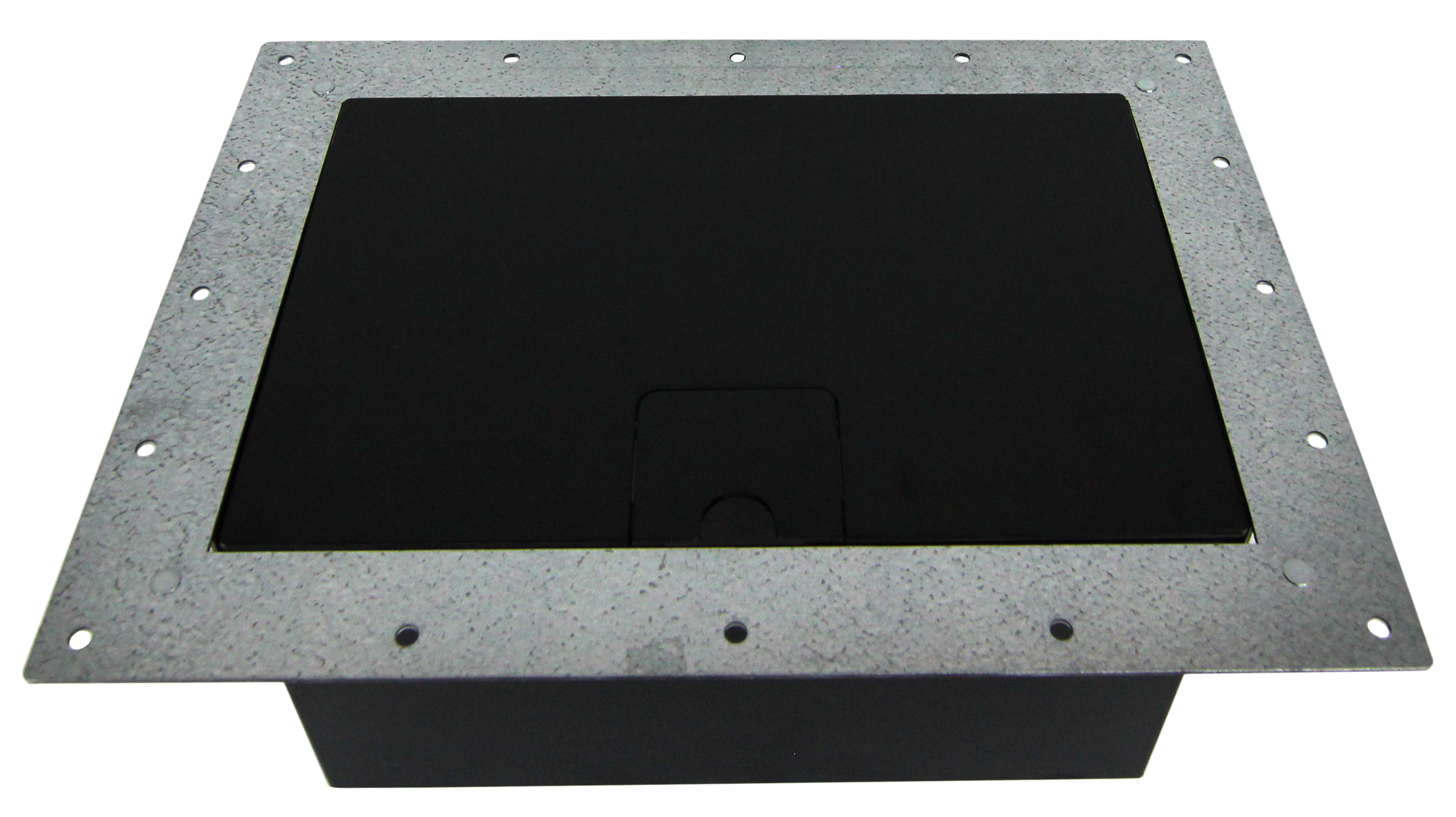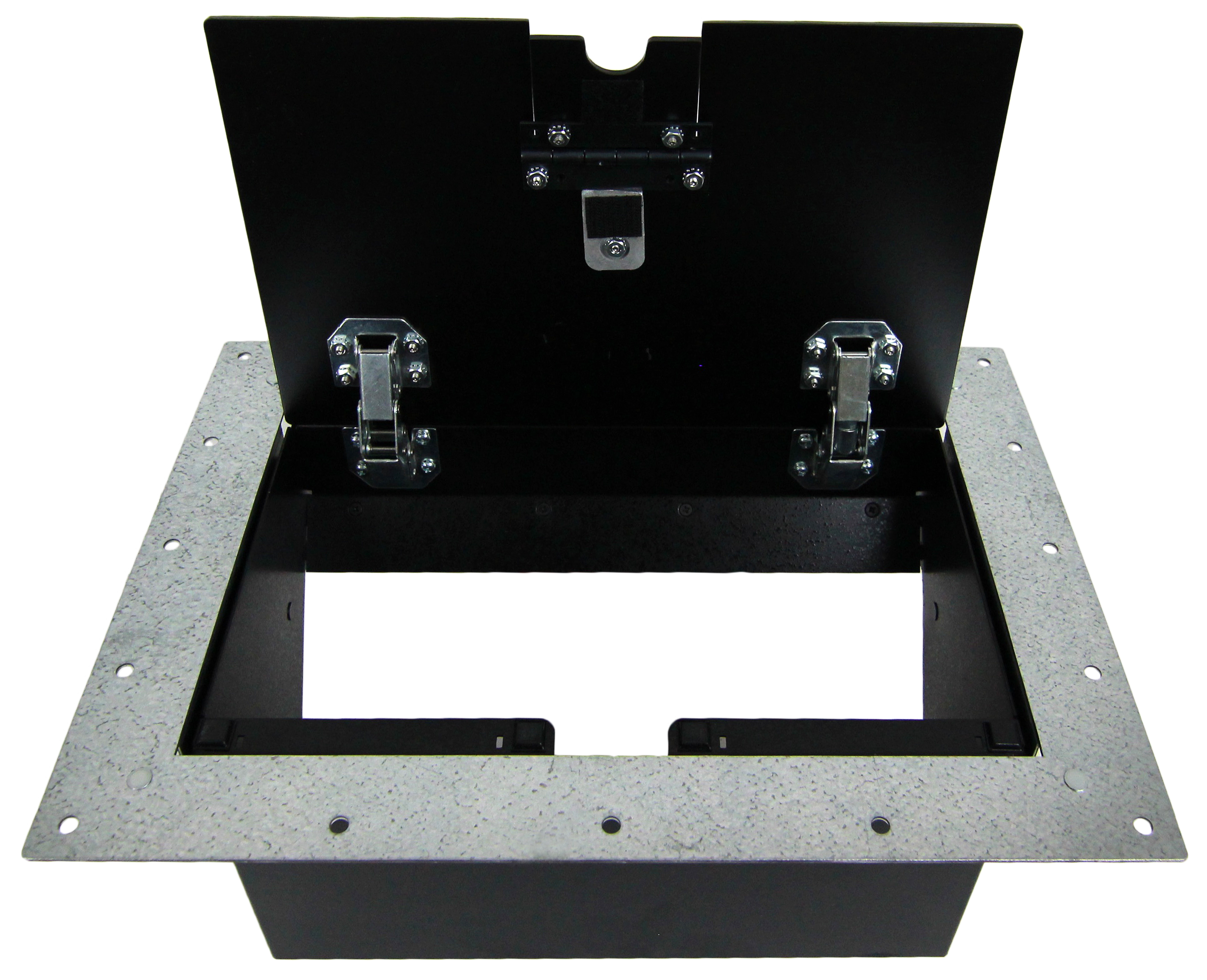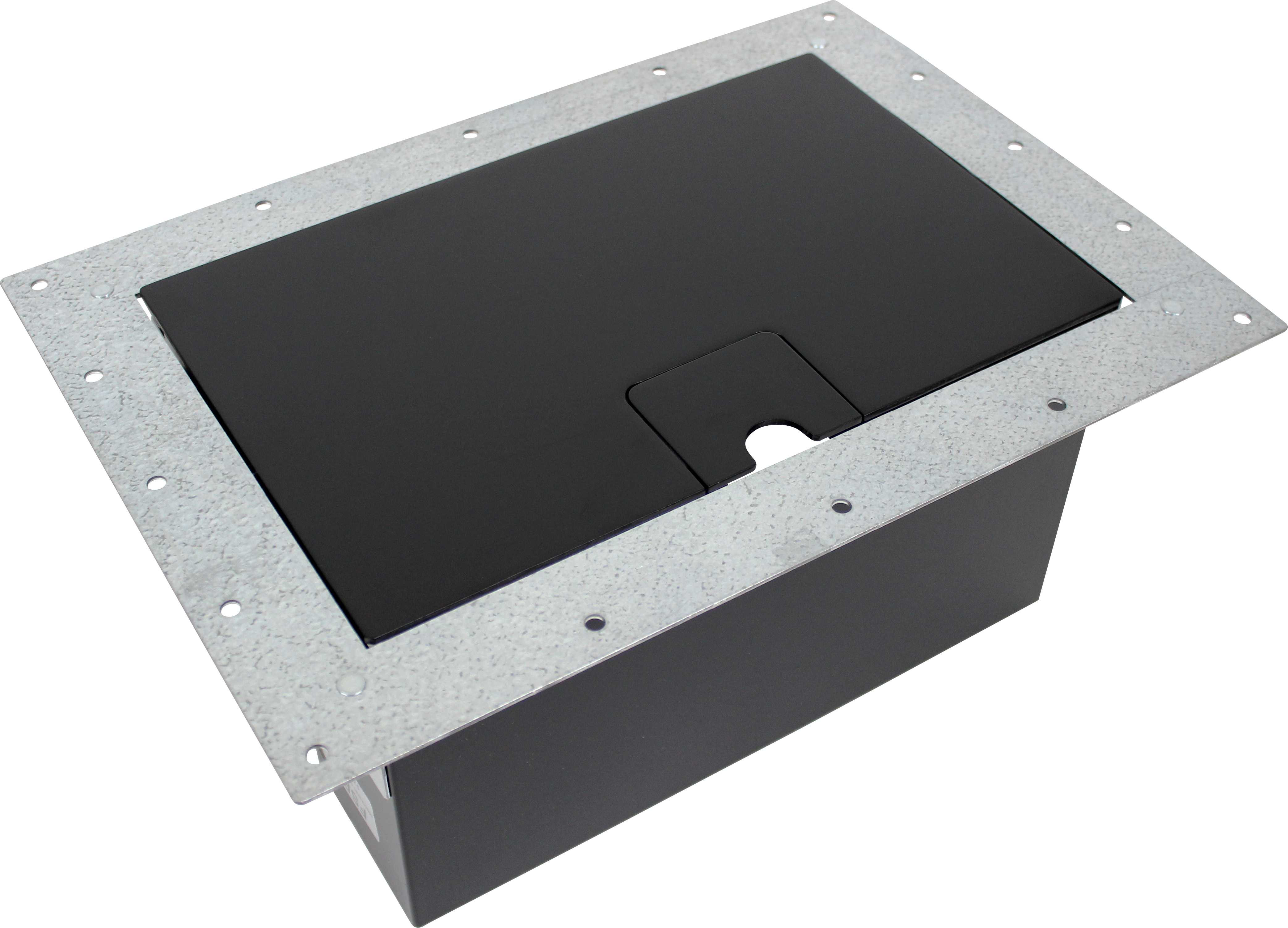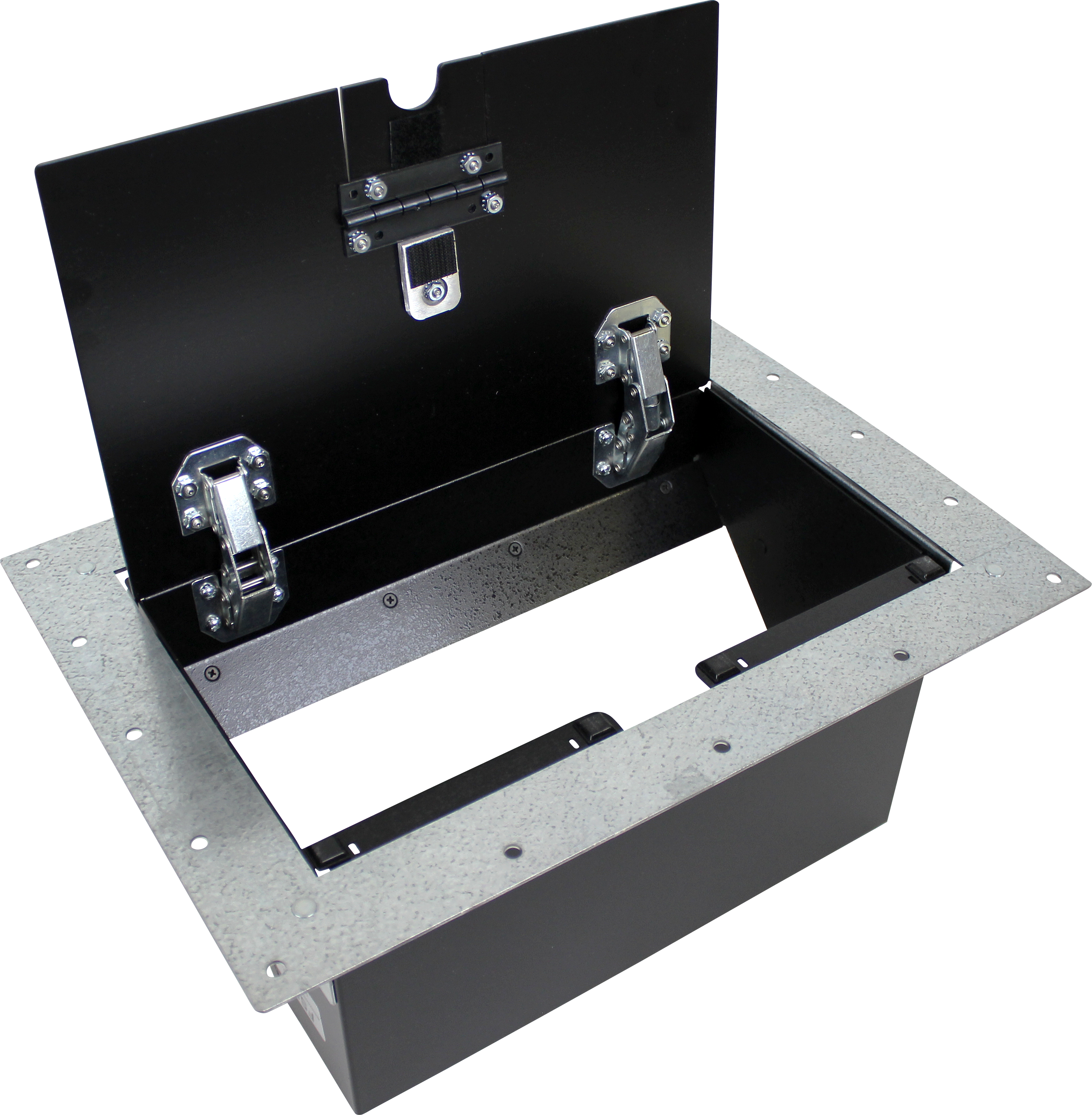 The cover offers a finger lift with fold back cable access. The highest quality latches, plungers, and construction have been utilized. The hinges and latches are familiar to wood workers, allowing them to install the TB series with familiar parts. The table boxes have provisions for mounting standard electrical back boxes. Each trade can provide their own back box and wall plate as needed. The back boxes then slide into the clamps on the table box in any order. An adjustable mounting frame on the table box allows for a perfect install.