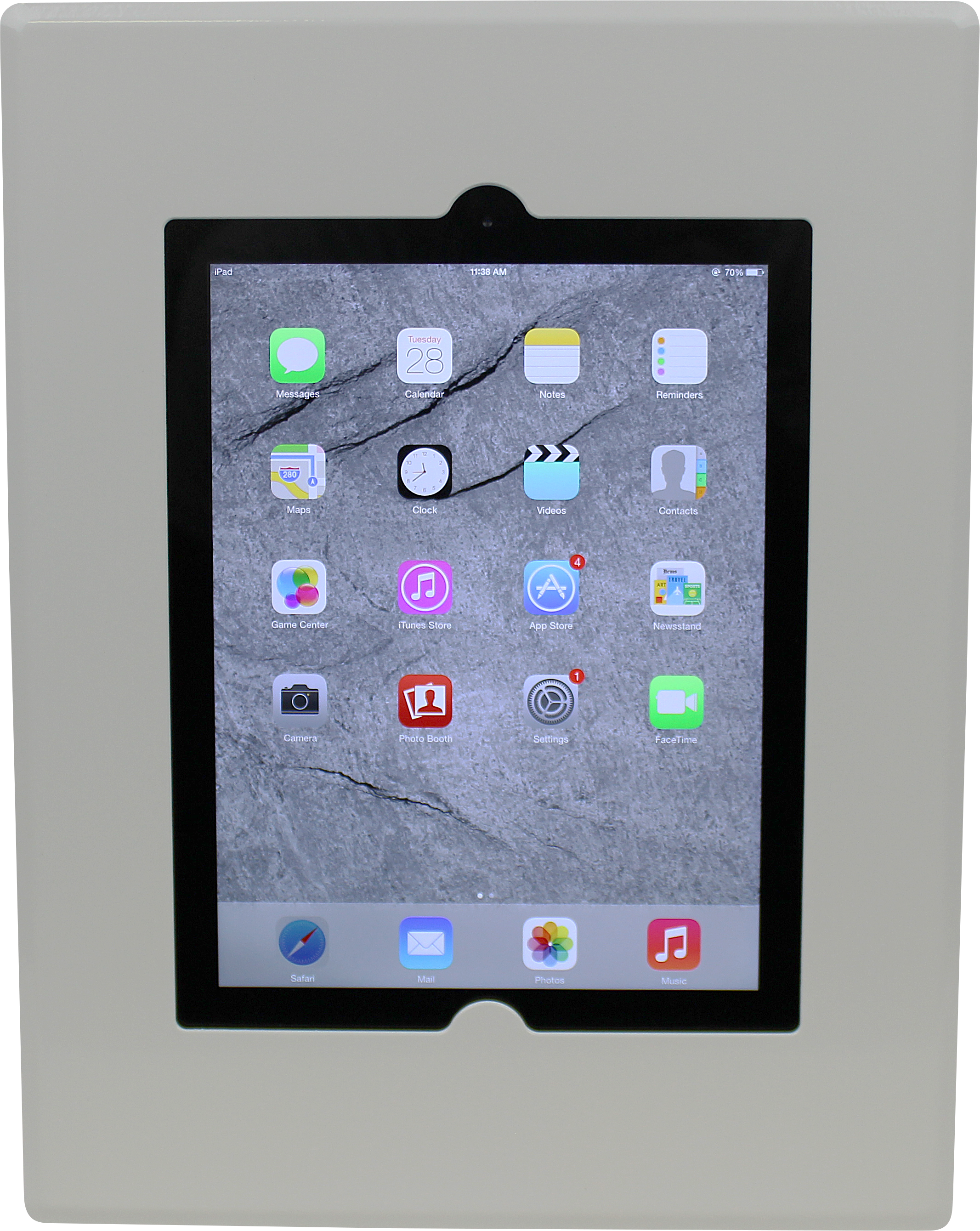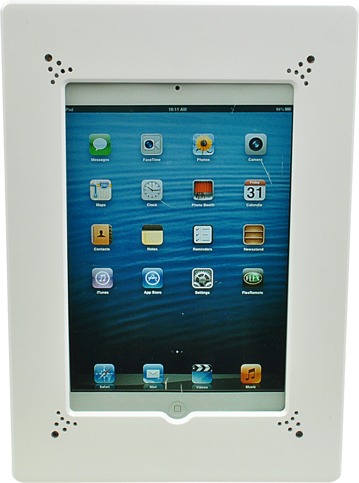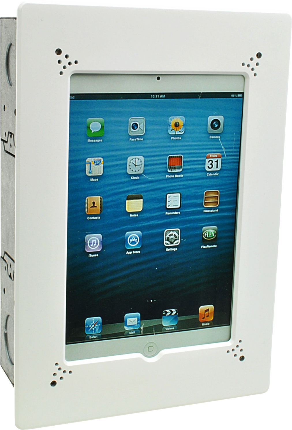 The WE-FMIPDairNB-WHT flush mount enclosure for the iPad Air has no button and is perfect for new construction or installations where housing the iPad within the wall is desired. The enclosure mounts within a standard 3” or 4” wall and houses the iPad in either the portrait or landscape position. The cover can be ordered with or without access to the Home button and camera to support the specific needs of the installation.