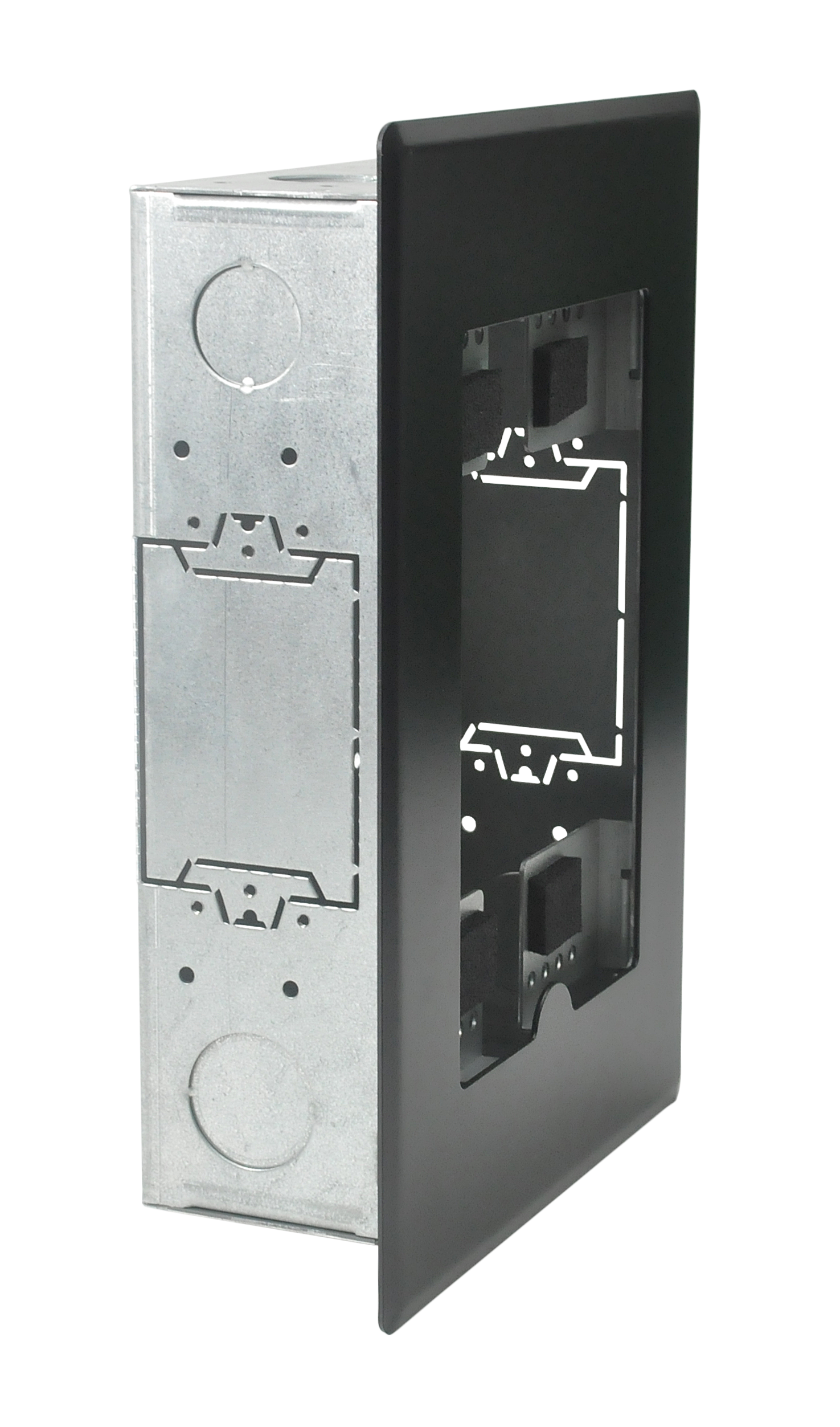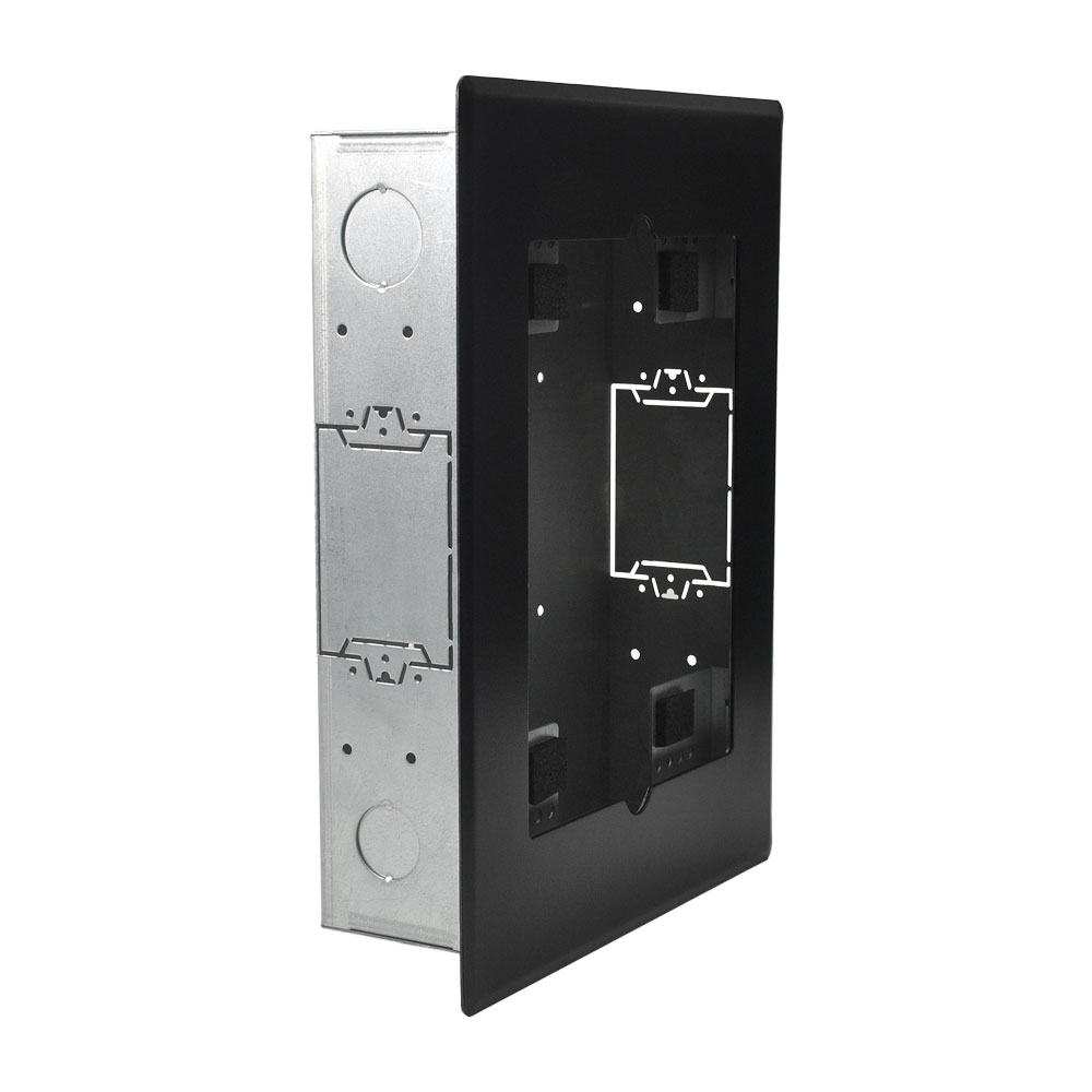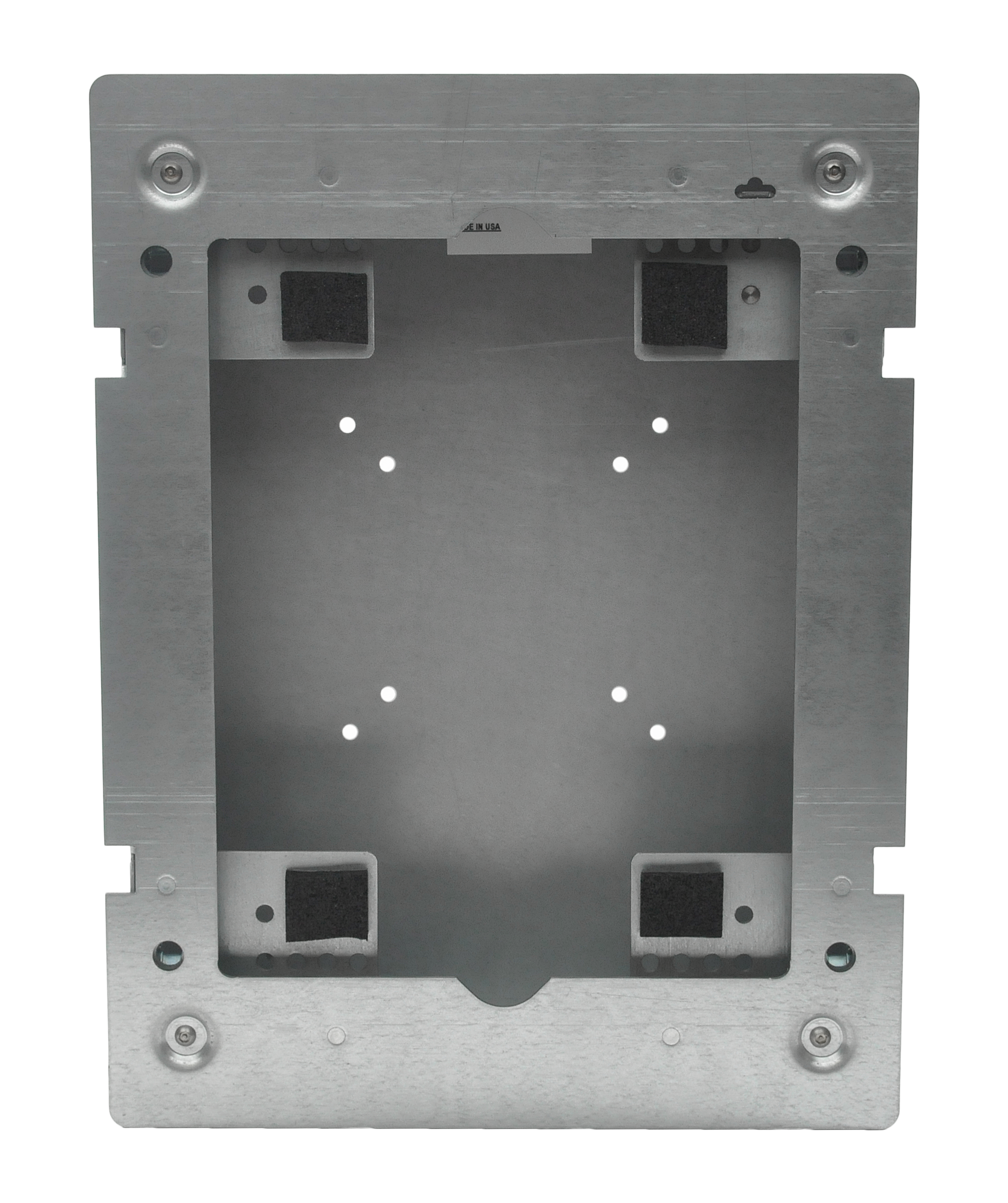 The WE-FMIPDmini-BLK flush mount mini enclosure is perfect for new construction or installations where housing the iPad within the wall is desired. The enclosure mounts within a standard 3” or 4” wall and houses the iPad in either the portrait or landscape position. The cover can be ordered with or without access to the Home button and camera to support the specific needs of the installation.