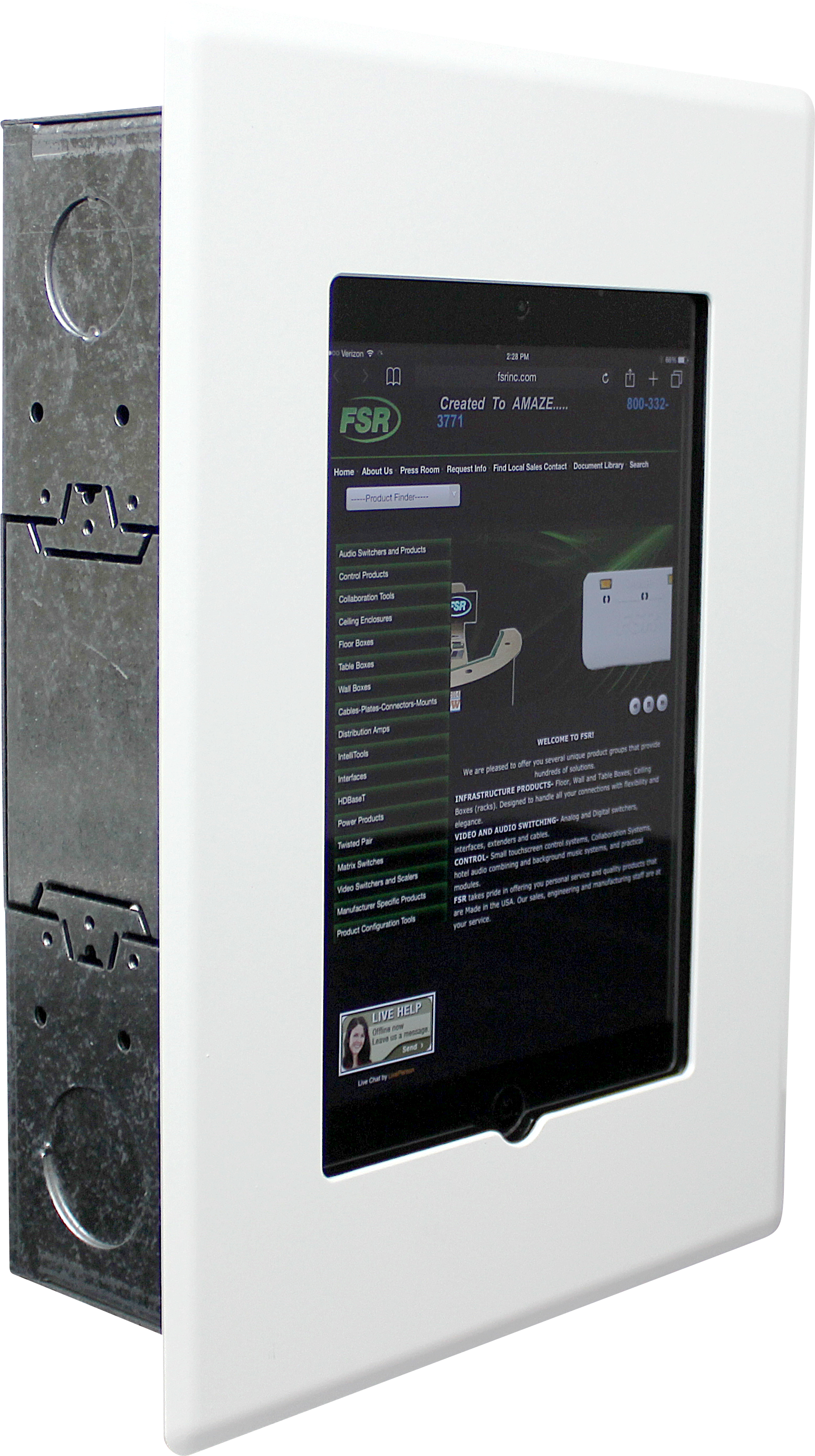 The enclosure has a space to hold FSR’s patented PoE to USB charger. This charger provides a full 10 watts of iPad compatible power to ensure uninterrupted operation. The flush mount enclosure is available in white or black finish. See Spec Sheet for iPad Compatability.
