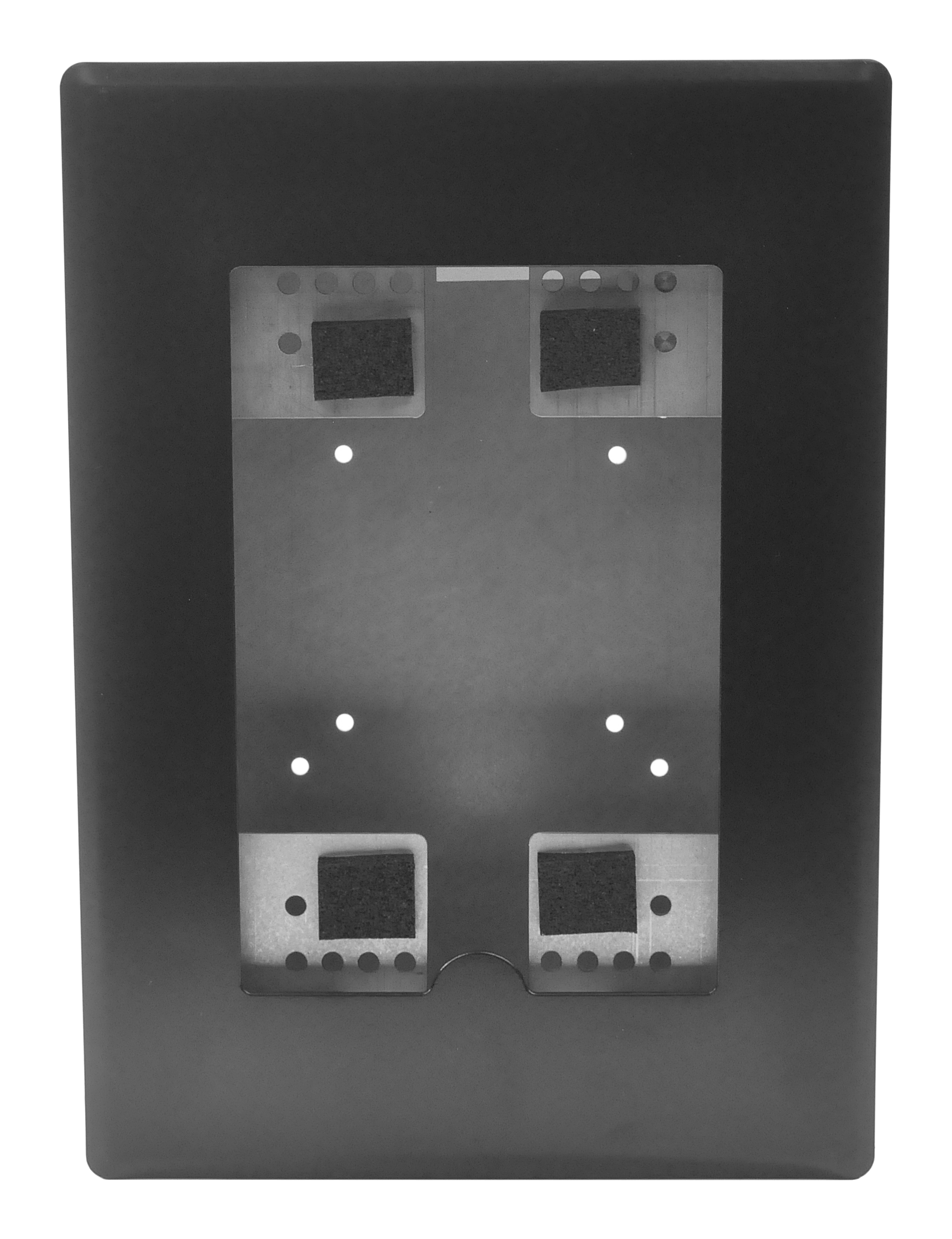 The WE-FMIPDminiNB-BLK flush mount mini enclosure has no button and is perfect for new construction or installations where housing the iPad within the wall is desired. The enclosure mounts within a standard 3” or 4” wall and houses the iPad in either the portrait or landscape position. The cover can be ordered with or without access to the Home button and camera to support the specific needs of the installation.
