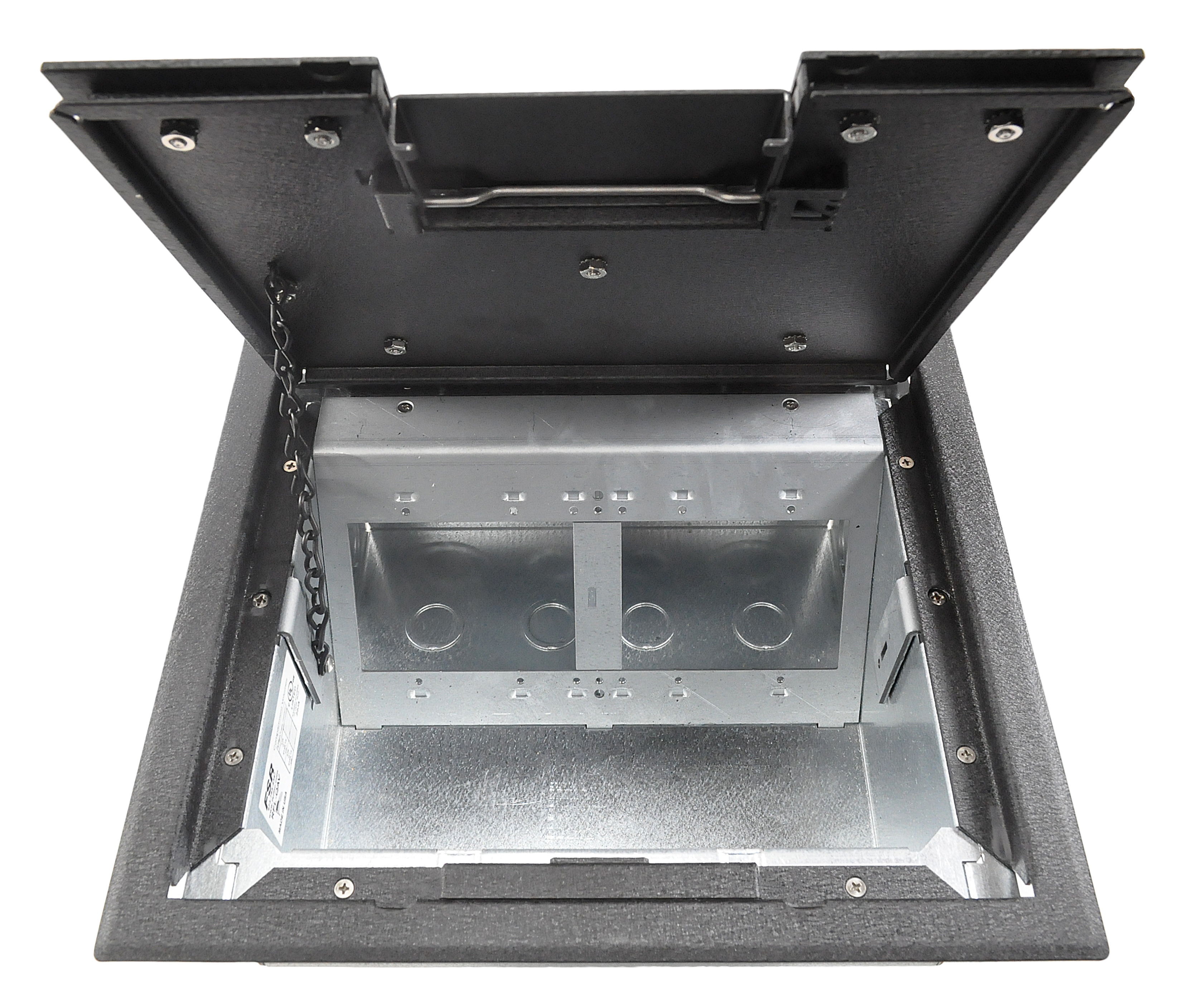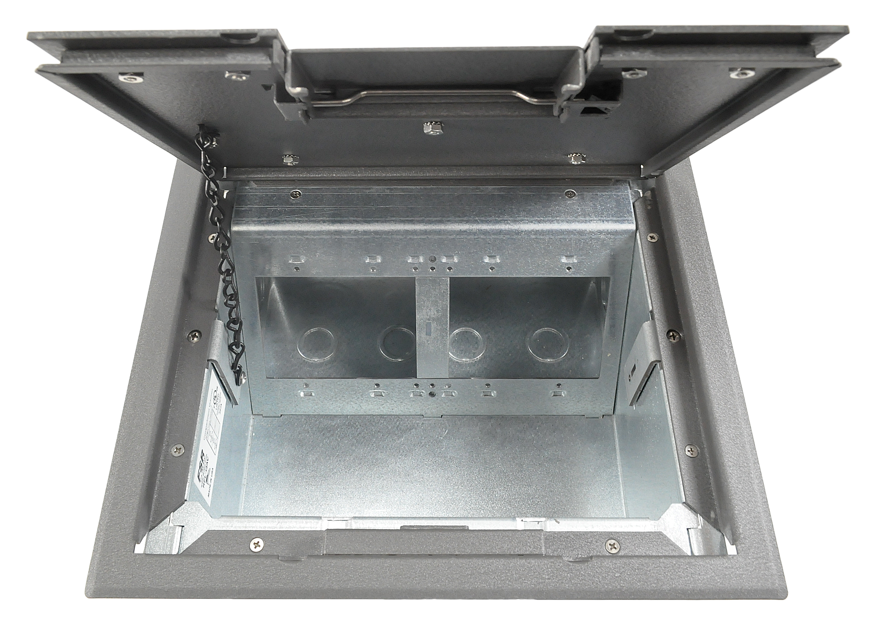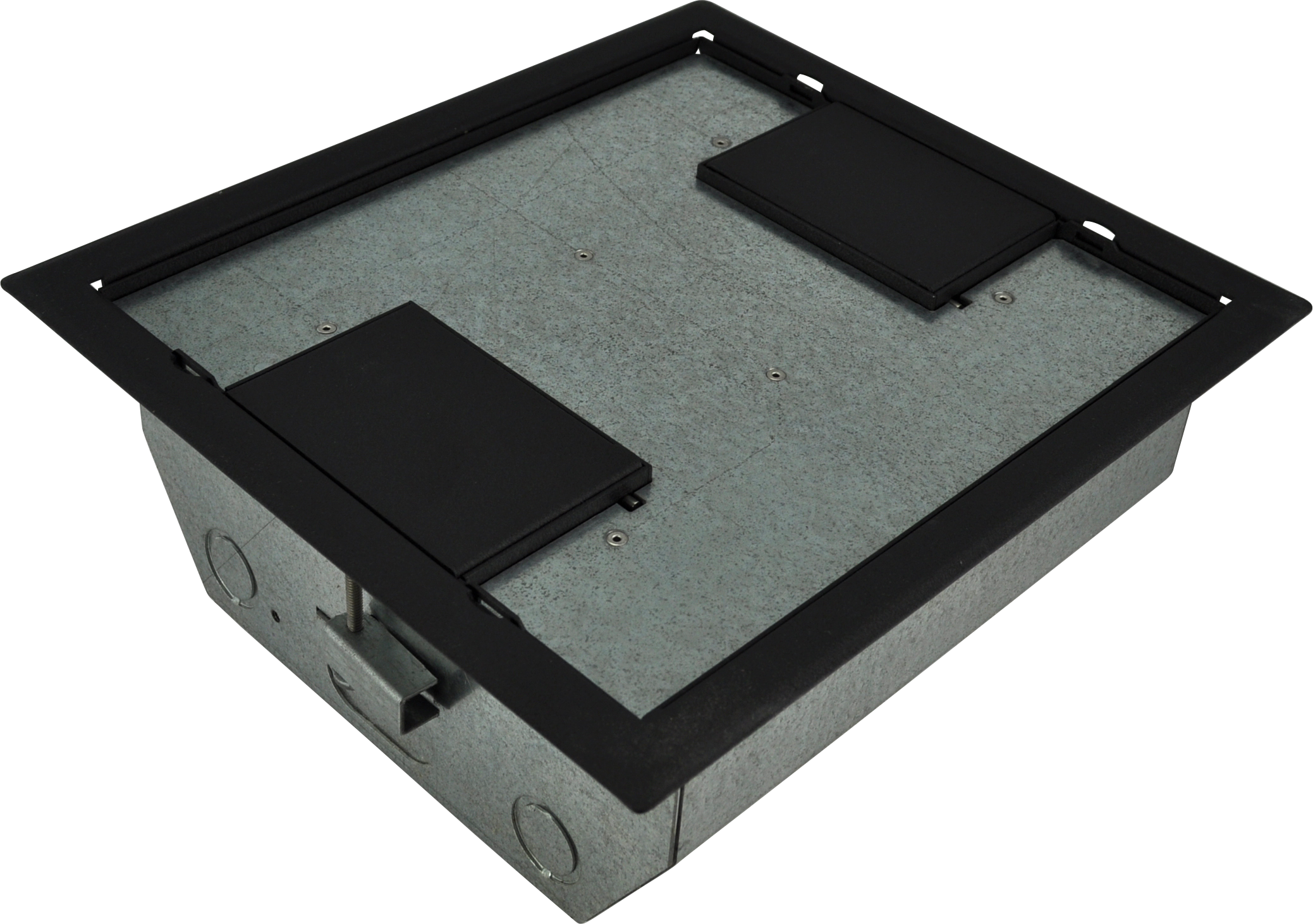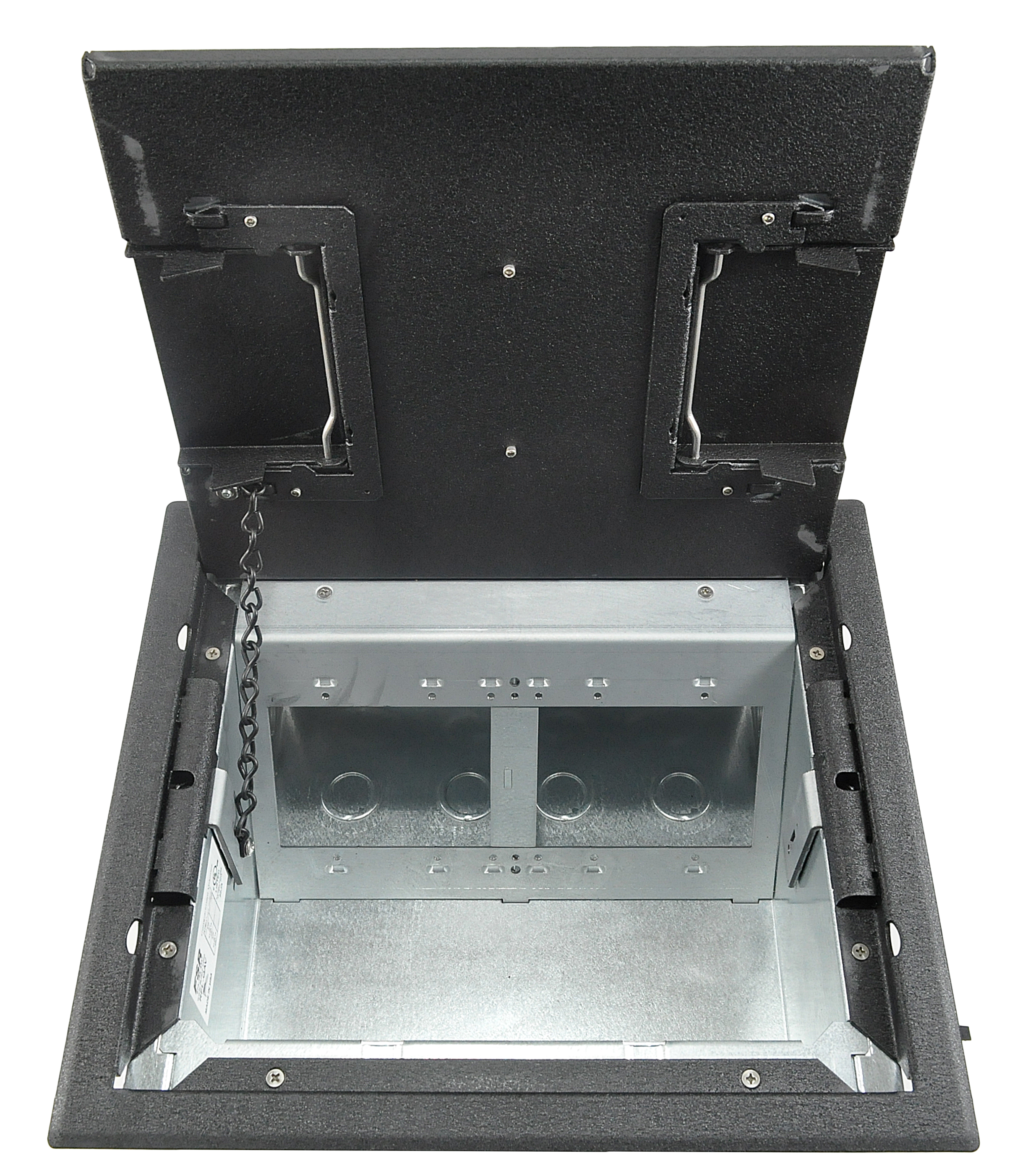 • Patented epoxy wrinkle powder finish, available in 3 colors • Choice of three cover styles; solid, single-door and dual-door • 14-gauge steel construction • Cover thickness 3⁄16" • Oversize cable door(s) • Standard electrical plate openings on all models • Superior mounting clamp design to handle a wide variety of floor thicknesses • Listed by UL to meet US and Canadian safety standards • Large multi-compartment boxes for power, audio, video, data and more! • Multiple knockouts in a variety of sizes • Choice of two box depths • Choice of three gang layout styles