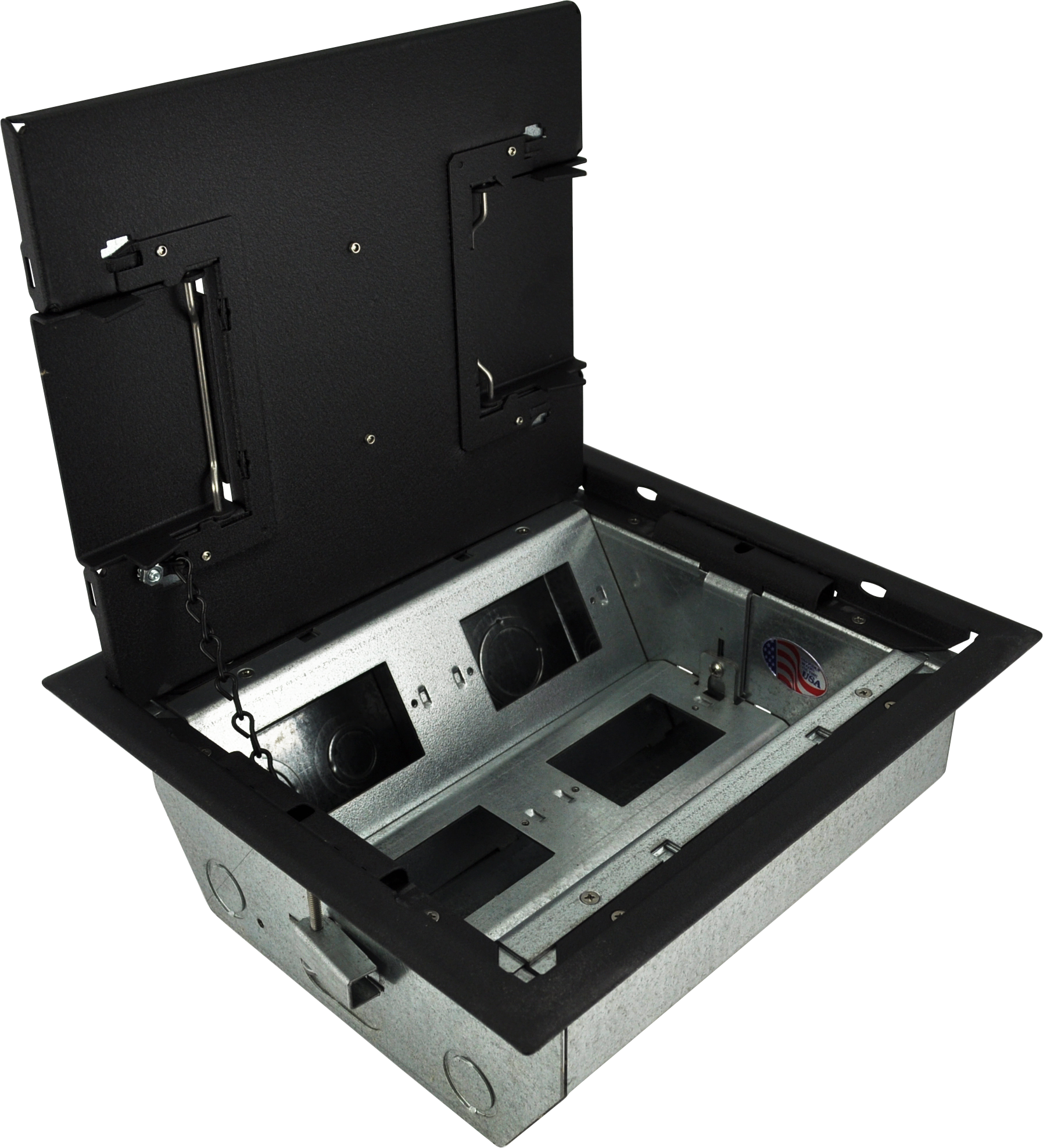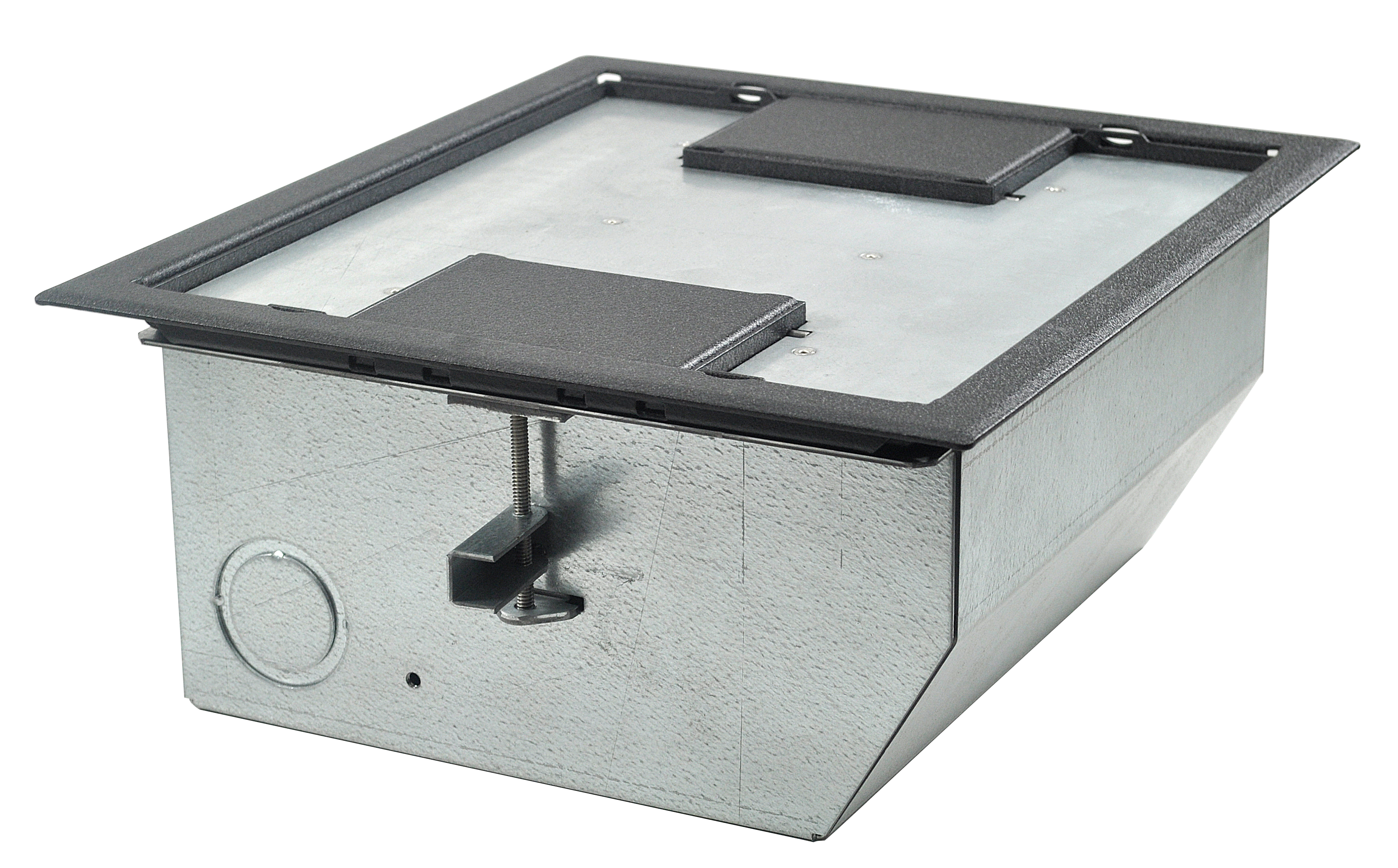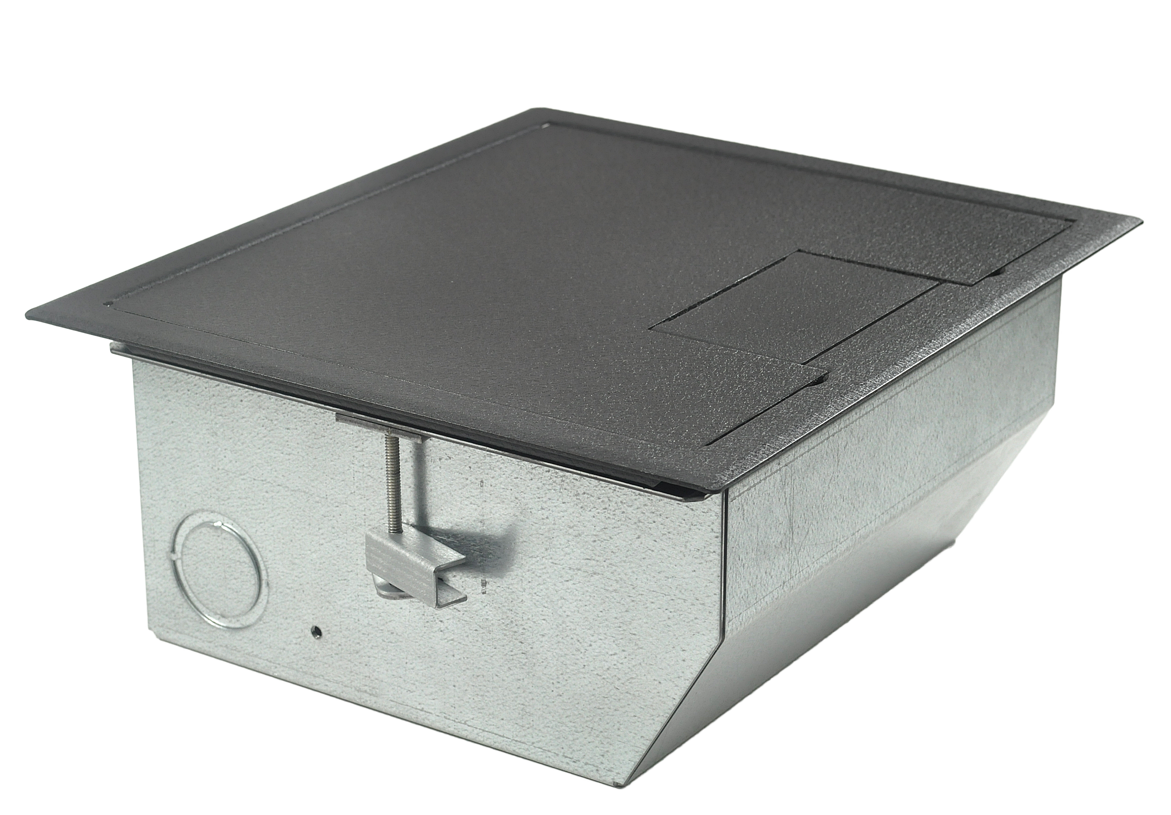 • Patented epoxy wrinkle powder finish, available in 3 colors • Choice of three cover styles; solid, single-door and dual-door • 14-gauge steel construction • Cover thickness 3⁄16" • Oversize cable door(s) • Standard electrical plate openings on all models • Superior mounting clamp design to handle a wide variety of floor thicknesses • Listed by UL to meet US and Canadian safety standards • Large multi-compartment boxes for power, audio, video, data and more! • Multiple knockouts in a variety of sizes • Choice of two box depths • Choice of three gang layout styles