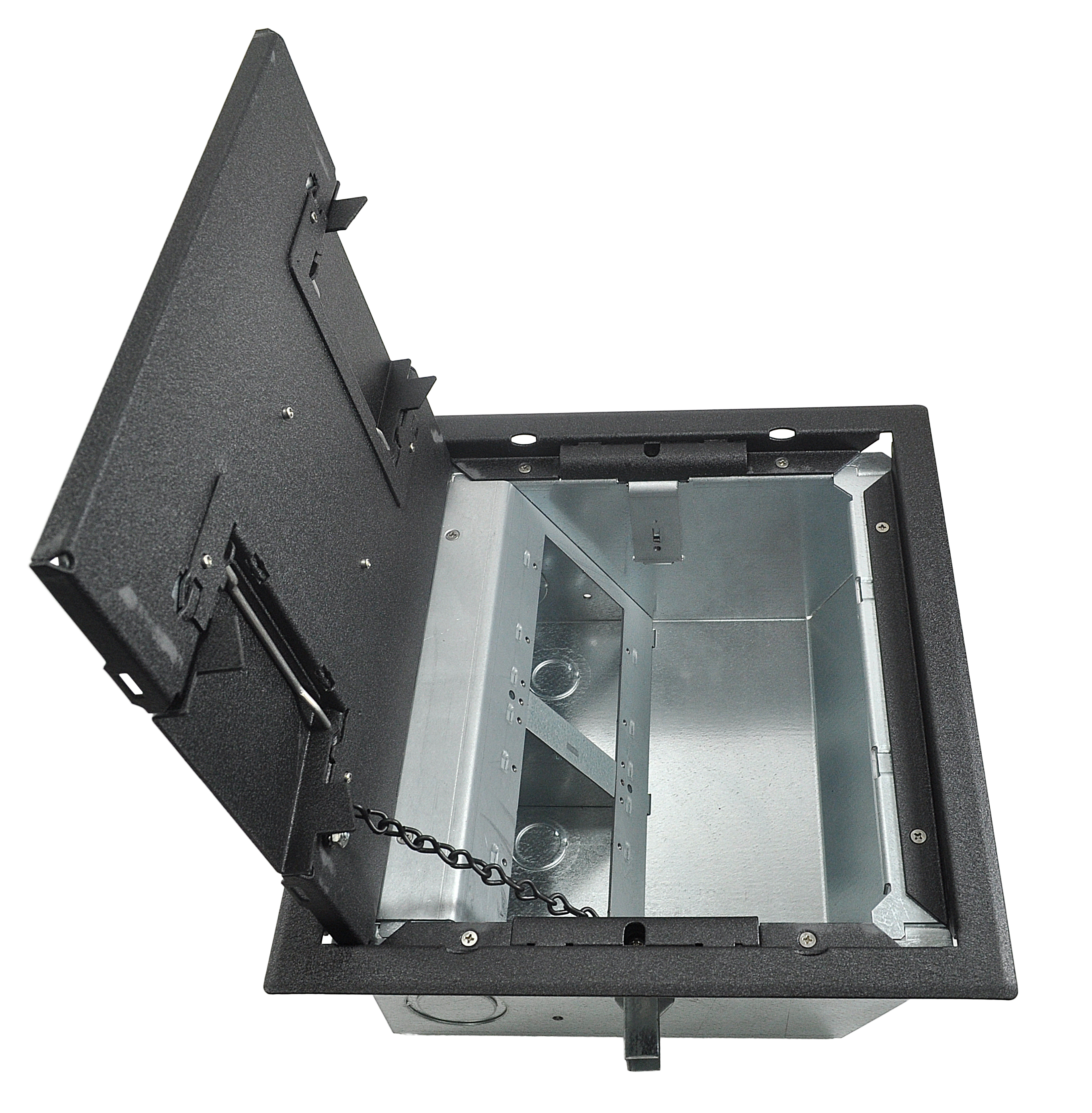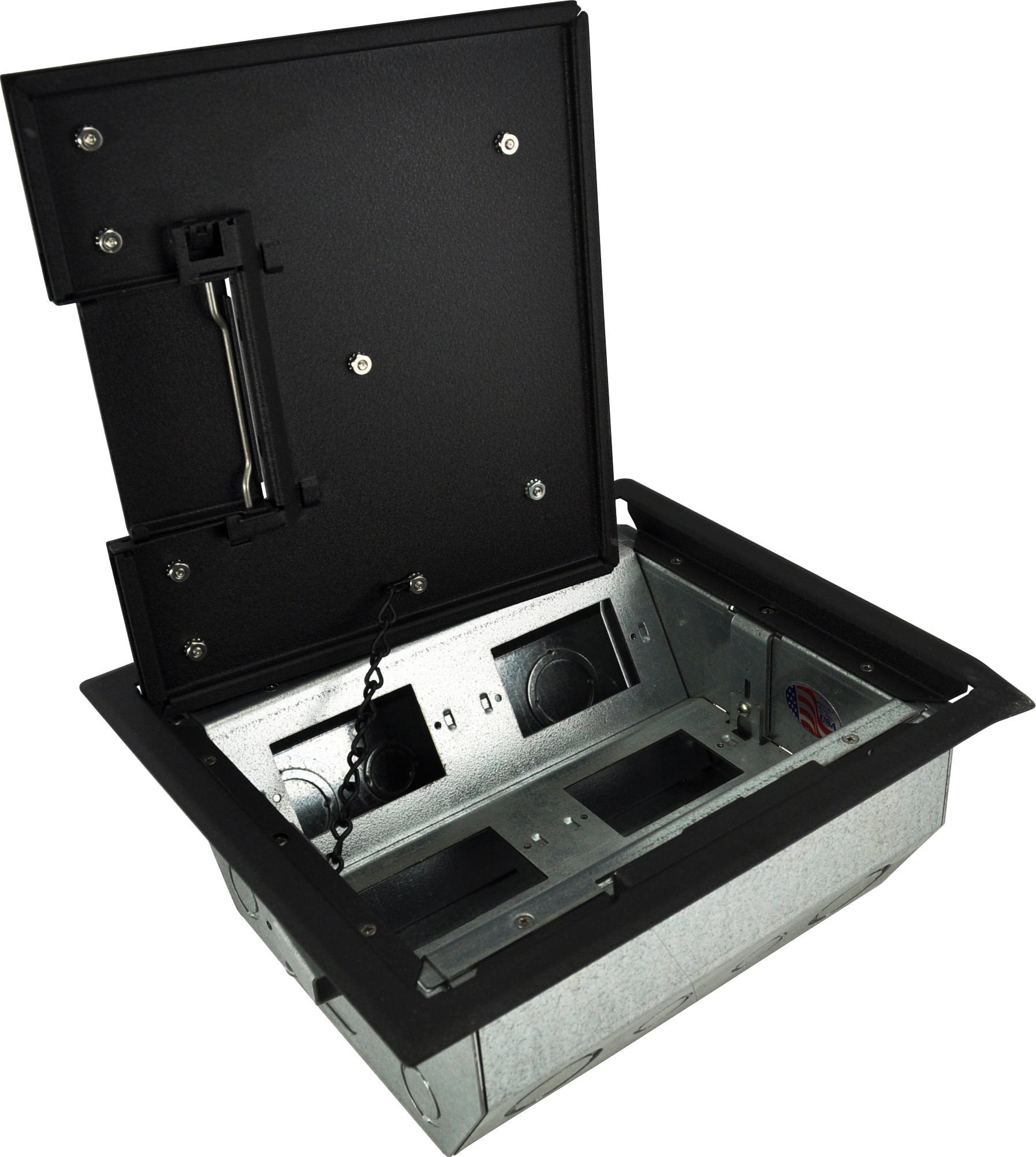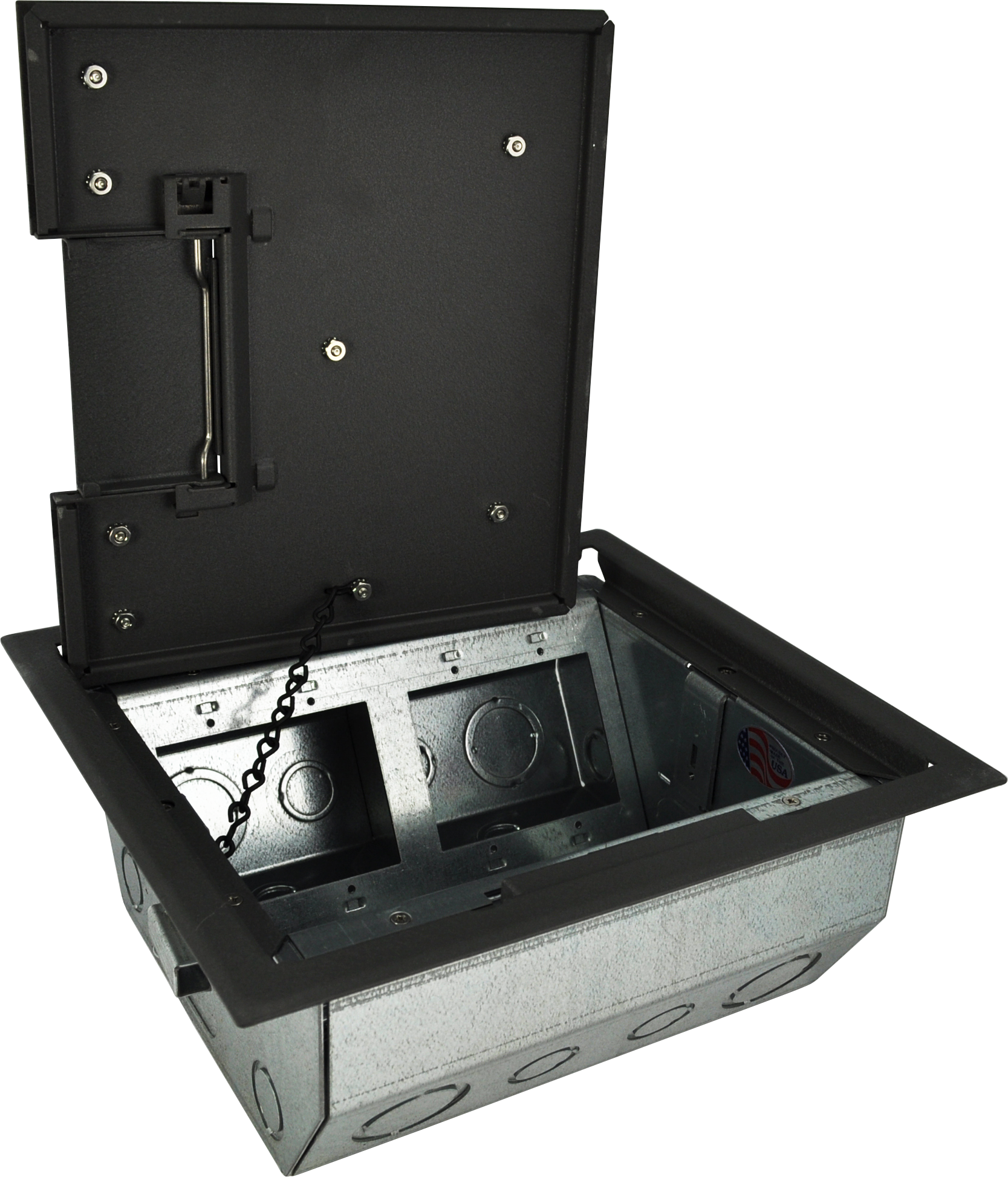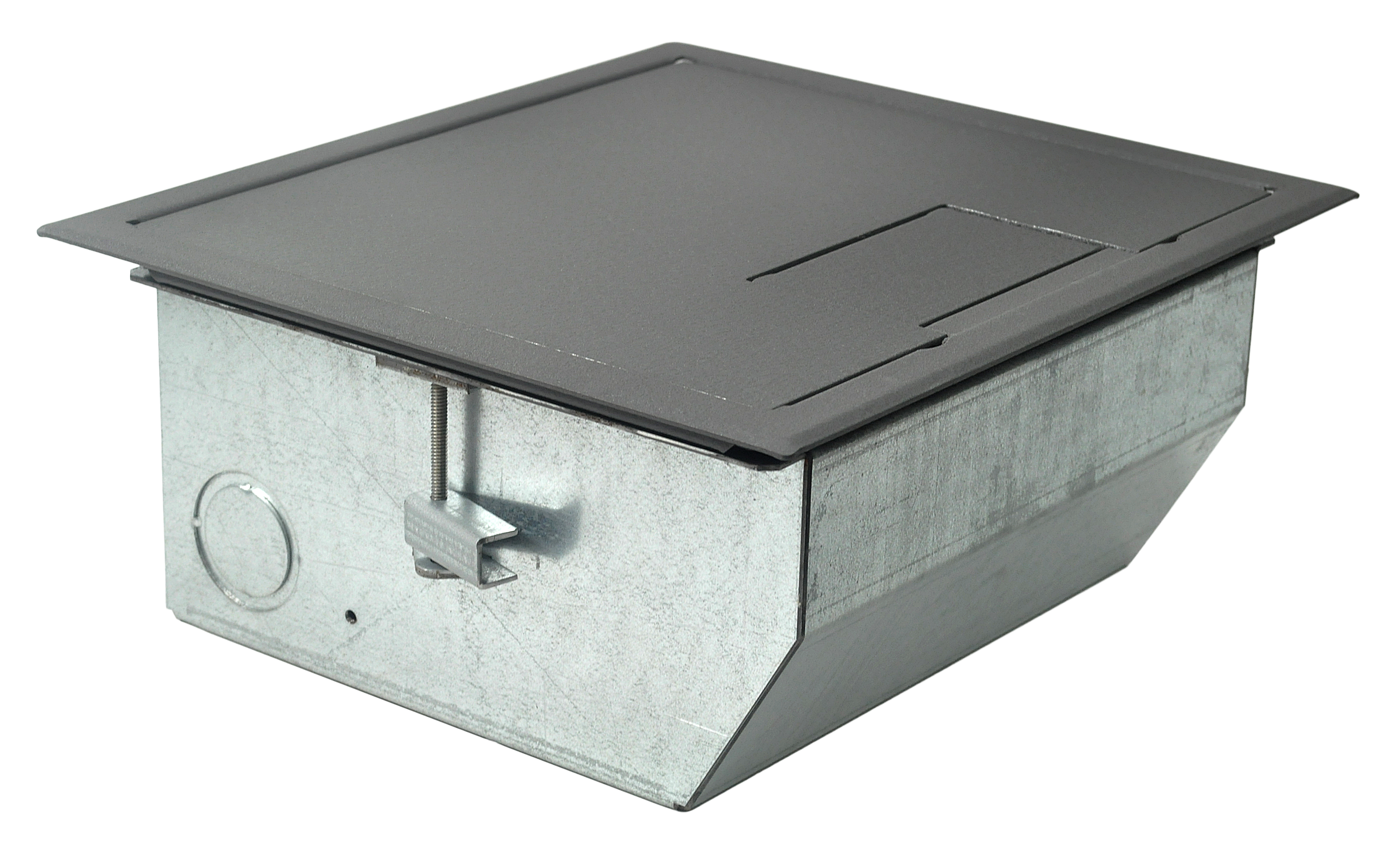 • Patented epoxy wrinkle powder finish, available in 3 colors • Choice of three cover styles; solid, single-door and dual-door • 14-gauge steel construction • Cover thickness 3⁄16" • Oversize cable door(s) • Standard electrical plate openings on all models • Superior mounting clamp design to handle a wide variety of floor thicknesses • Listed by UL to meet US and Canadian safety standards • Large multi-compartment boxes for power, audio, video, data and more! • Multiple knockouts in a variety of sizes • Choice of two box depths • Choice of three gang layout styles