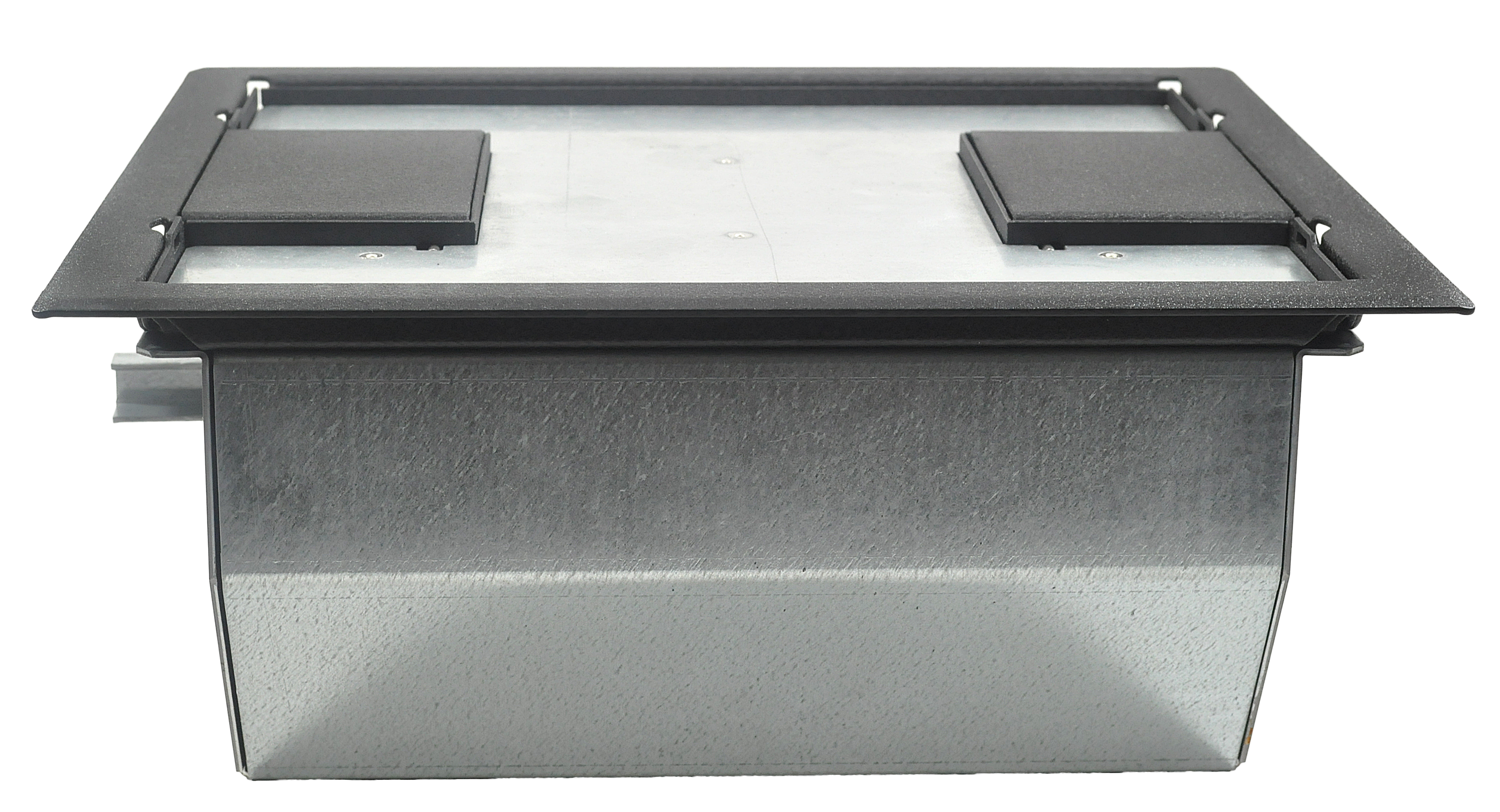 The RFL4.5-Q2G is a 4 11⁄16" deep floor box with four standard double gang openings, two on each side of the box. Either or both of the compartments may be used for power or data.