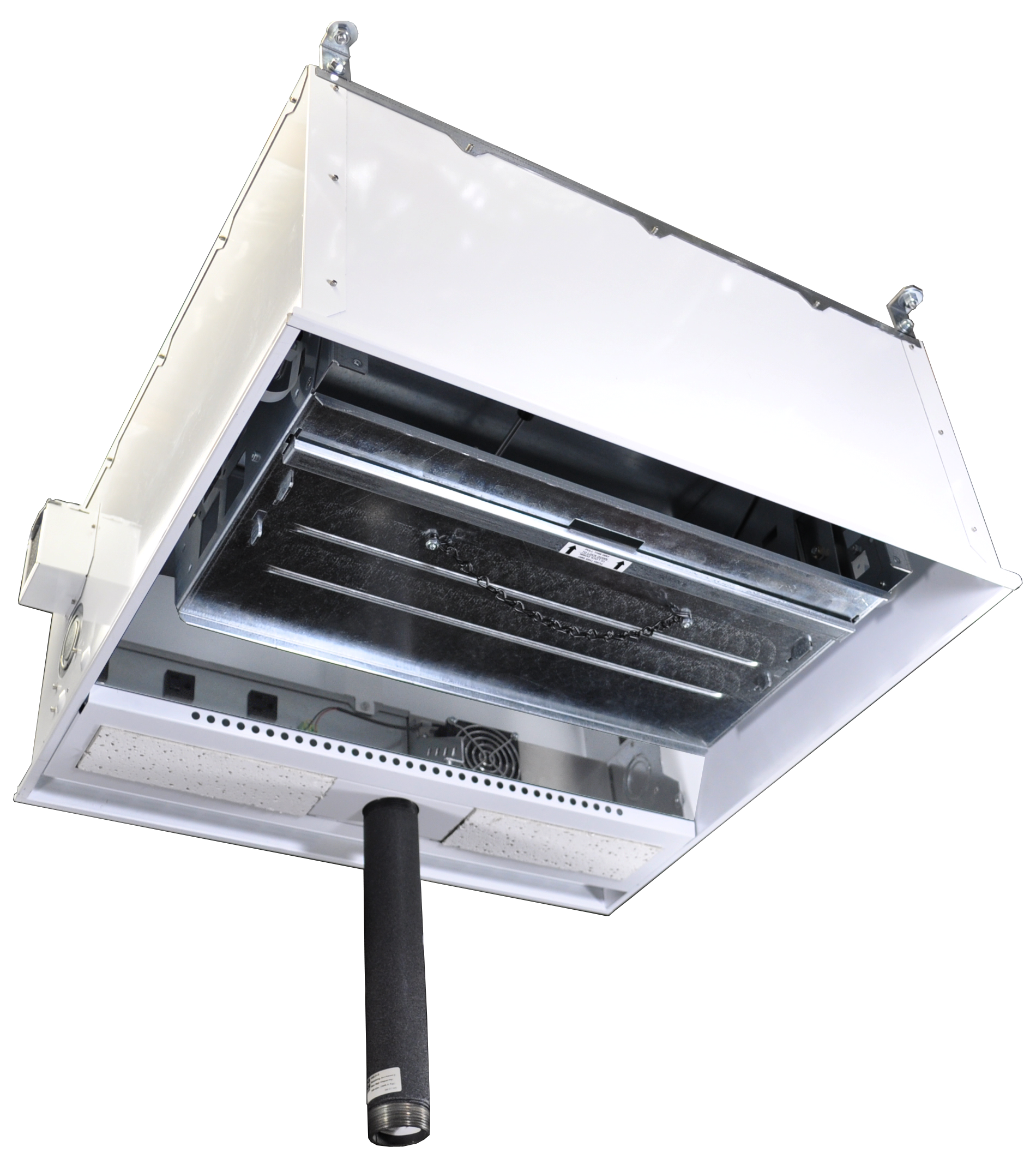 The ‘SP’ option adds an adapter for projector pole mounting, cooling fans and the Smart Power module. The ‘S’ option adds This module allows the power in the box to be either remotely controlled or switched based on the current draw of specific outlets. In this energy saving mode, the power in the box is switched on and off automatically with the projector to conserve power. The pole allows cabling to pass from inside the ceiling box, down the pole and to the projector, providing a nice clean installation.