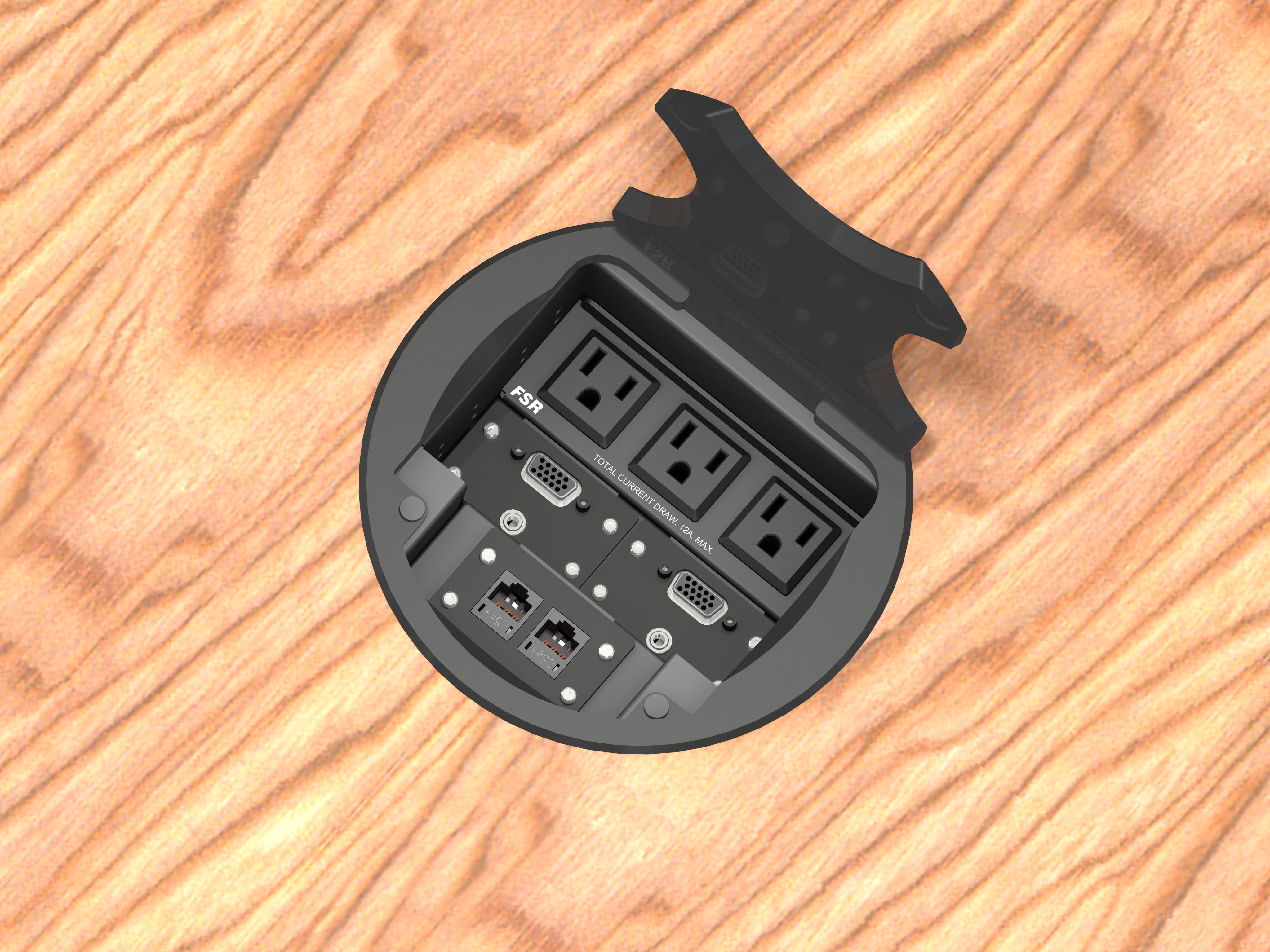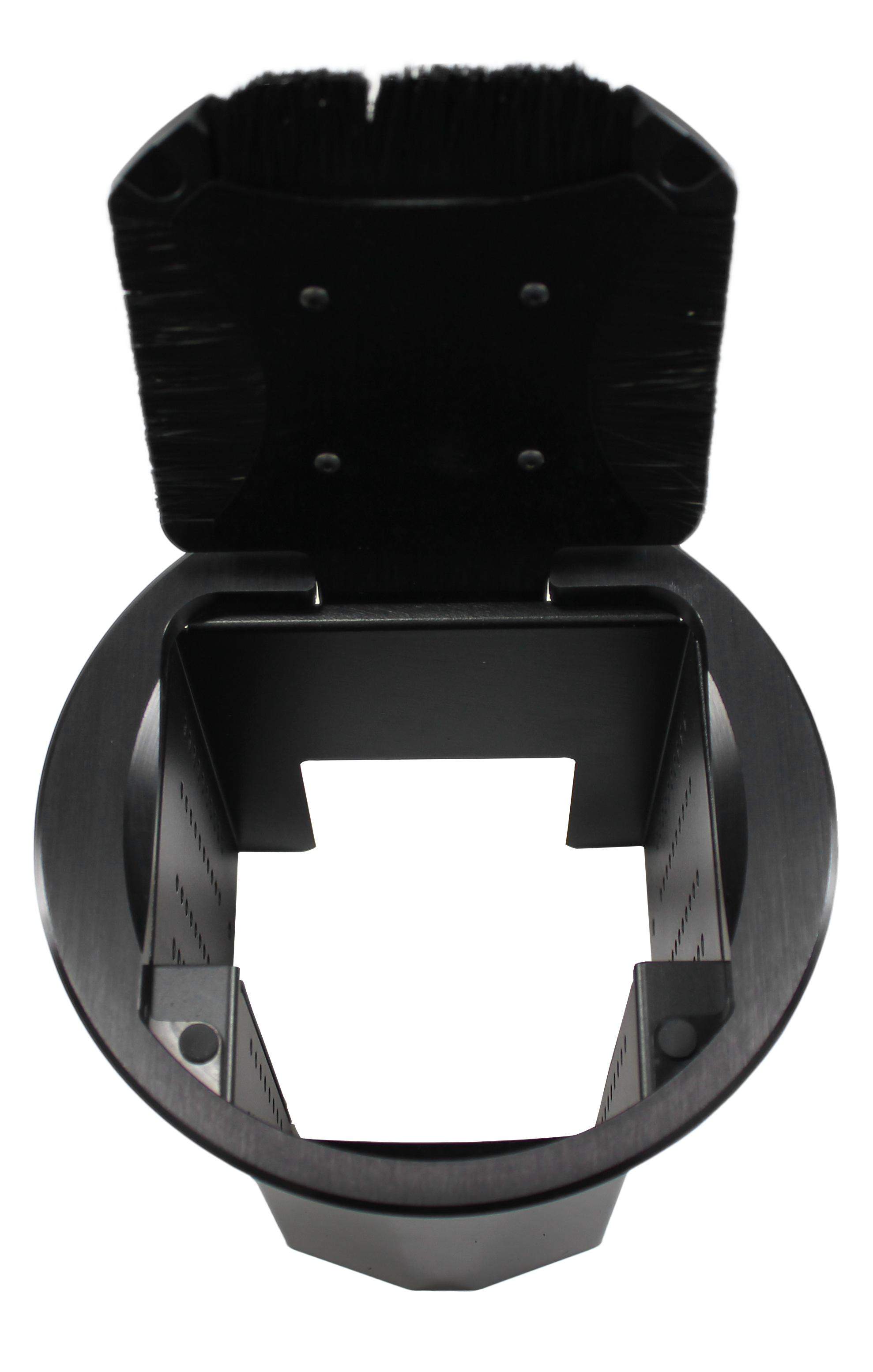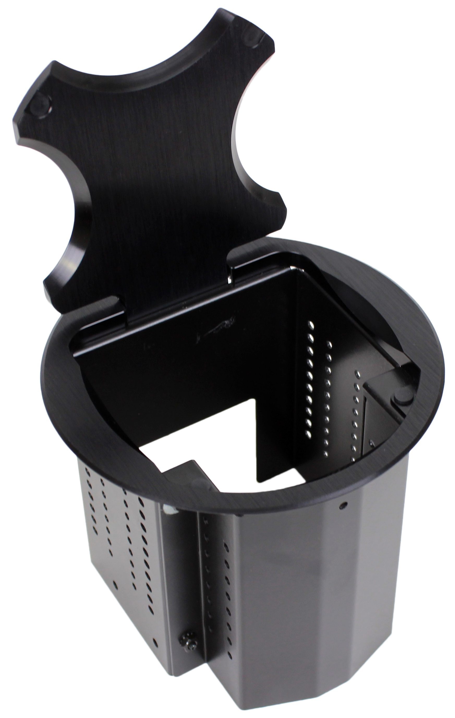 A multi-tiered, plate-stacking arrangement and overall depth adjustment. The cover can be closed while in use with cables exiting through the milled openings. Your choice of AC power cords or hardwired versions. Round covers with a finish of black anodized.