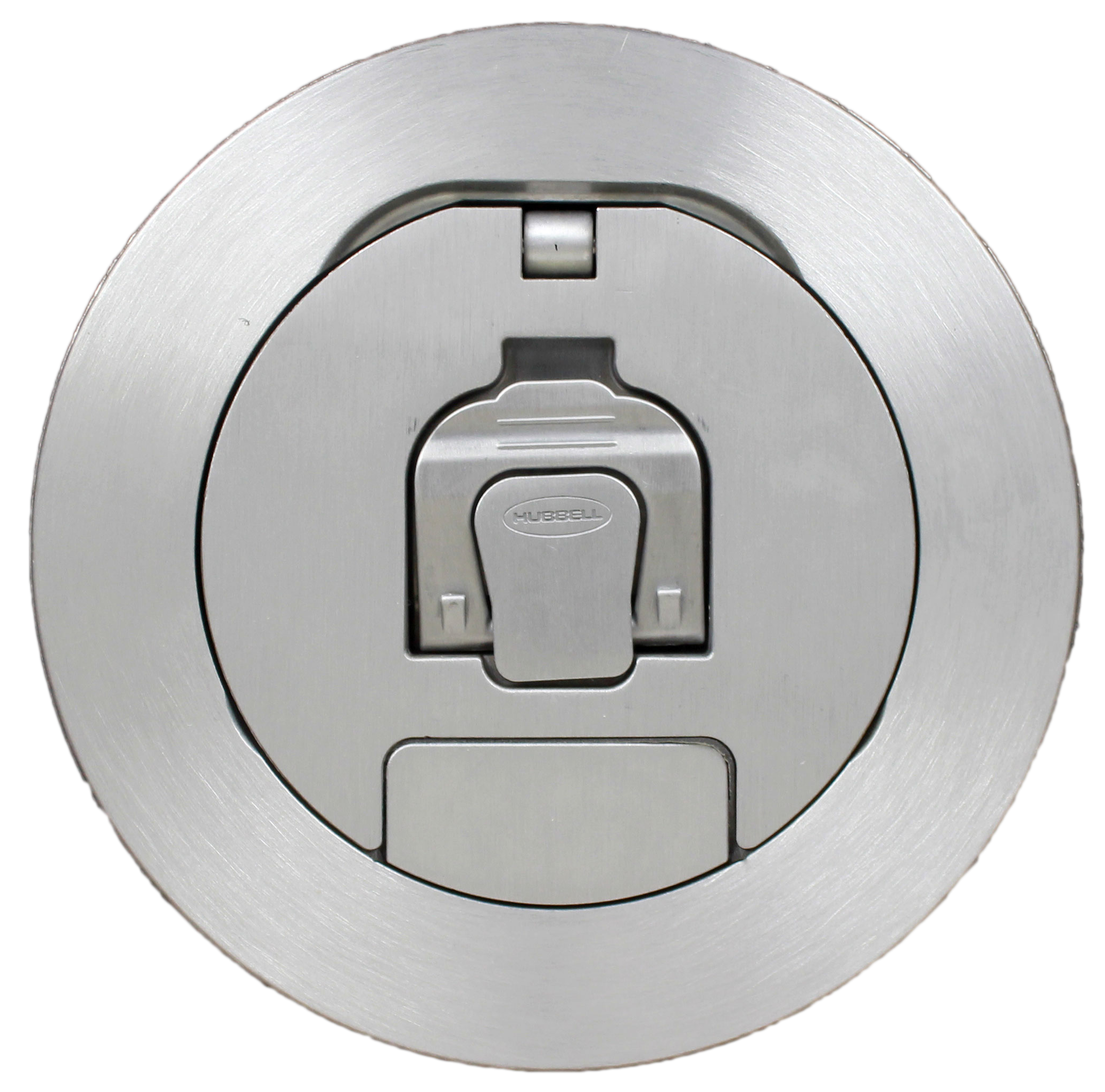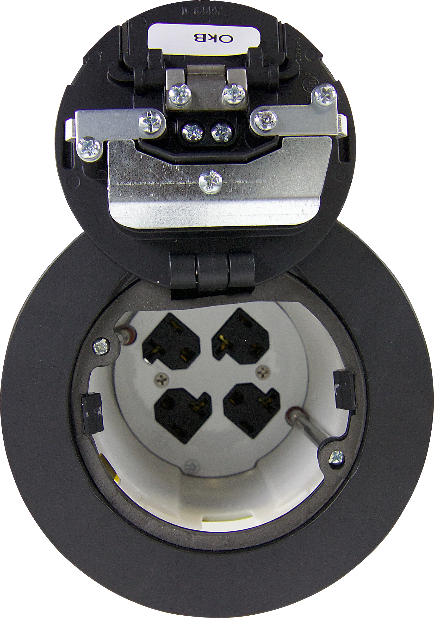 FSR's Fire-Rated "Poke-Thru" floor boxes provide aesthetics and installation ease. These sturdy core hole products combine flexiblity via recessed mounting bracketry to accommodate a wide assortment of power, data and audio video connection options. Covers are available in 3 architectural finishes: Brushed Aluminum, Brushed Brass and Black providing an attractive appearance with superior durability. The entire cover door swings open 180° and the smaller cable access doors fold down for cable egress while the cover door is secure.