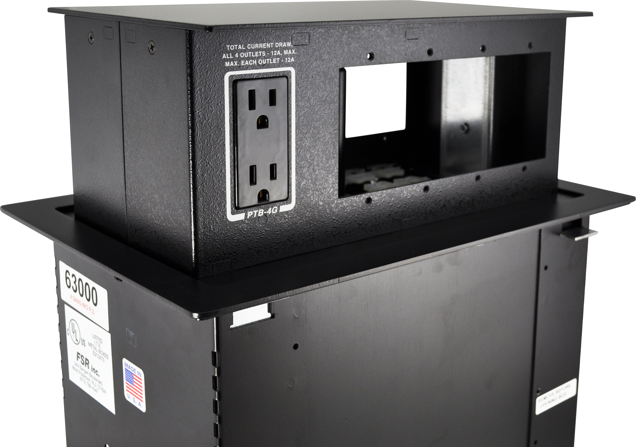 • A mere 5” high in the open position • Black or Brass cover and bezel • Available in 2-gang, 3-gang, and 4-gang sizes • 2 AC receptacles on each side • Adjust to table depths in 1⁄4” increments • Accepts FSR’s IPS and “Simple Solutions” Decora wall plates • Mechanical latch • Pneumatic gas spring system • UL Rated