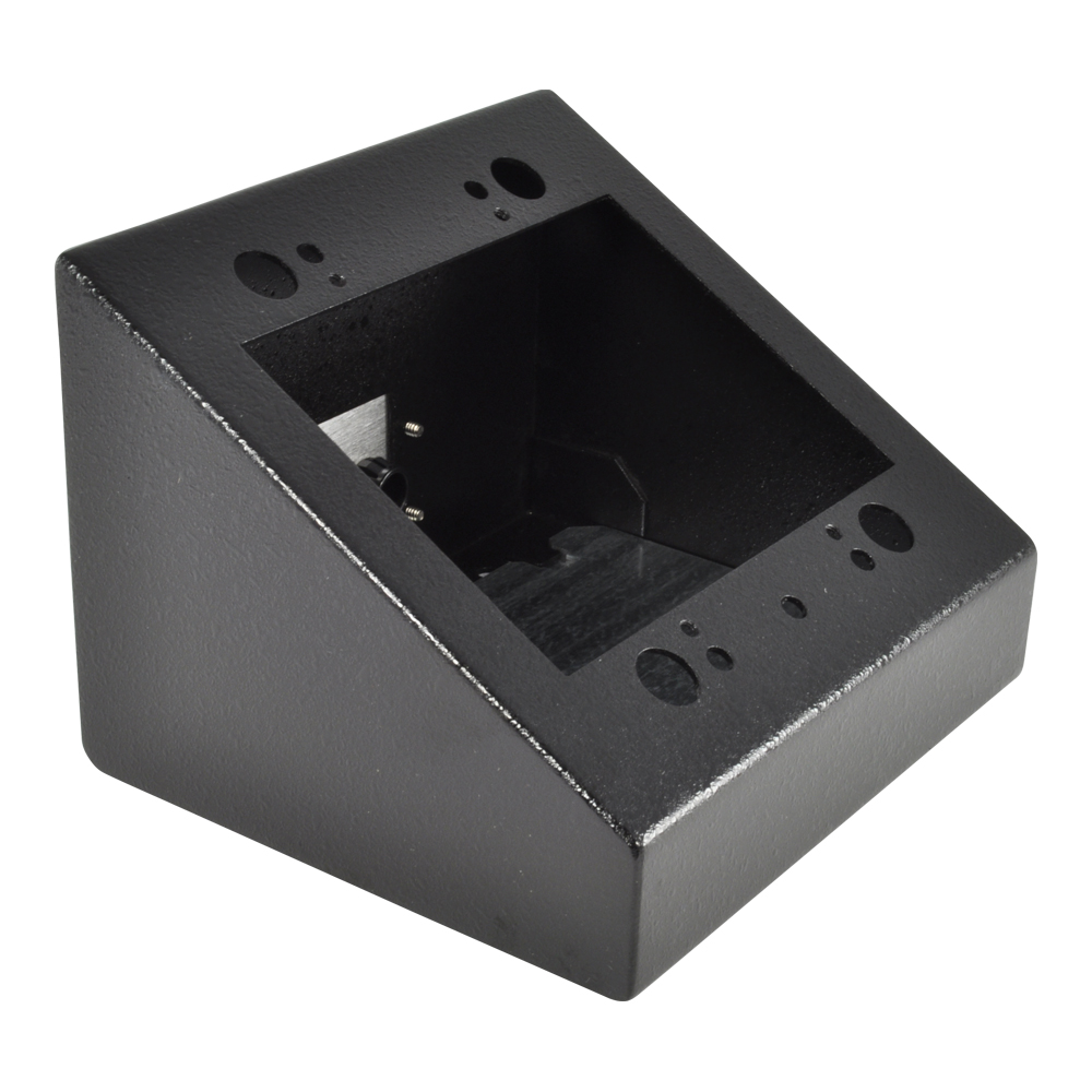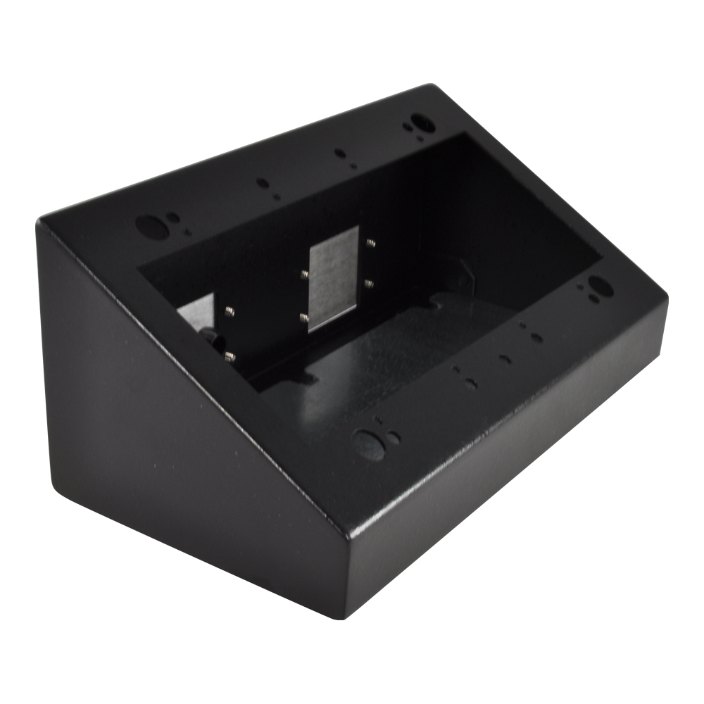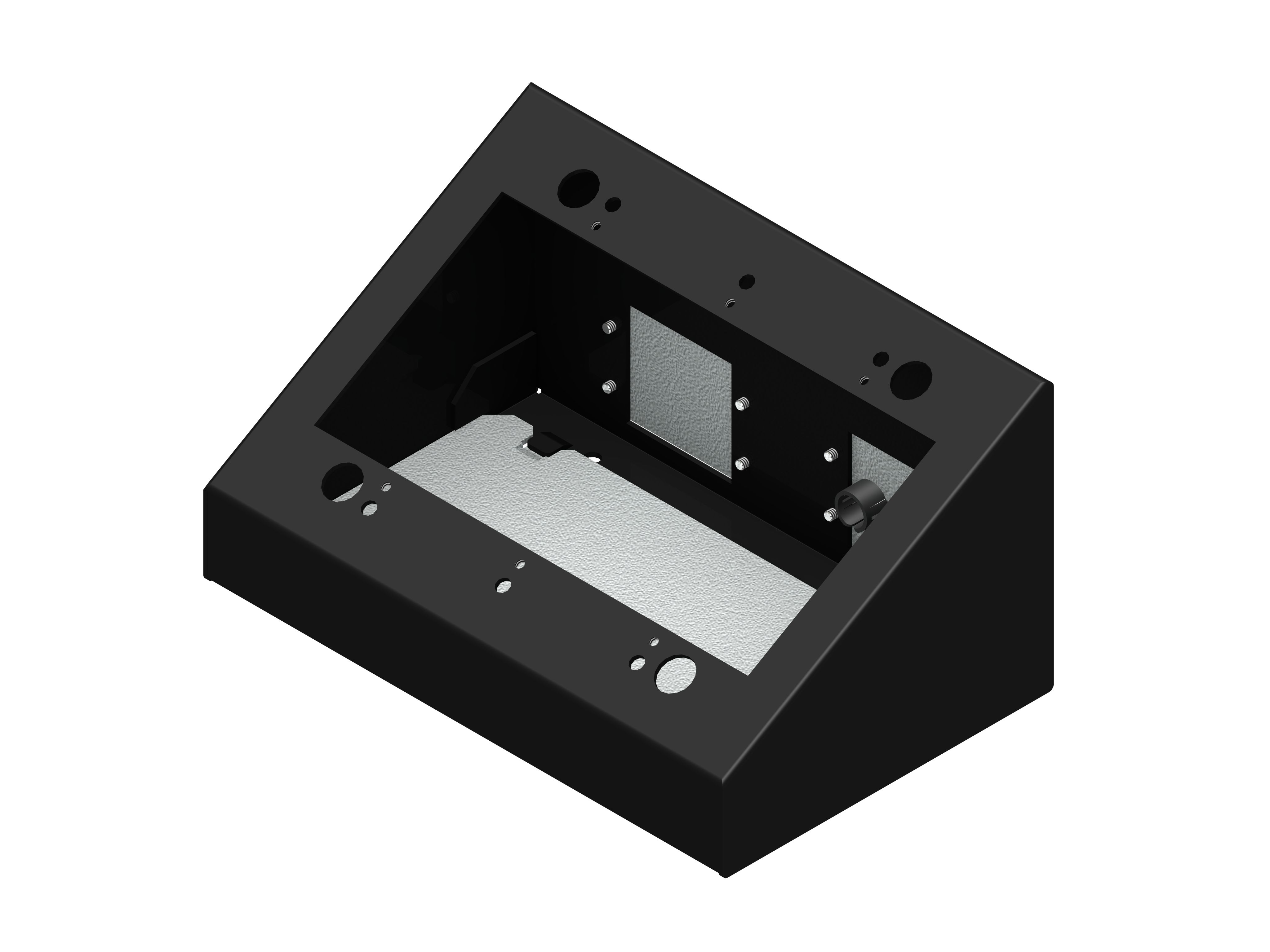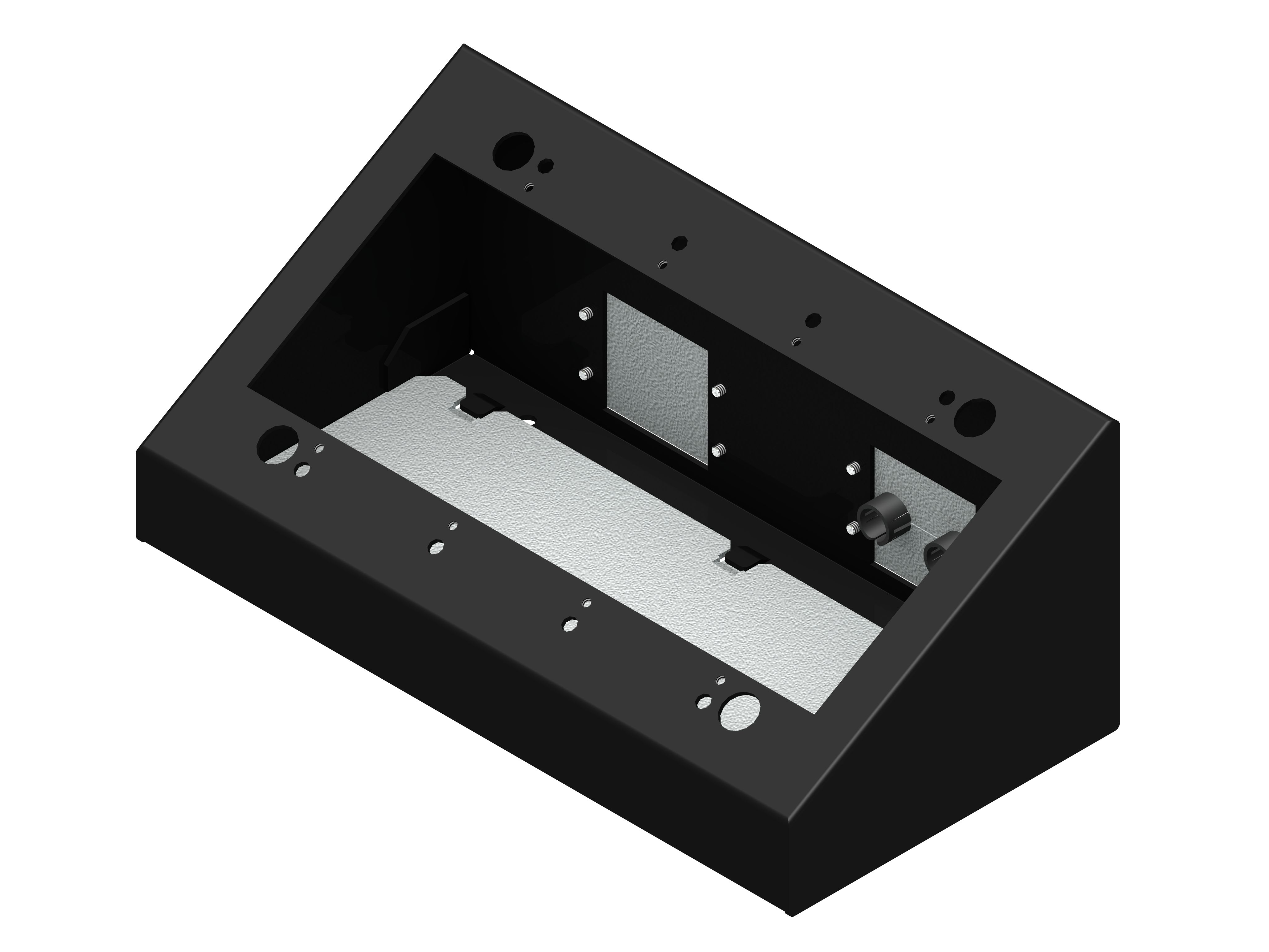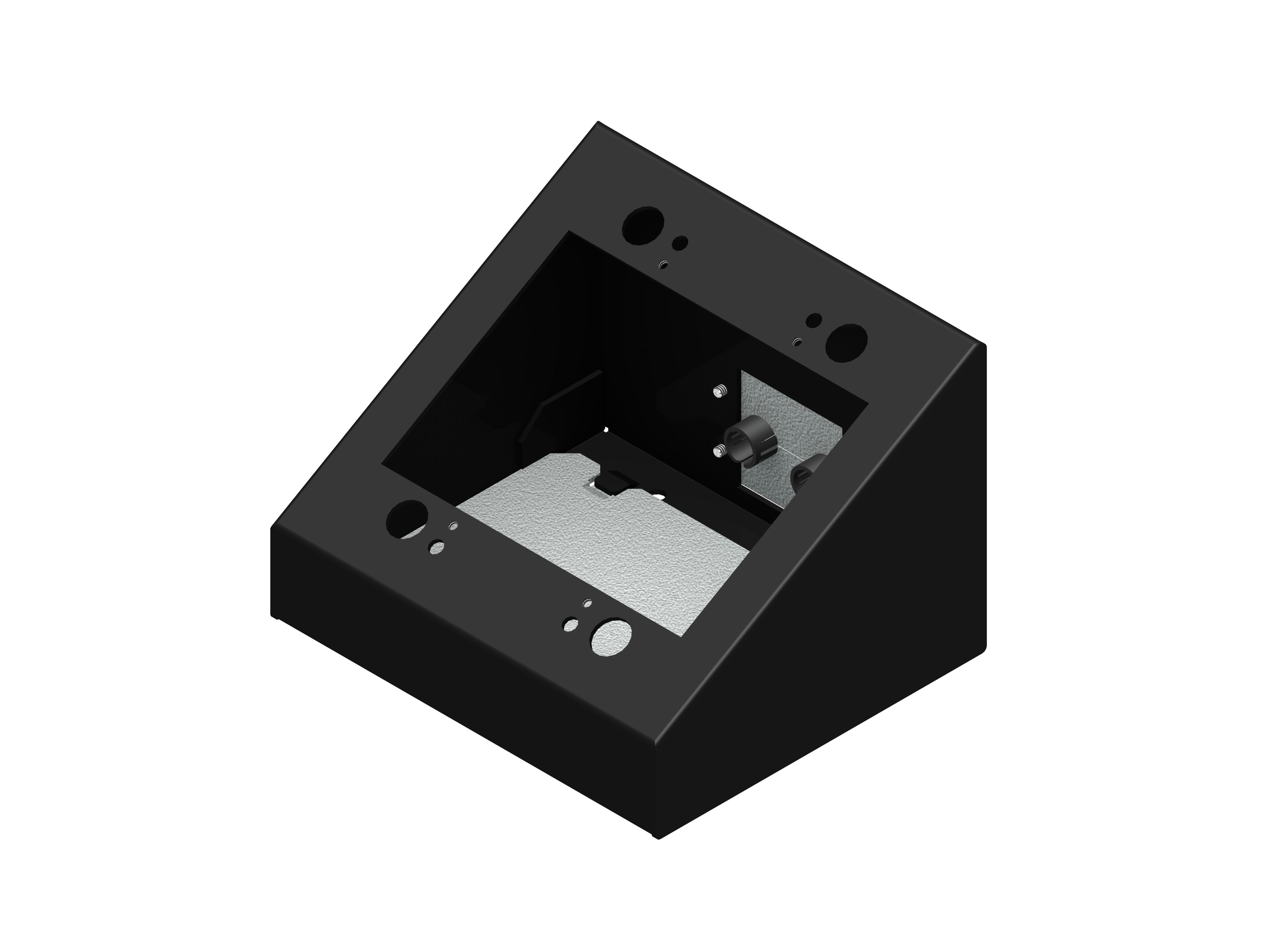 · Compact and free moving · Textured black · Mounting feet · Standard mounting holes for various mount methods · Ergonomic sloped front panel · Holes in rear to mount IPS plates for cable exit · Single gang through four gang styles