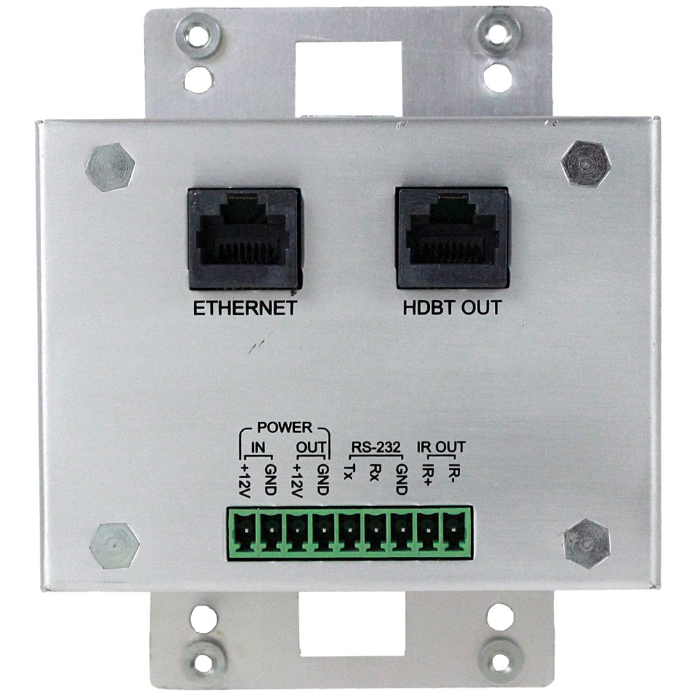 The rear of the wall plate contains Ethernet and HDBaseT RJ-45 Ports as well as captive screw terminals for IR-Out, RS-232, and +12v In&Out. The Ethernet and +12v Out have been designed to be used with FSR's FLEX LT-200 3.5" Color Touch Panel with integrated control system which can communicate back to your rack along with video, audio, and power all over 1 CAT-6A Shielded Cable up to 100m.