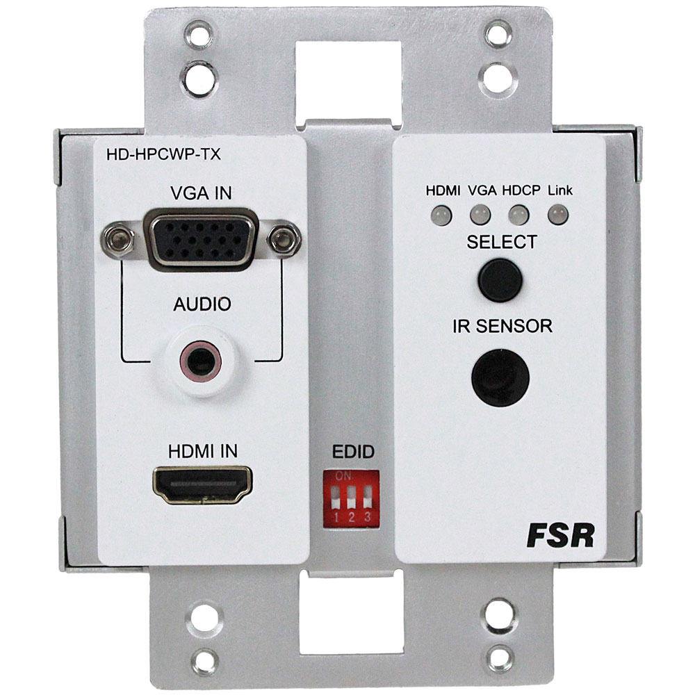 On the front of the wall plate it has an HDMI in & VGA Video In ( HD-15 Female) with Audio In ( 1/8" Mini Jack), IR Reader Window, and input selector button. The HD-HPCWP-Tx is designed to work with any of FSR's 100 Meter HDBaseT receivers and is powered from them as well. It must be used with our USB compatible receivers in order to use the USB functions.