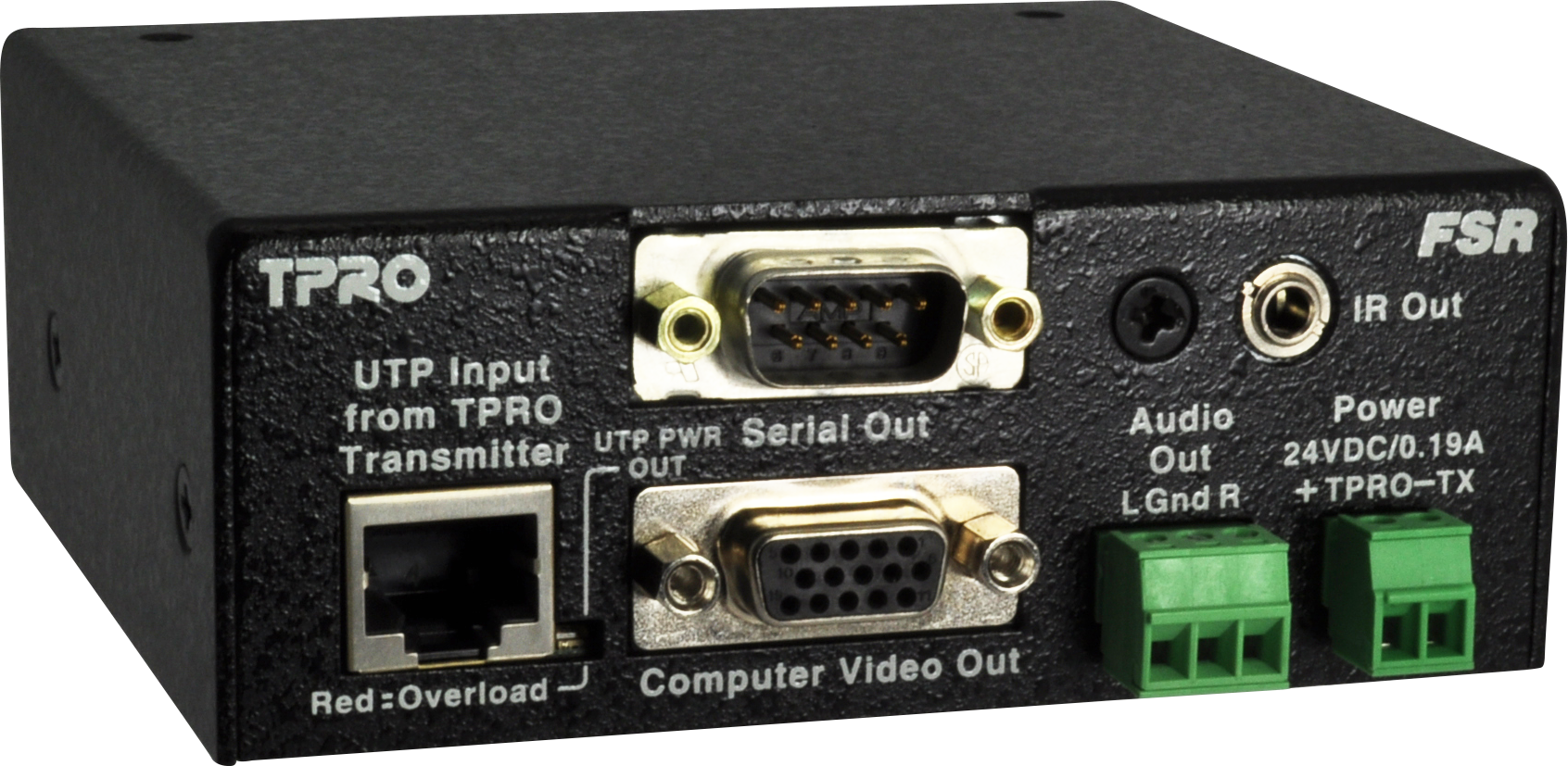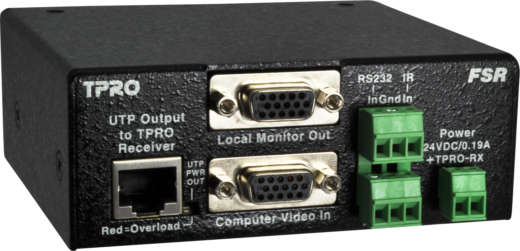 There are wall plate style transmitters (1-gang and 2-gang) and receivers (2-gang) offered in three colors; black, white, and ivory. Matching Decora™ trim rings are included for stand alone use, or the units be populated along with FSR’s IPS component and plates for a complete interface solution. There are also “brick” style housing versions that can be used on any surface or rack mounted using the accessory rack kits if preferred. (See TwisterPro™ accessories and ordering info).