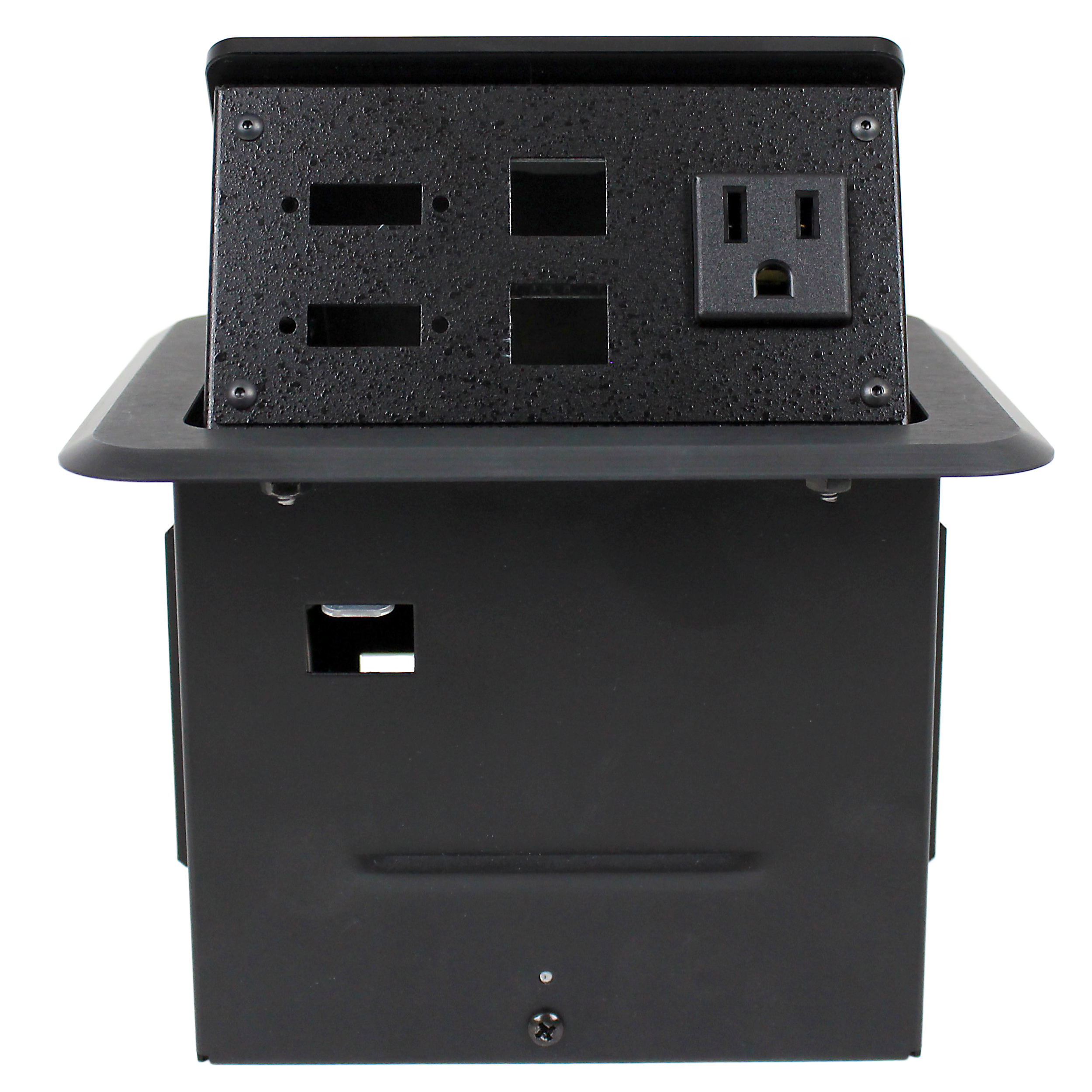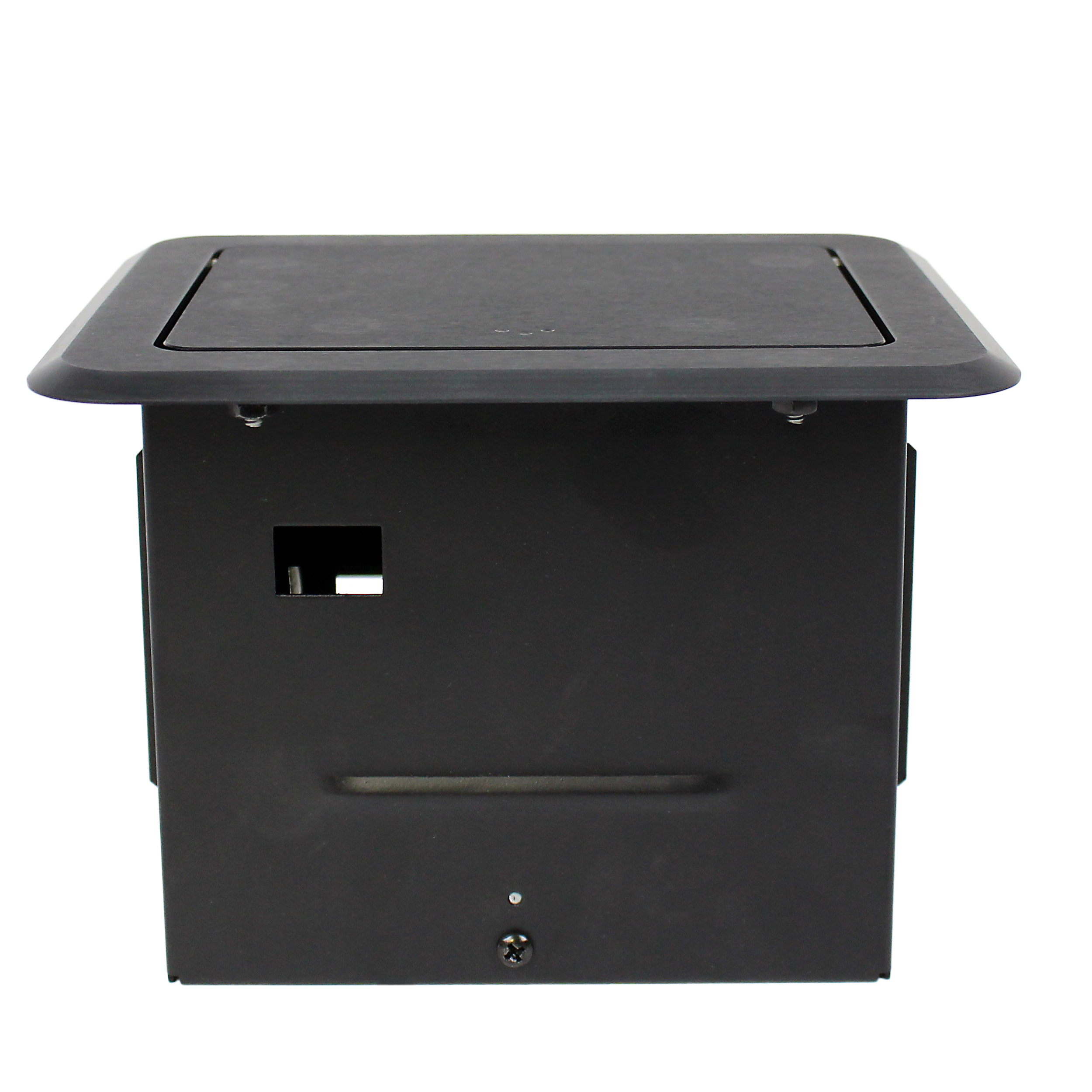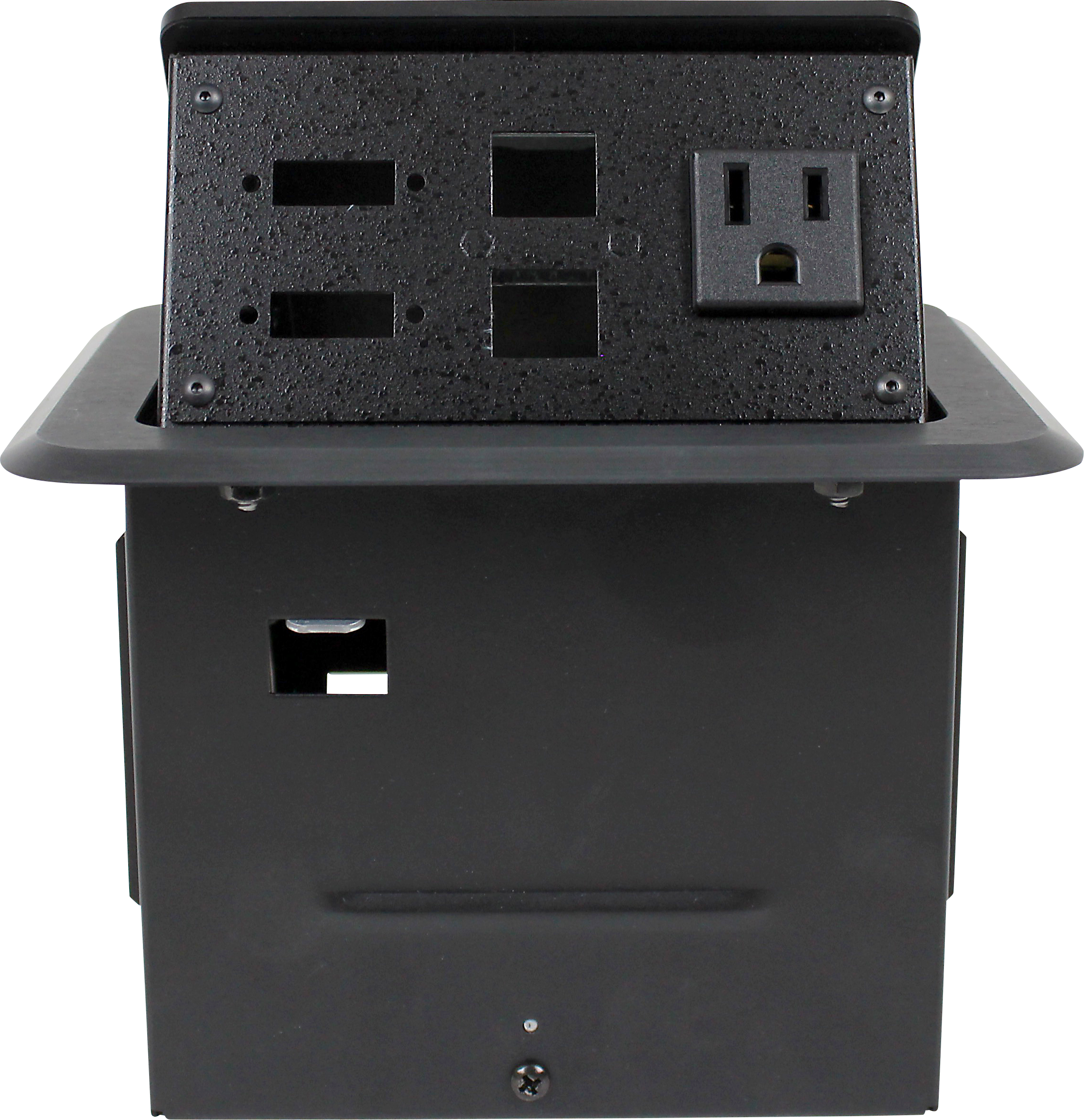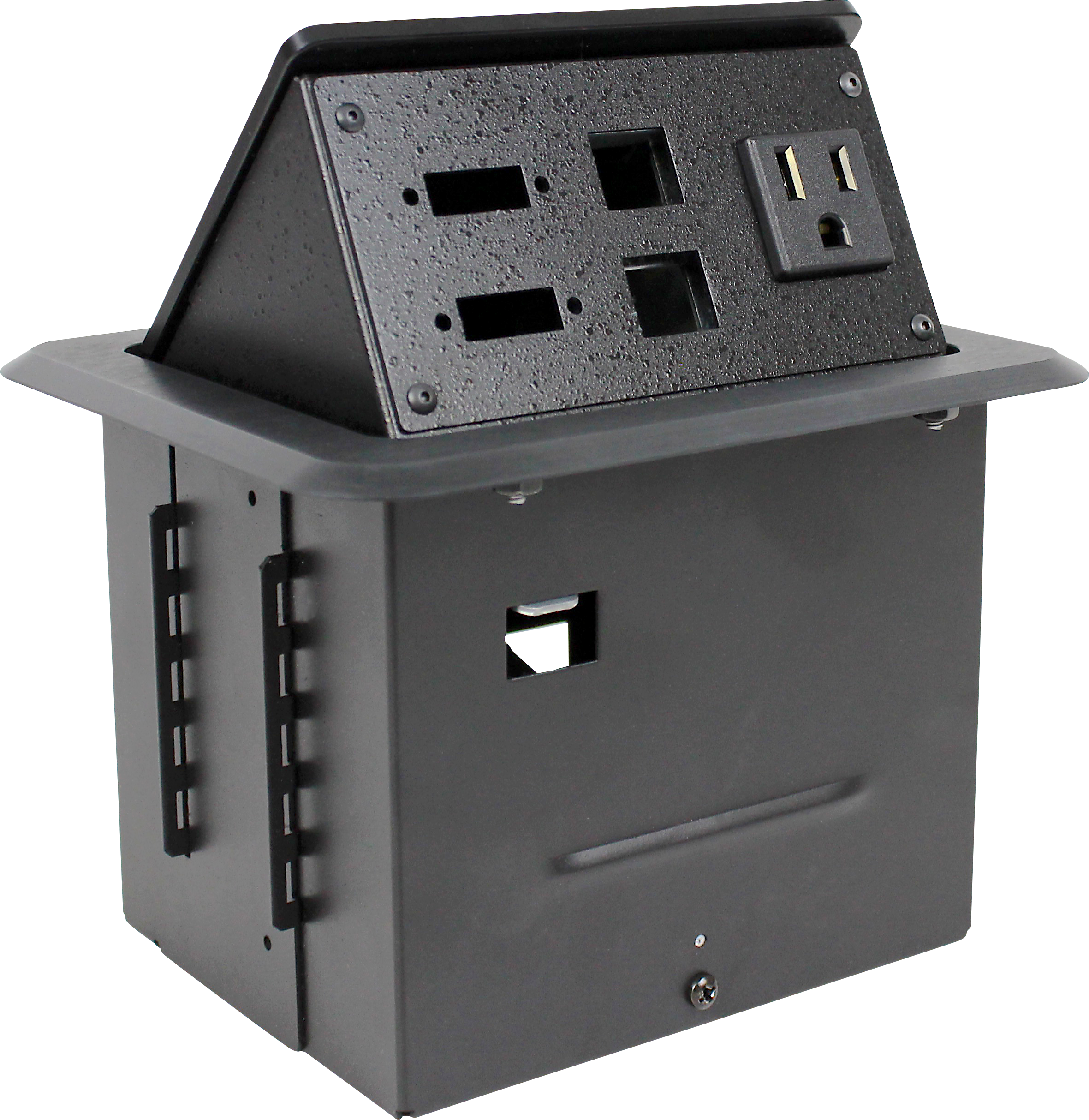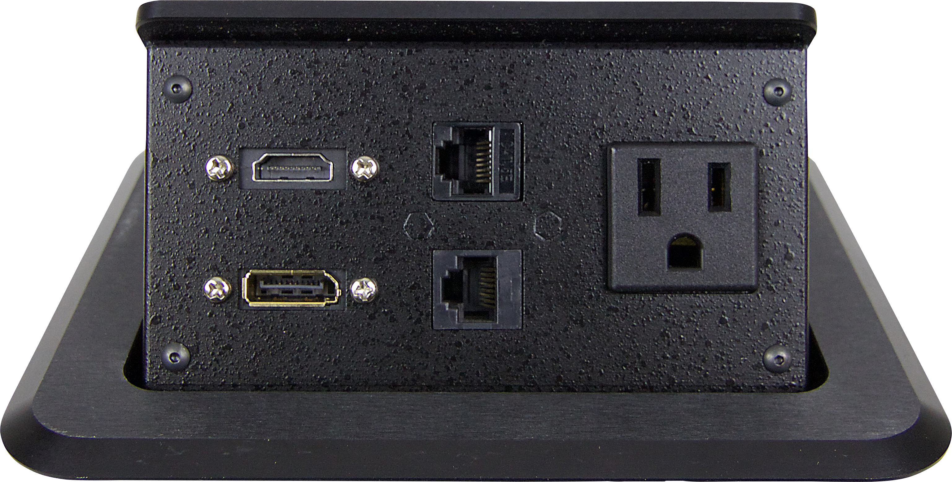 The TB-AVAC table box is designed for AV/IT applications. The box has one integrated UL-Rated AC receptacle and ships with two different connector plates. The first plate is pre-punched to accept two panel-mount HDMI or DisplayPort connectors as well as two keystone connectors. The second plate is pre-punched to accept one panel-mount HDMI or DisplayPort connector, one HD-15 connector and two keystone connectors. Our full line of Simple Solutions (SS) keystone snap-in connectors as well as panel mount HDMI & DisplayPort cables (dongles) can be ordered with the TB-AVAC.