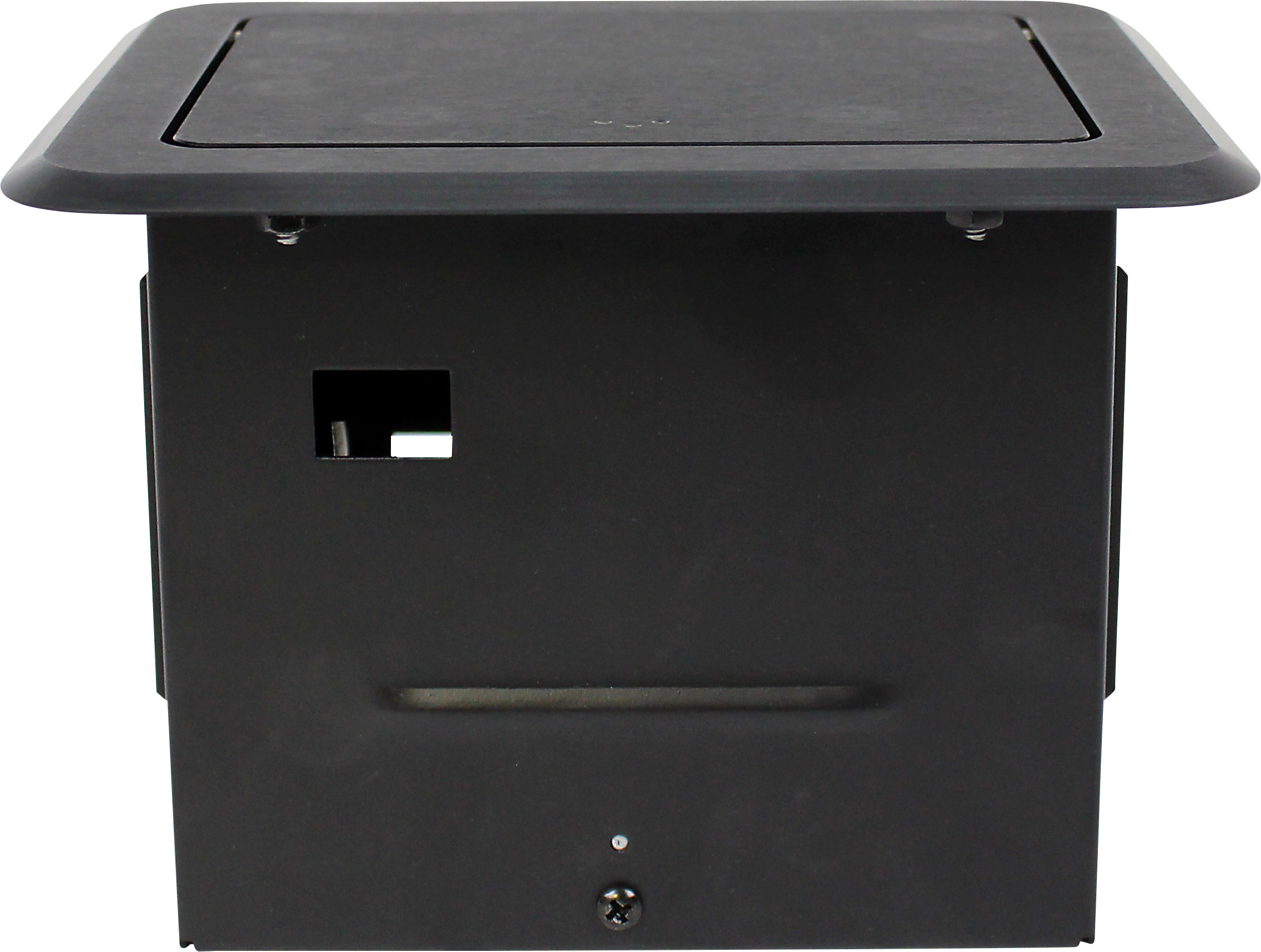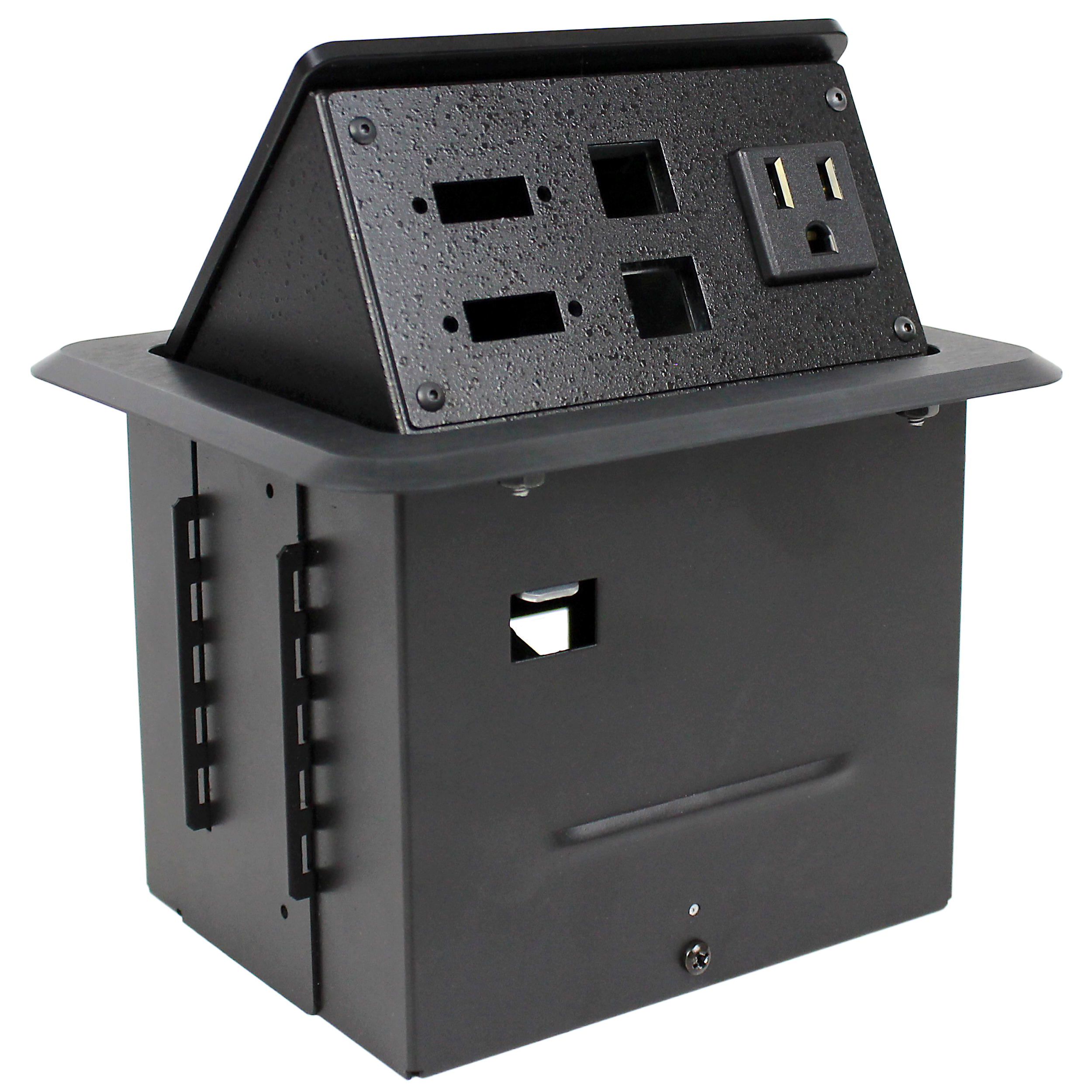 The TB-AVAC serve the needs of a single user at a desk, workstation, huddle area, common area or even multiple locations within a boardroom table. The tilt-up design provides a clean and attractive appearance when the cover is closed, while providing access to the most needed connections when the cover is open. In the open position, the connectors will be at approximately a 35° angle from vertical. This is to accommodate a seated person at the table, with the box being 22” from the edge of the table.
