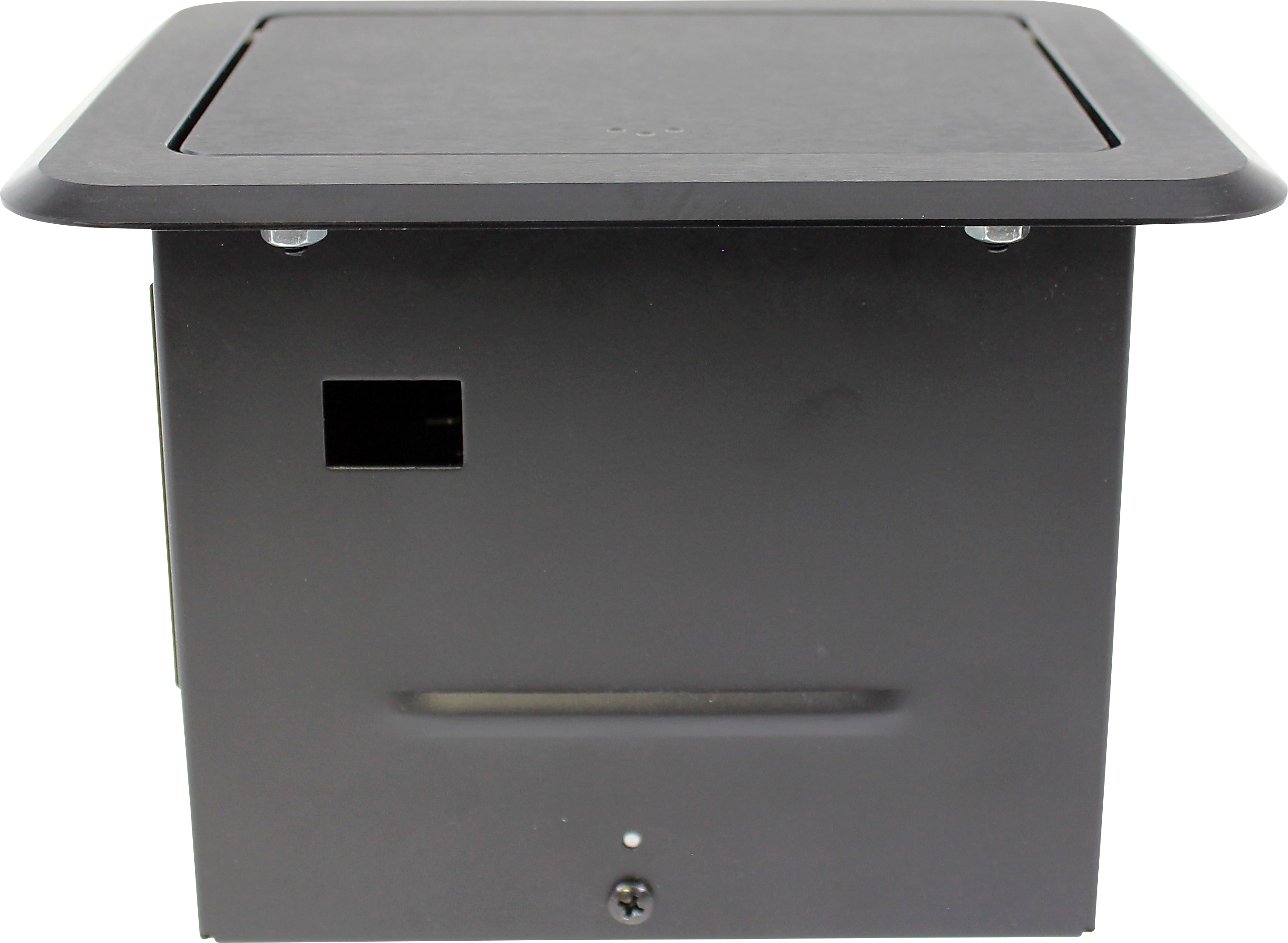 The TB-CHRG serves the needs of a single user at a desk, workstation, huddle area, common area or even multiple locations within a boardroom table. The tilt-up design provides a clean and attractive appearance when the cover is closed, while providing access to the most needed connections when the cover is open. In the open position, the connectors will be at approximately a 35° angle from vertical. This is to accommodate a seated person at the table, with the box being 22” from the edge of the table.
