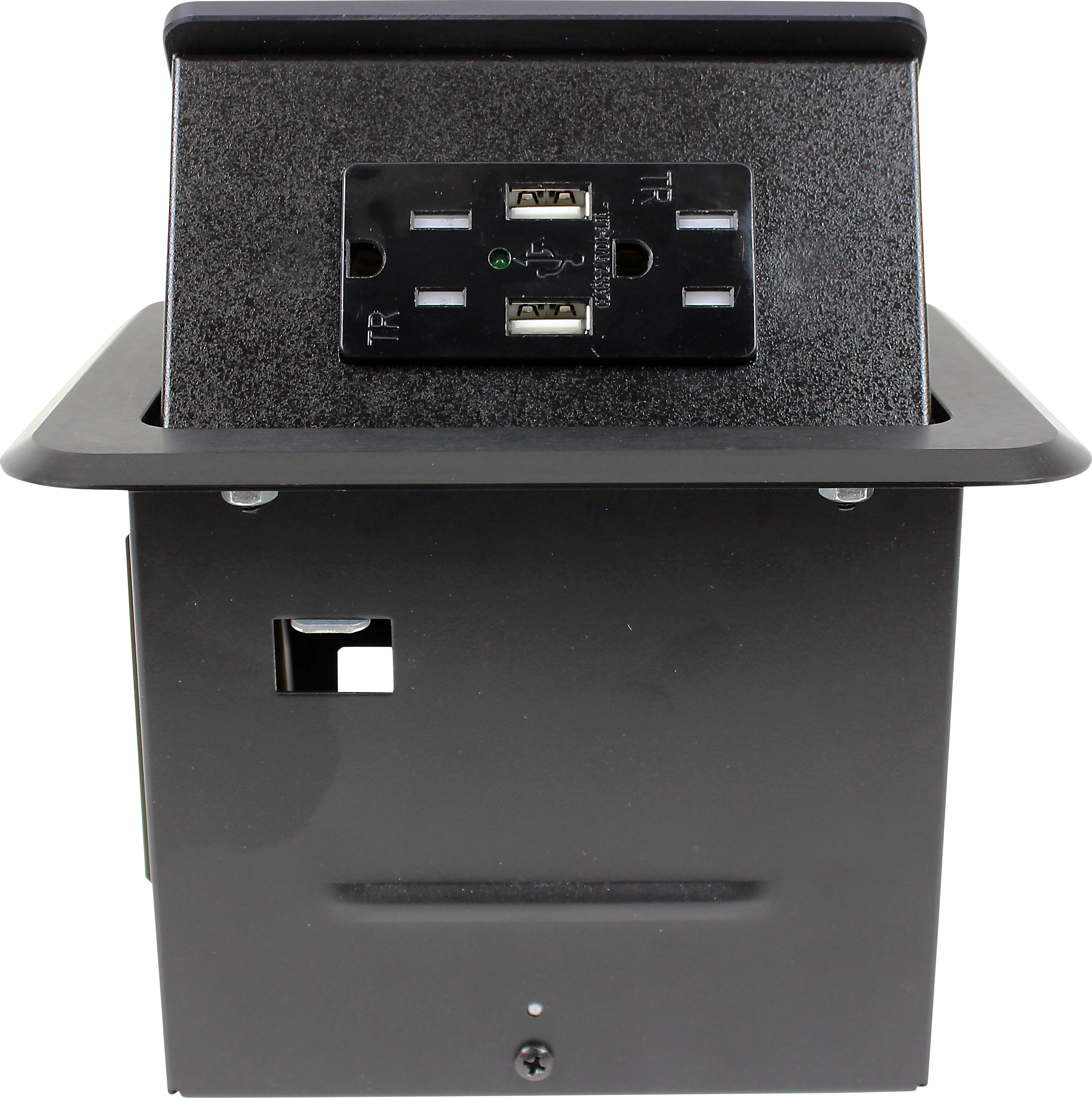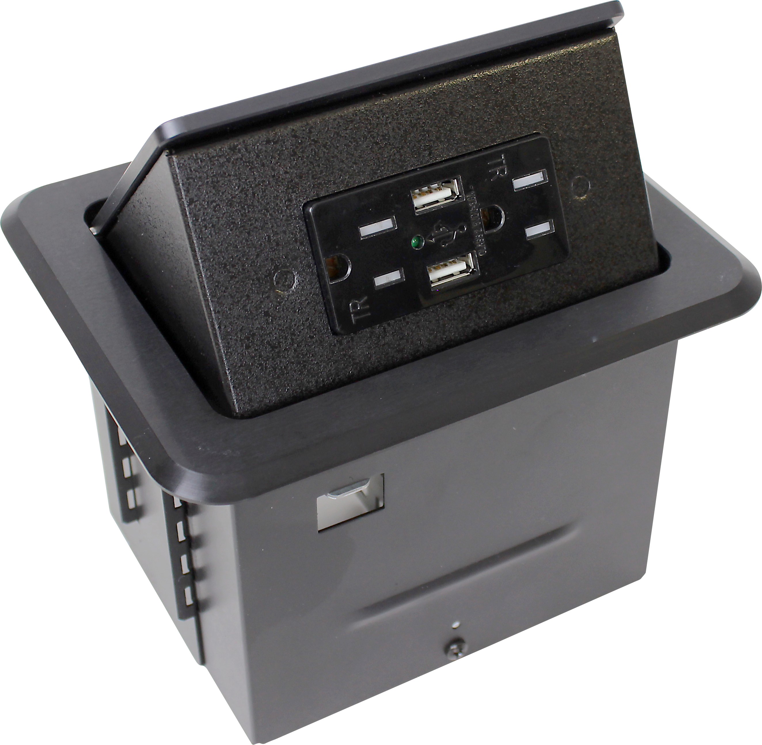The TB-CHRG has a built in AC Duplex Receptacle with 2 integrated USB Chargers. The UL-Listed 15 Amp, 125 Volt AC duplex receptacle has a 3.8 Amp charging section with two USB type 2.0 charging ports (5 Volt DC each).