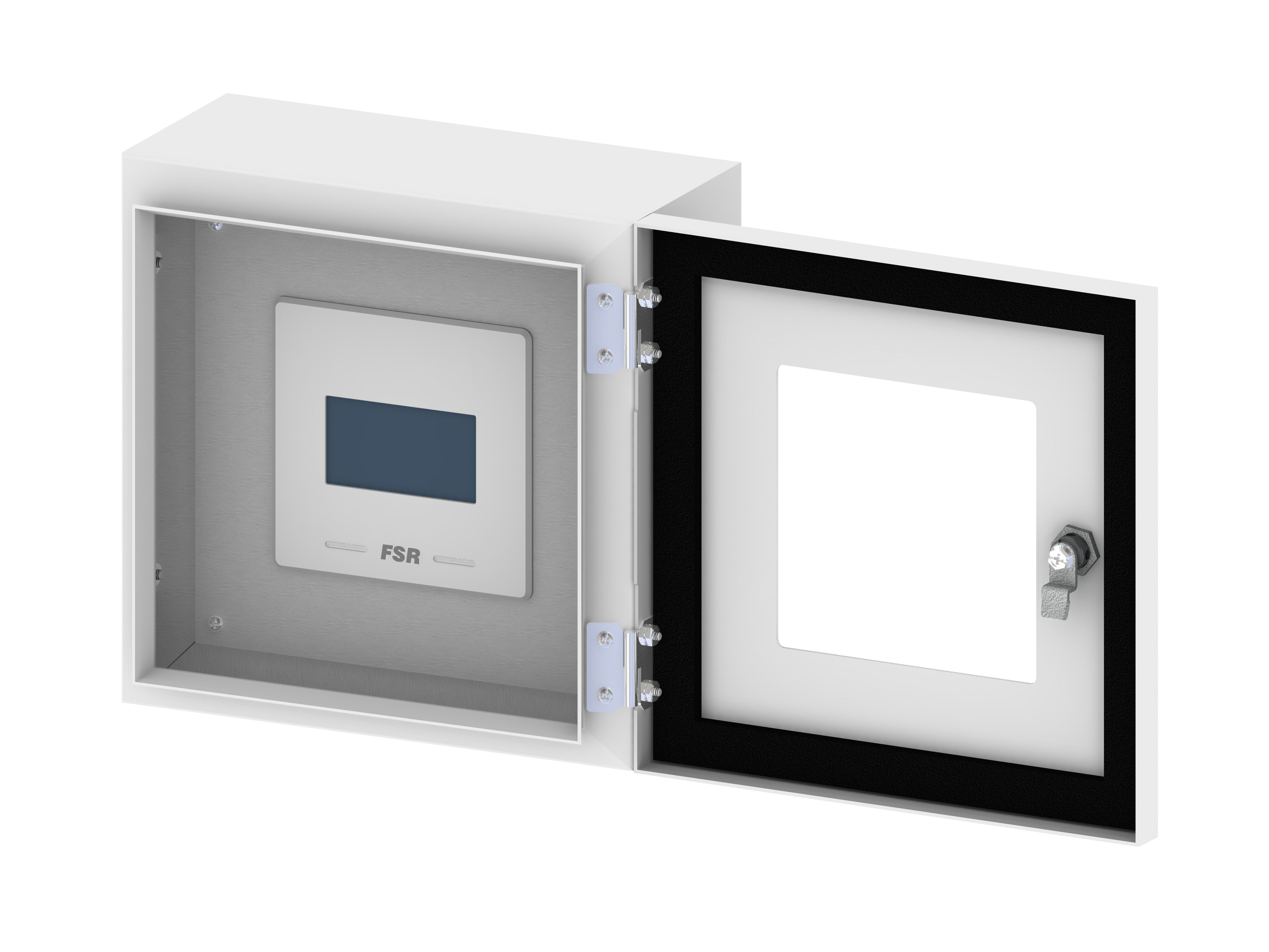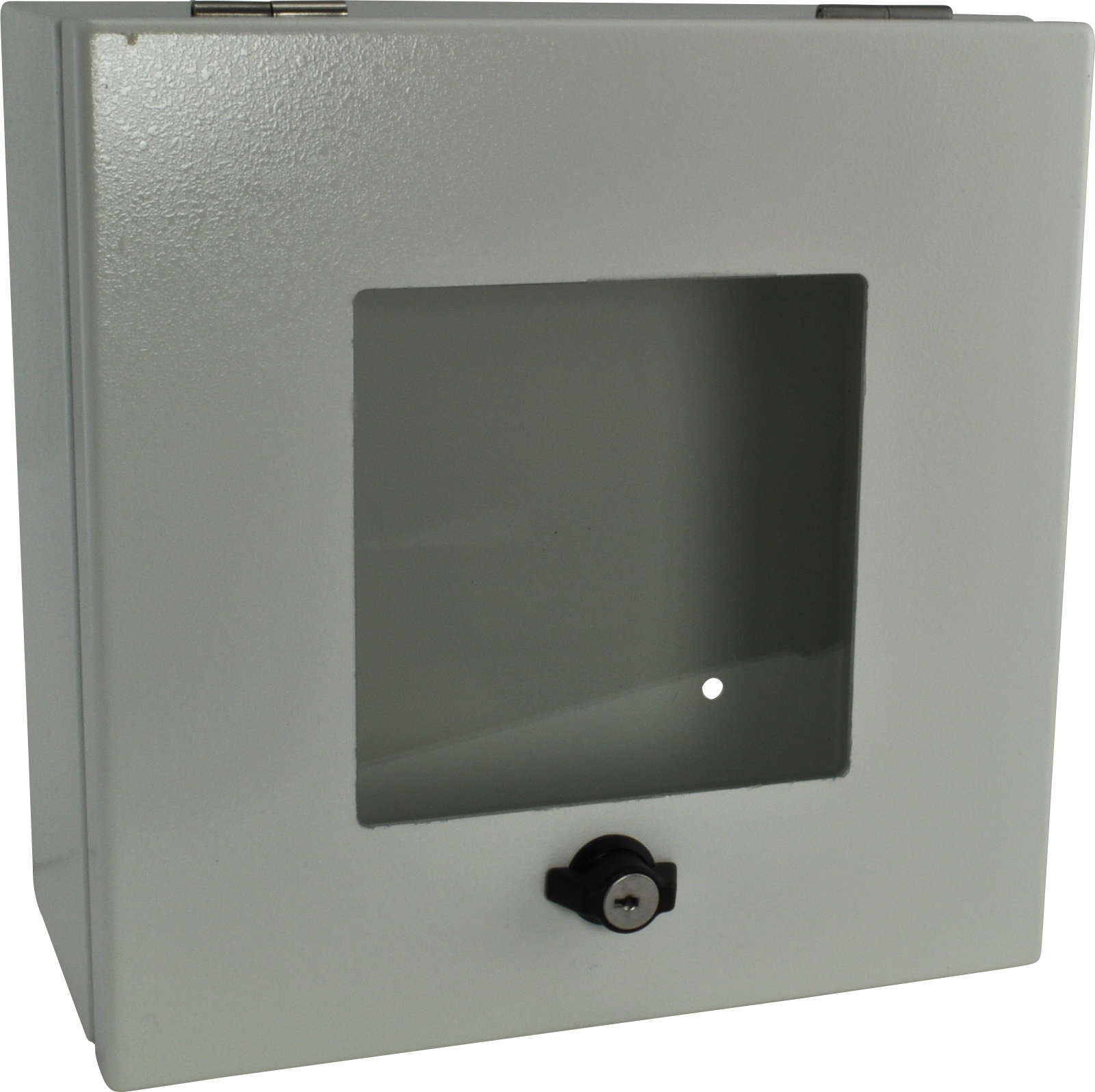 The OWB-CP1 outdoor wall box is designed to mount a variety of control panels including hard switches, elastomeric pads, touch screens, and infrared pickups. The square shape allows mounting in any orientation so the door can swing left, right or up.