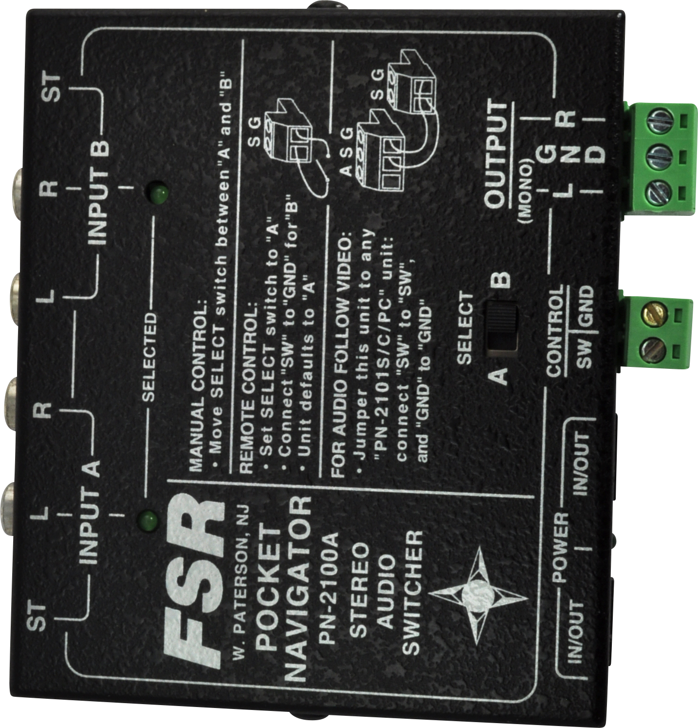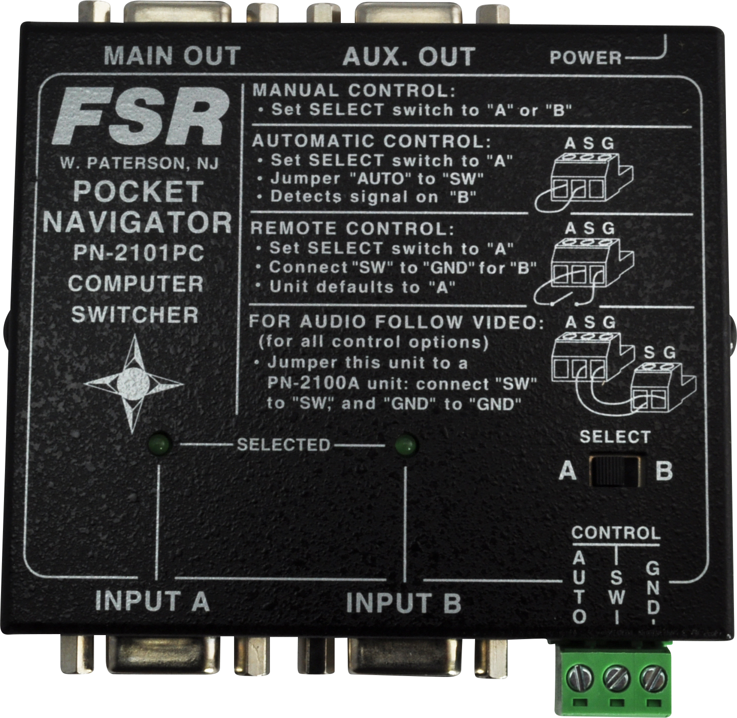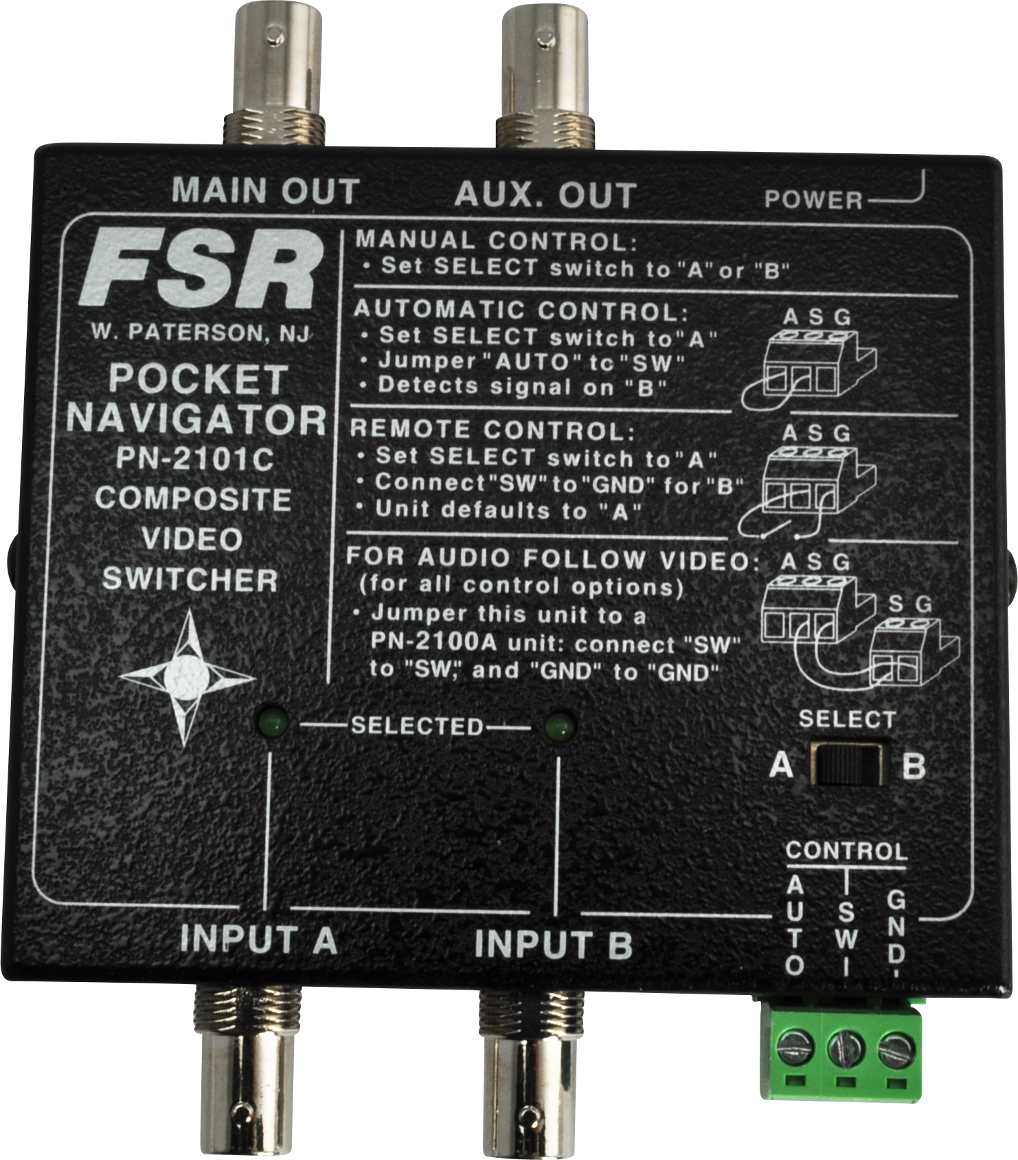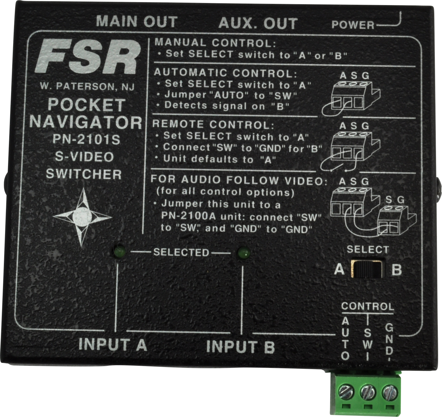 Pocket Navigator 2 x 1 S-Video switcher with extra local monitor output. Uses S-Video 4-Pin connectors. Comes complete with locking power supply, rubber feet, and mounting screws.