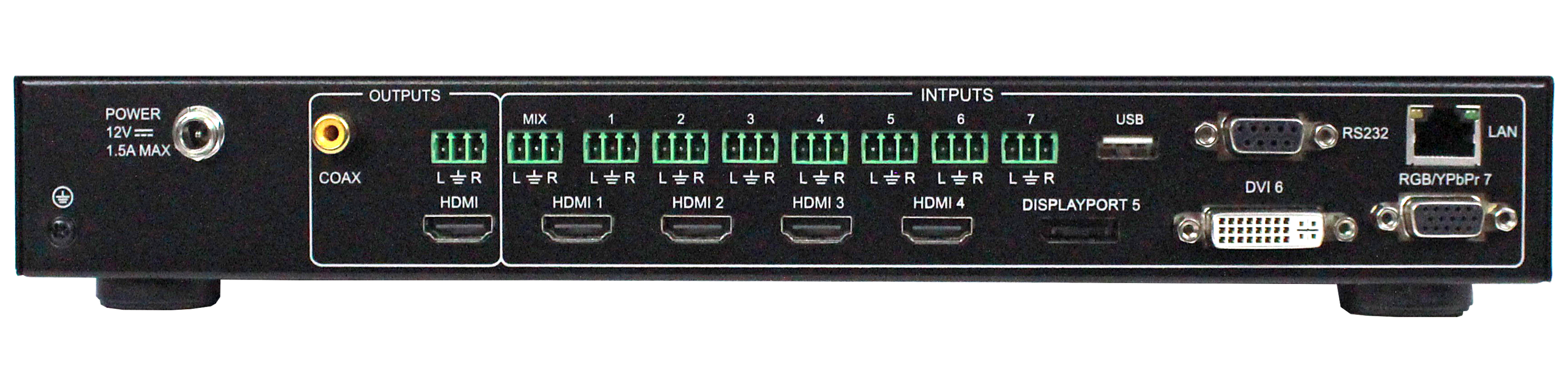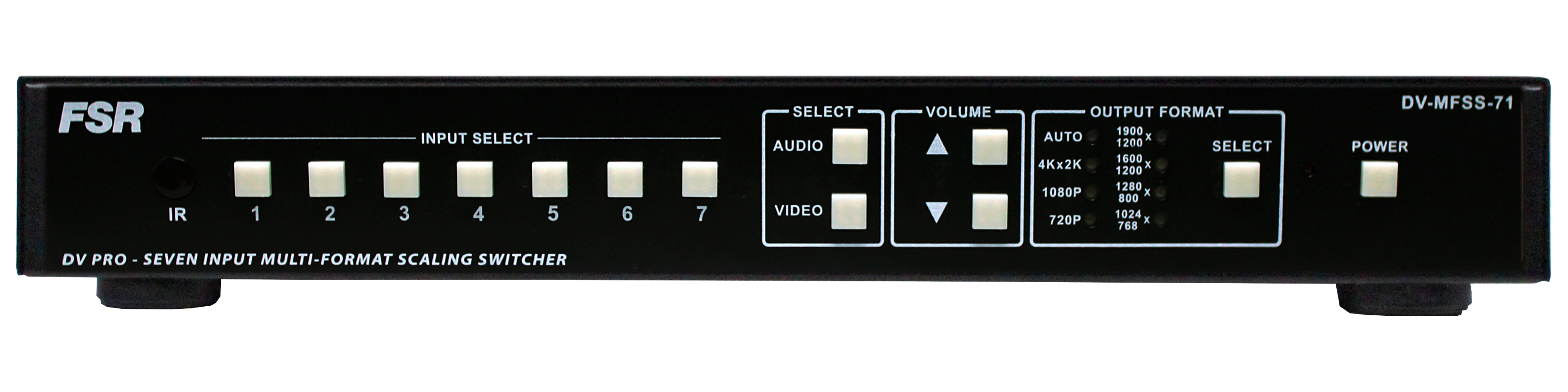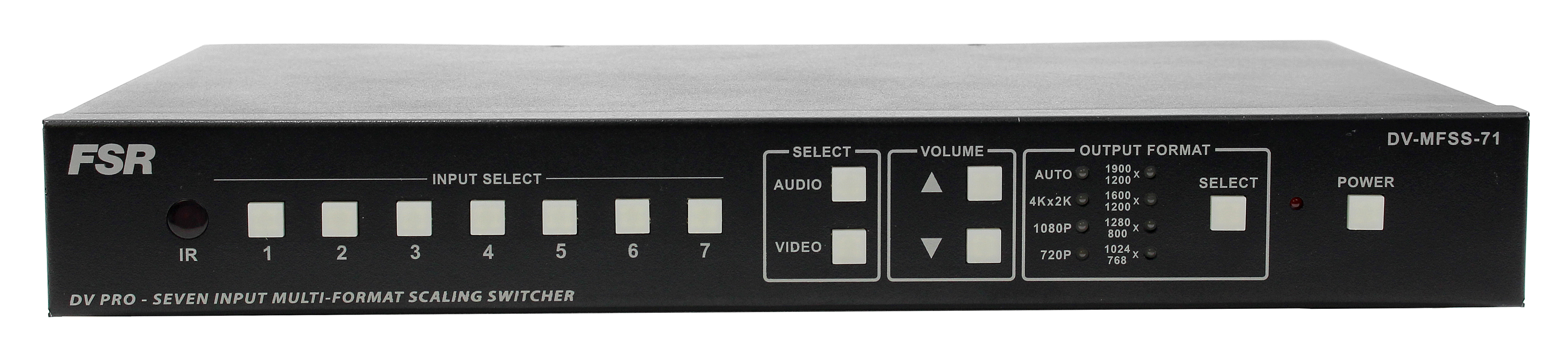 The DV-MFSS-71 is our new 7 x 1 switcher. It has 7 multi-format inputs (4 HDMI, 1 DisplayPort, and 1 DVI-I, and 1 VGA/RGB/YPbPr) and one HDMI out that supports resolutions up to 4k x 2k 30hz. Each input also has audio inputs available via captive screw terminals and has a stereo output as well. The 1 rack unit high switcher can be controlled from the front panel, via RS-232, or IP via the integrated GUI Control. The DV-MFSS-71 Seven Input Multi-Format Switcher also easily integrates with our HuddleVU FLEX Collaboration System.