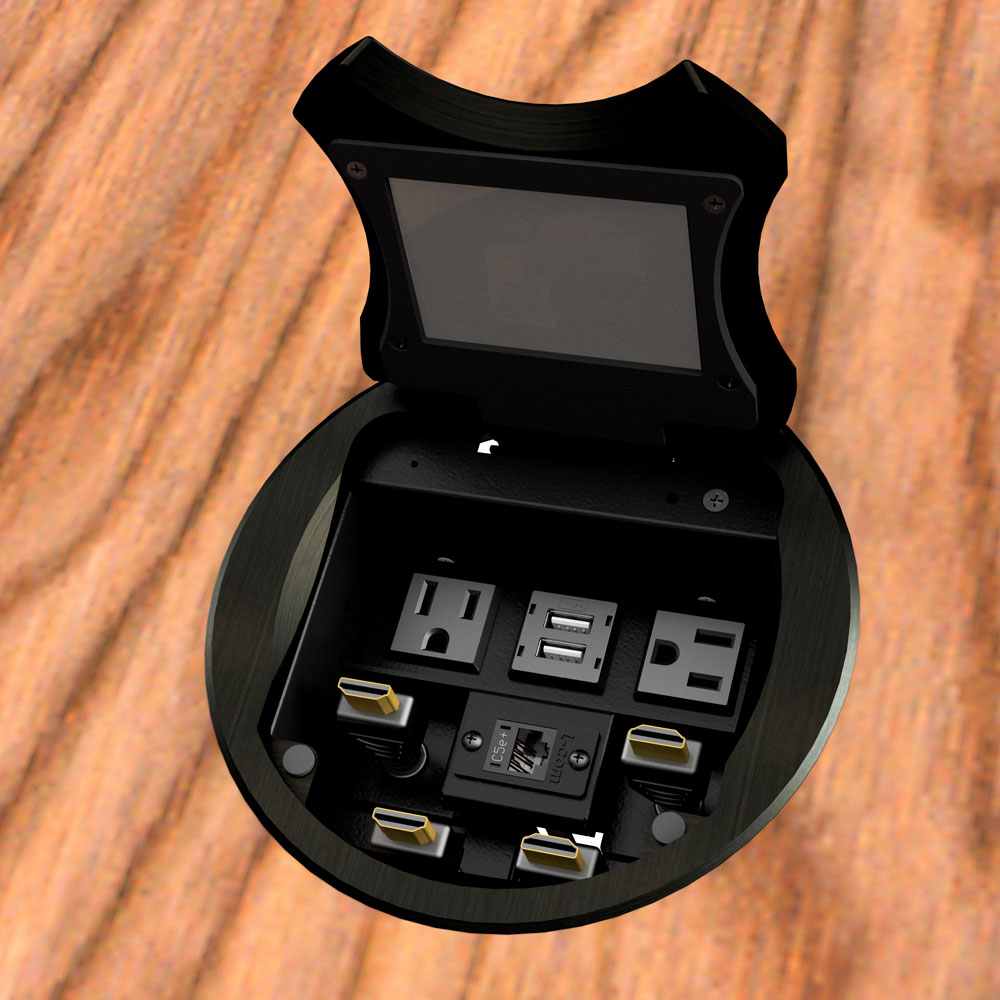 There is a  choice of round or square covers with finishes of black anodize. These low profile table box/retractor packages offer a variety of interior configurations to handle all connectivity requirements.