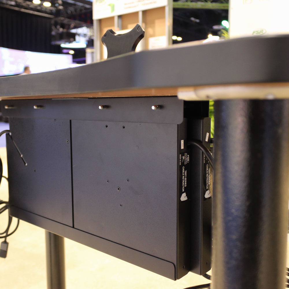 These slim-style retractors can also be stacked side-by-side on the underside of a table using the UT-2-LPRTMKT bracket. Mounting the retractor on the bottom of the table maximizes under-table clearance leaving additional leg room while seated. Installing the retractor parallel to the table's edge provides easy deployment when needed.