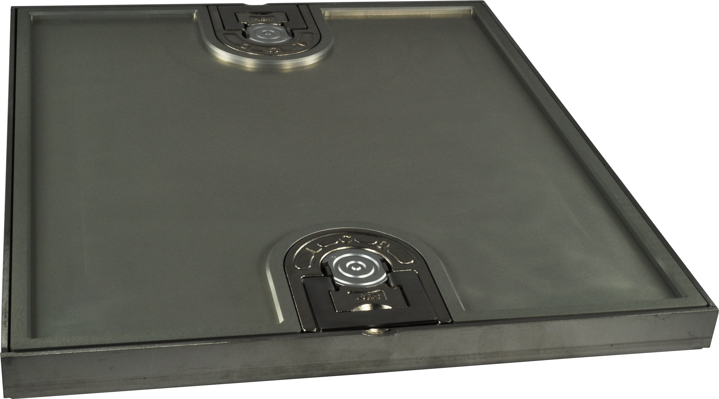 All covers are designed to meet H20 load ratings using 7/8” thick type 6061 T6 heat-treated aluminum. The clear anodized cover is available for use in concrete, carpet or tiled floors. The two cable exit doors incorporate FSR’s exclusive 3 position cam locks which allow “One Click’ operation to open the cable door or remove the cover. An alternate cover option is a plain cover with no cable access doors for a when the box is used as a junction box and cable exit capability is unnecessary.