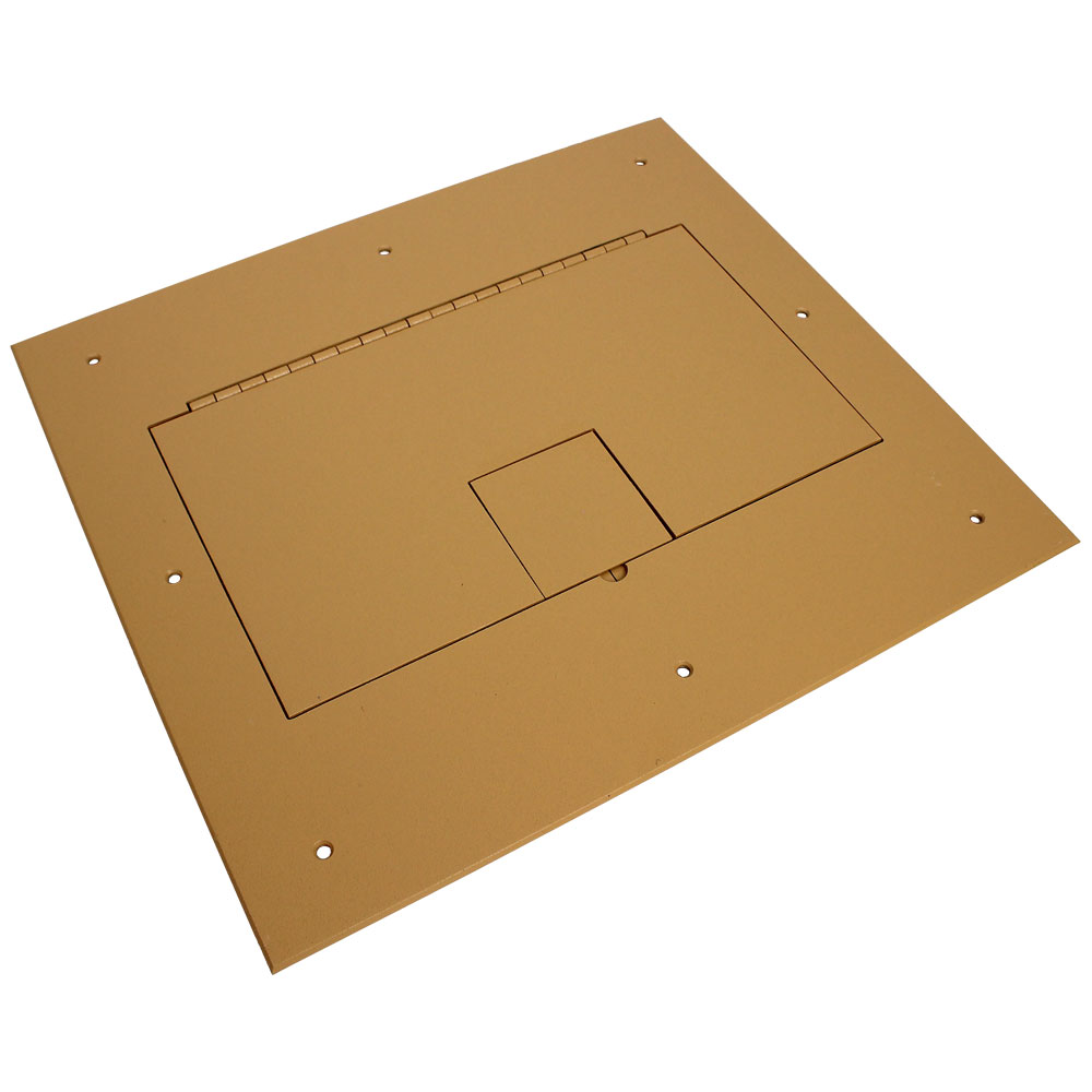 The FL-640P-4 floor box is designed for raised access carpeted floors. This floor box provides a practical solution for cable storage while maintaining easy access. The lift off section of the cover allows full access to the internal cables and connector plates. A smaller hinged trap door folds back to create the cable exit. Cables can be stored within the floor box when not in use, allowing unencumbered travel over the floor. The sturdy drop-in floor lip supports the unit and installs flush with the floor.