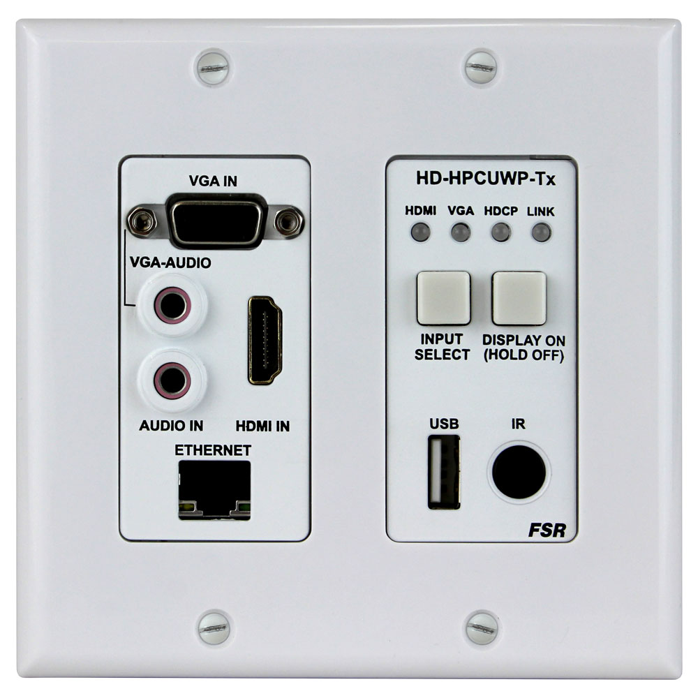 The HD-HPCUWP-Tx is a 2x1 auto switching wall plate for HDMI and VGA with audio inputs with an HDBaseT 2.0 output. This wall plate is a true HDBaseT 5-Play device that transmits uncompressed 4K/UHD @60hz (YUV 4:2:0 color sub-sampling), VGA input signals up to 1920 x 1200, embedded audio, and control signals can be extended up to 328 feet (100 meters).