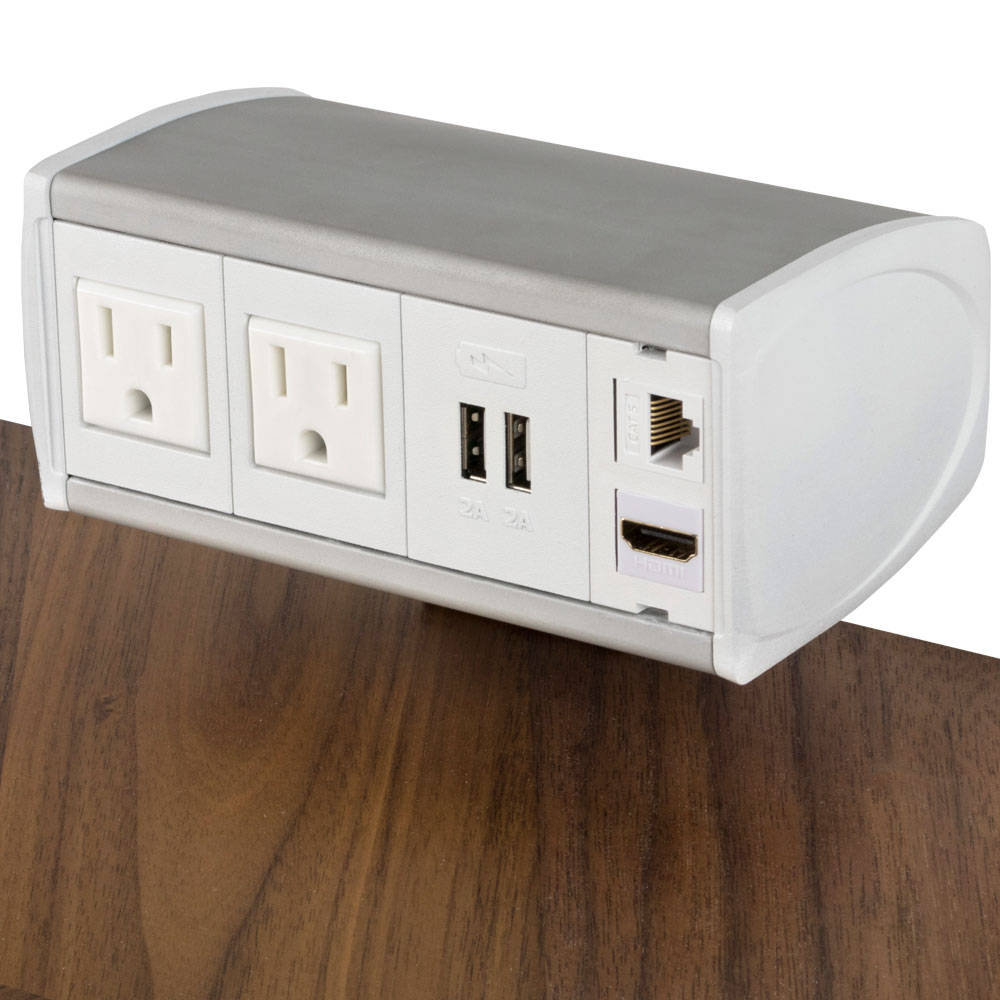 IMPORTANT DETAILS Symphony Table Box stocked model w/ 2 AC outlets, 1 Dual USB-A/USB-C Charger, Aluminum housing, White end cap, White inserts