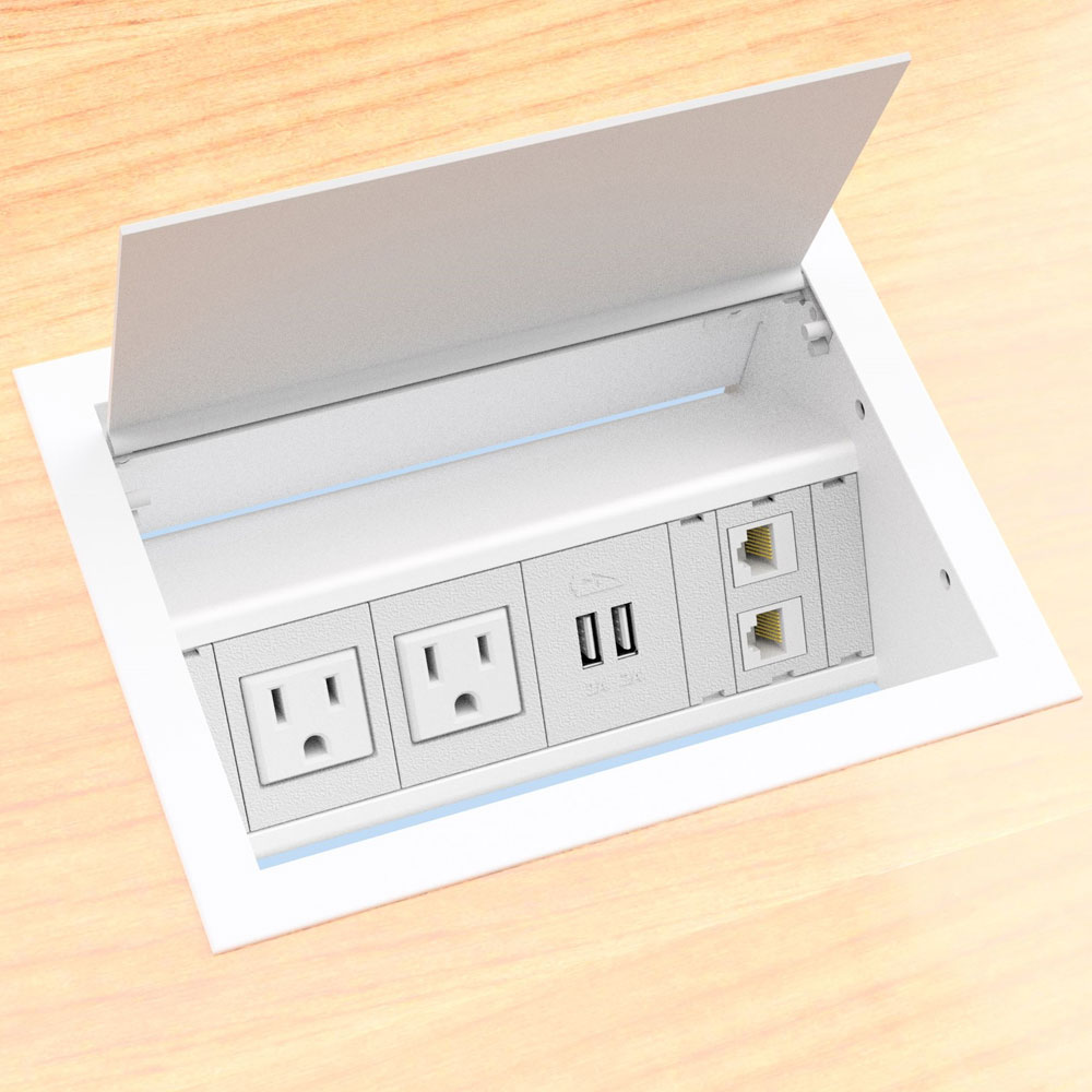 There are a variety of stock models available allowing access to network, CATx cables along with AV cables and AC power. Standard models can be ordered with up to three AC outlets, two USB charging ports, and two low voltage openings that receive FSR Simple Solutions and Hubbell™ keystone style snap in connectors.