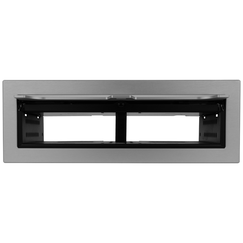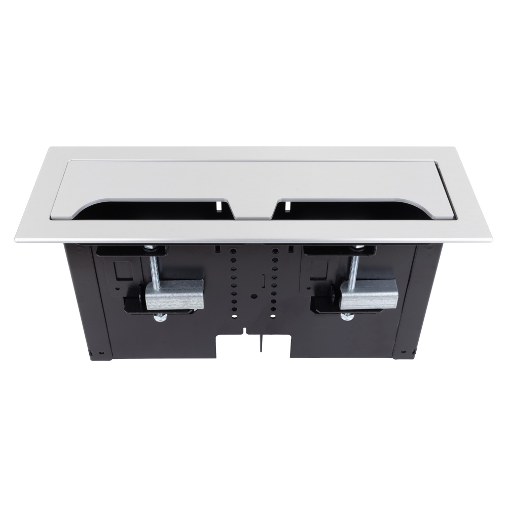 The RT6-RD4 table box is a dual-sided rectangular box with spacing for any four T6 series large brackets mounted horizontally facing opposite sides of the box. Individual covers for each side handle your individual applications. It can also be configured to hold up to 16 TBRT cable retractors or 8 retractors to still have space for AC and USB chargers as well. This model is shipped with two (T6-LB-UN) universal brackets, capable of being used with IPS plates, as a blank or cable pull option.
