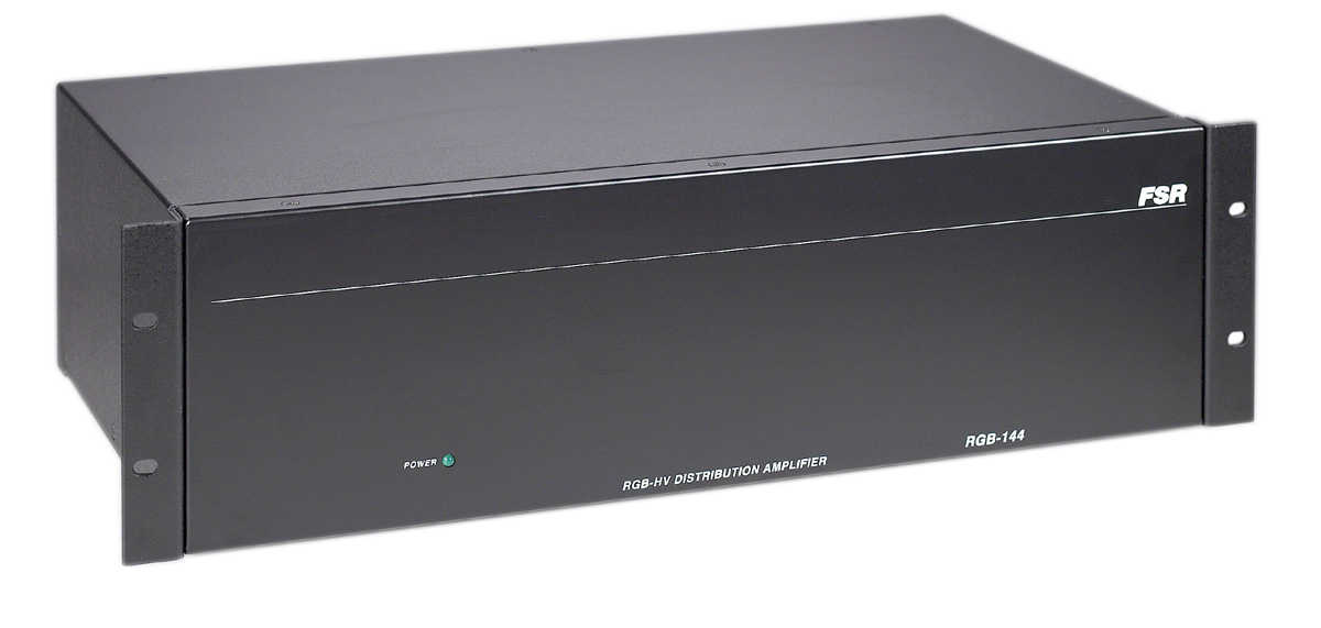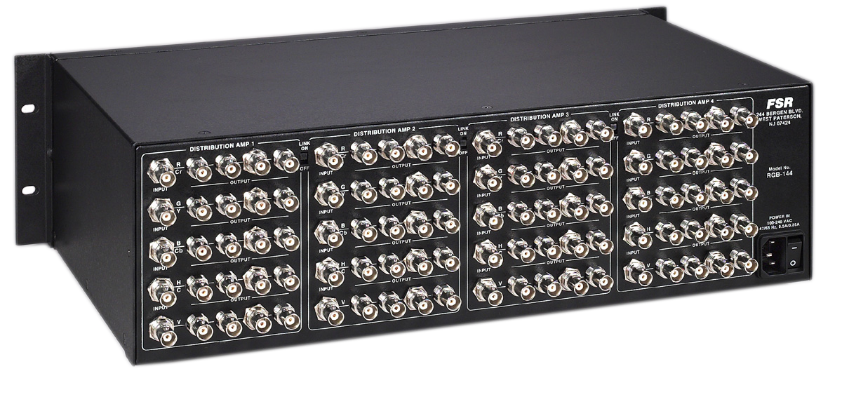FSR introduces the RGB - 144, the world's first configurable Distribution Amplifier (D/A). Four independent 1 x 4 D/A's are integrated within the 3RU chassis. What makes the RGB-144 unique is the ability to bridge adjacent 1x4 blocks to make a larger D/A.