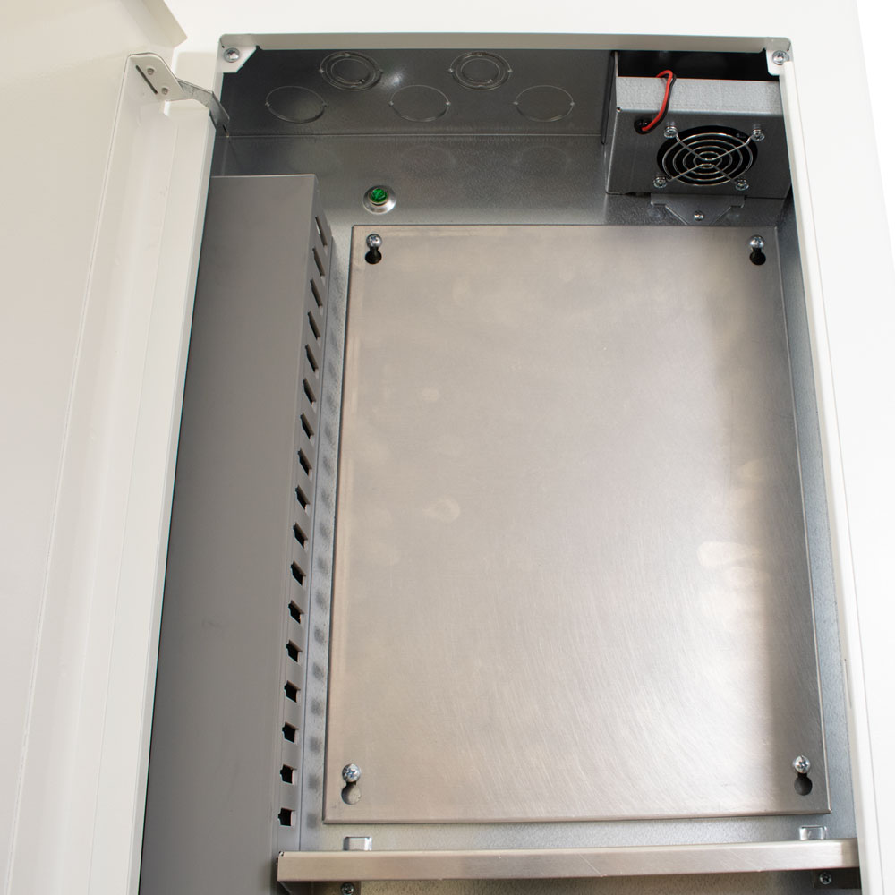 For convenience, the MWB-28 ships with a 3-Decorator SpikeShield 15-amp surge-protected AC bracket. A variable-speed, temperature-controlled fan is available as an optional cooling solution. Whisper-quiet, the fan produces a 24 dBA SPL at an 80-watt heat load. It is designed to maintain an internal box temperature below 104°F with a 100-watt thermal load, keeping internal equipment at a safe temperature. The MWB-28 includes a set of internal brackets, providing mounting flexibility for electronic devices.