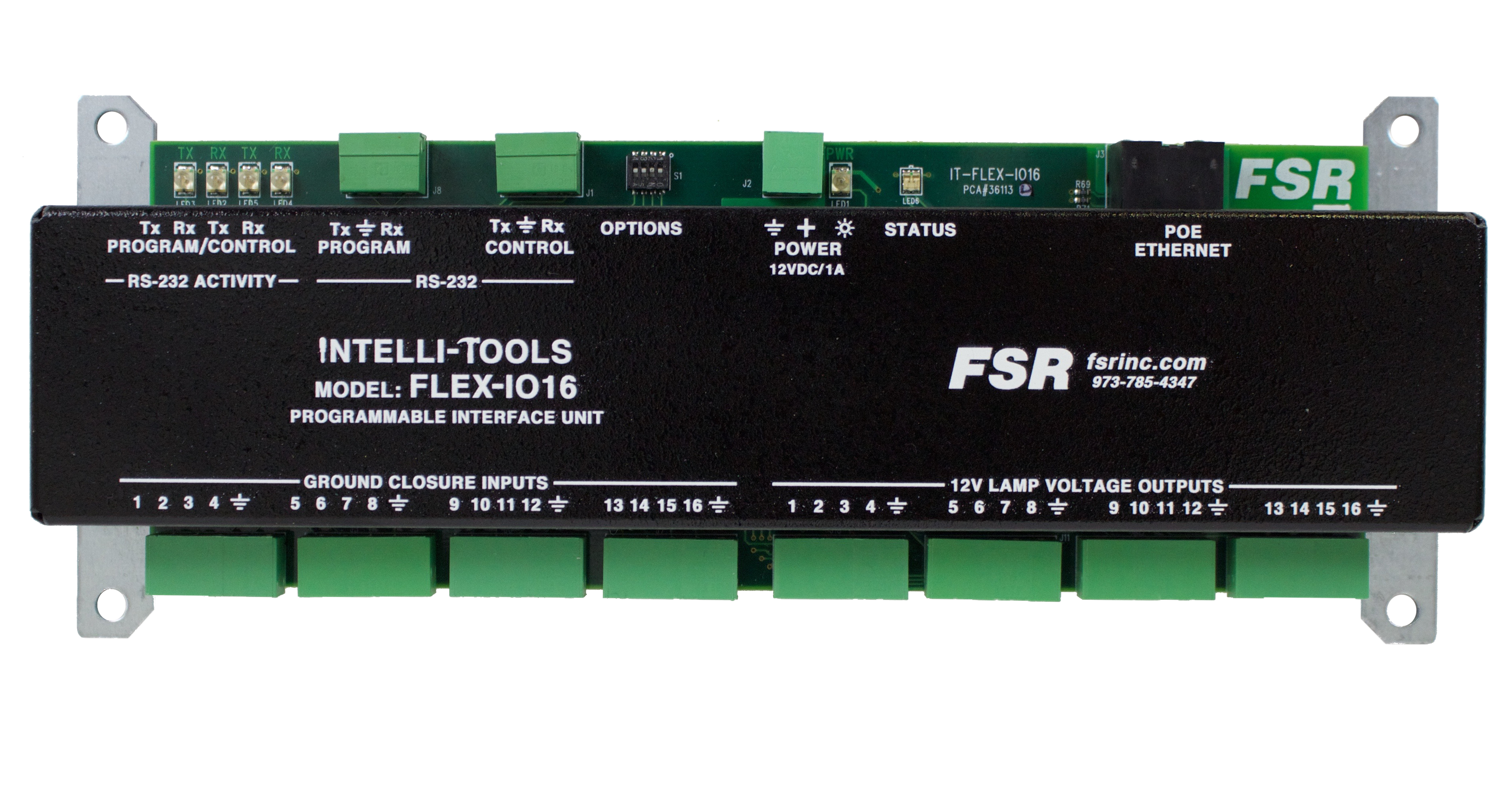 The FLEX-IO16 I/O Expansion Unit is a new addition to FSR’s Intelli-Tools line. It is a device that will provide 16 Ground Closure Inputs and 16 Lamp/LED Outputs as well as RS-232 & IP Communication to expand the control capabilities of FSR FLEX Controllers as well as interfacing with any 3rd party control system. The Flex-IO16 is a fully programmable control system component that provides an interface between virtually any equipment having an RS-232 or Ethernet port and external controls with up to 16 switches and lamps/LEDs. It can also be used to add IP connectivity to equipment that only has an RS-232 port.