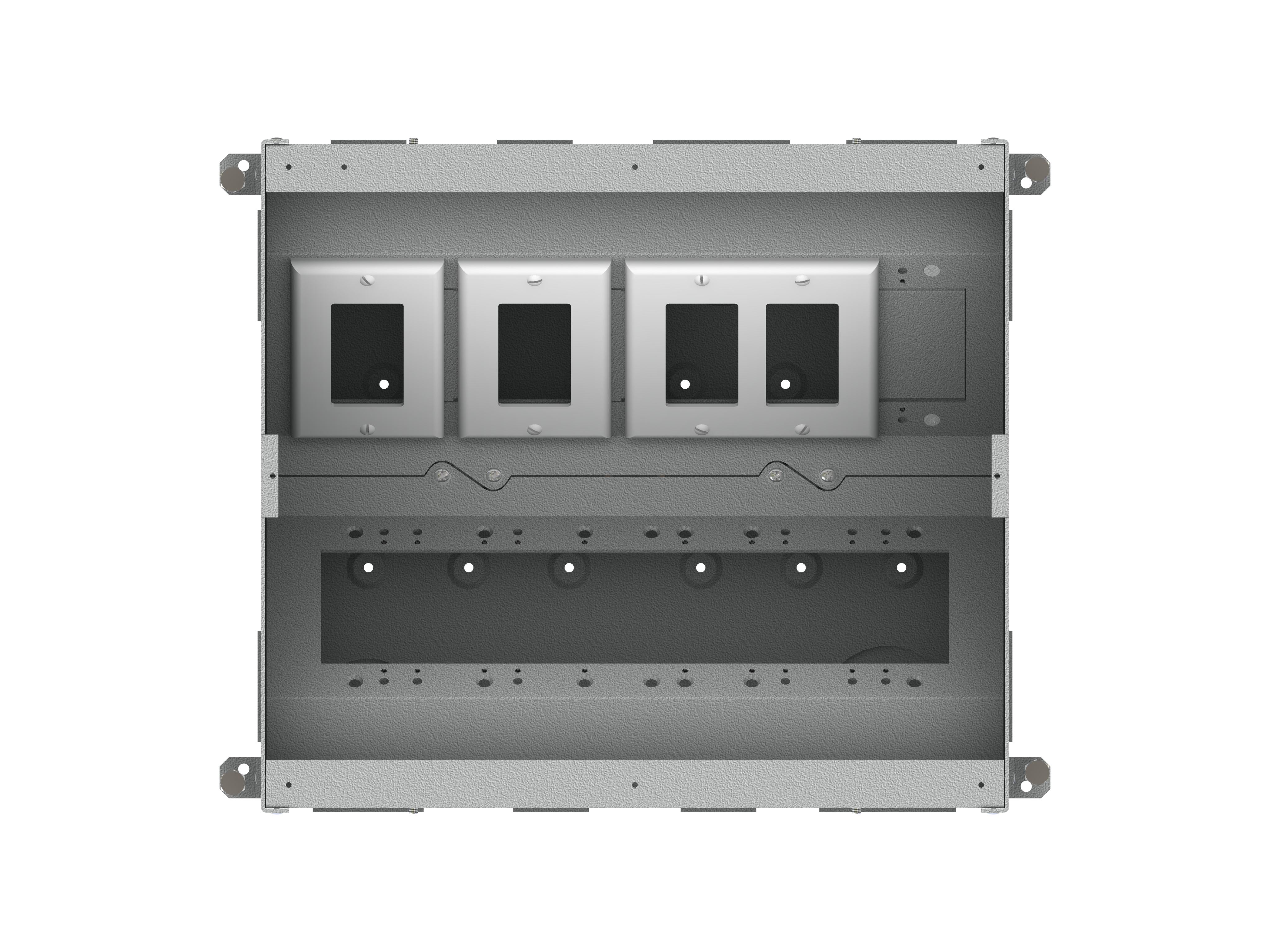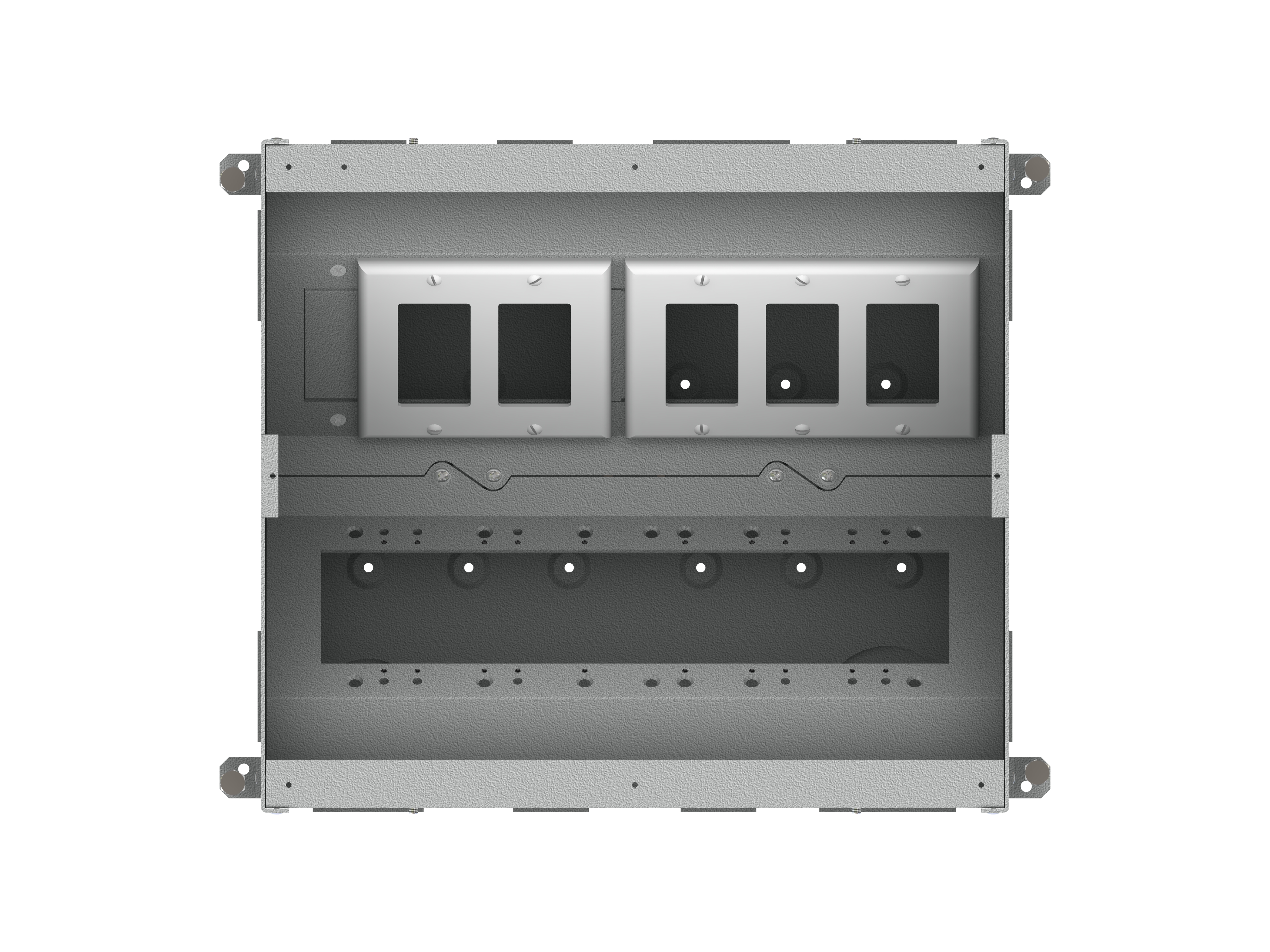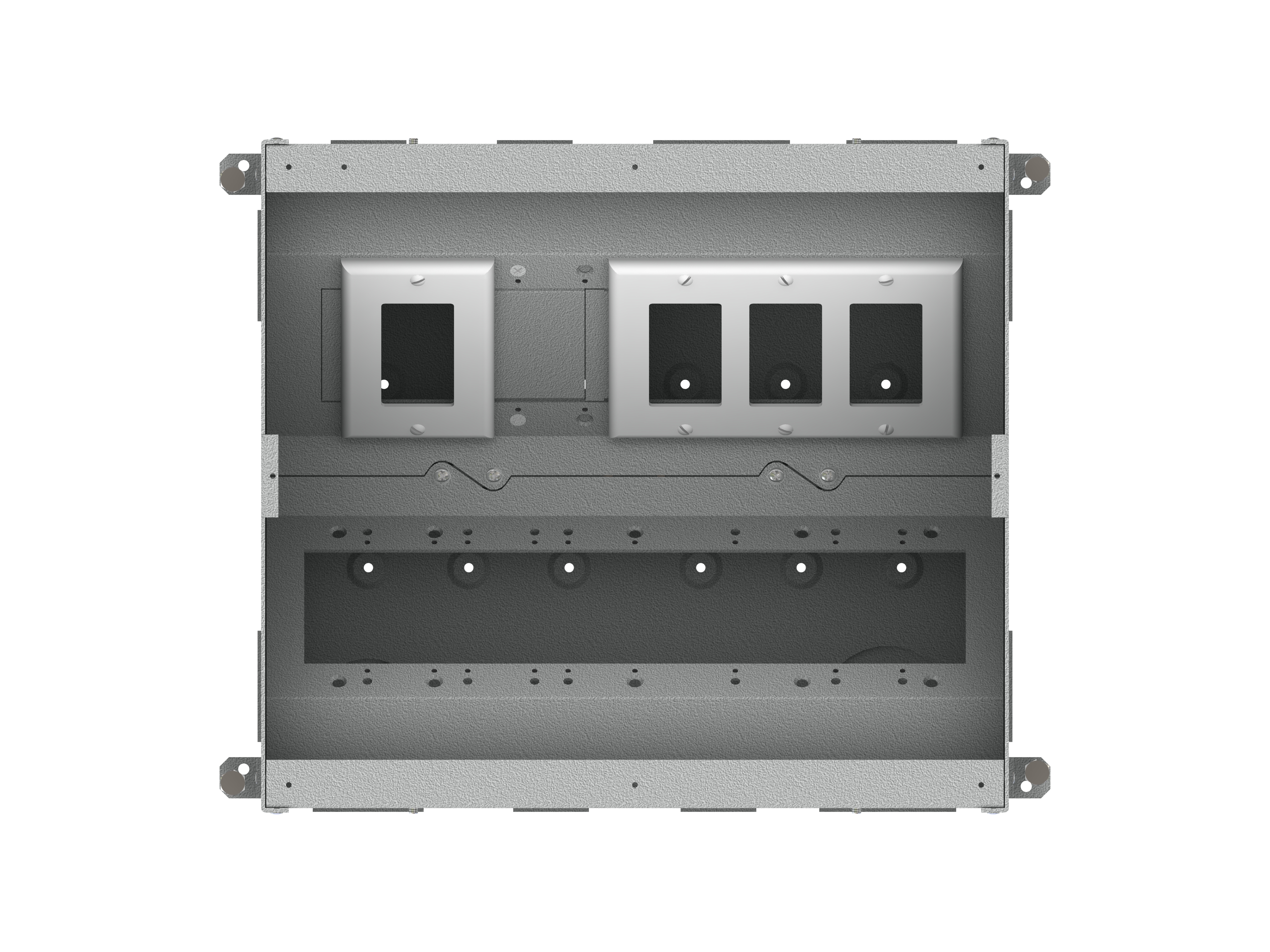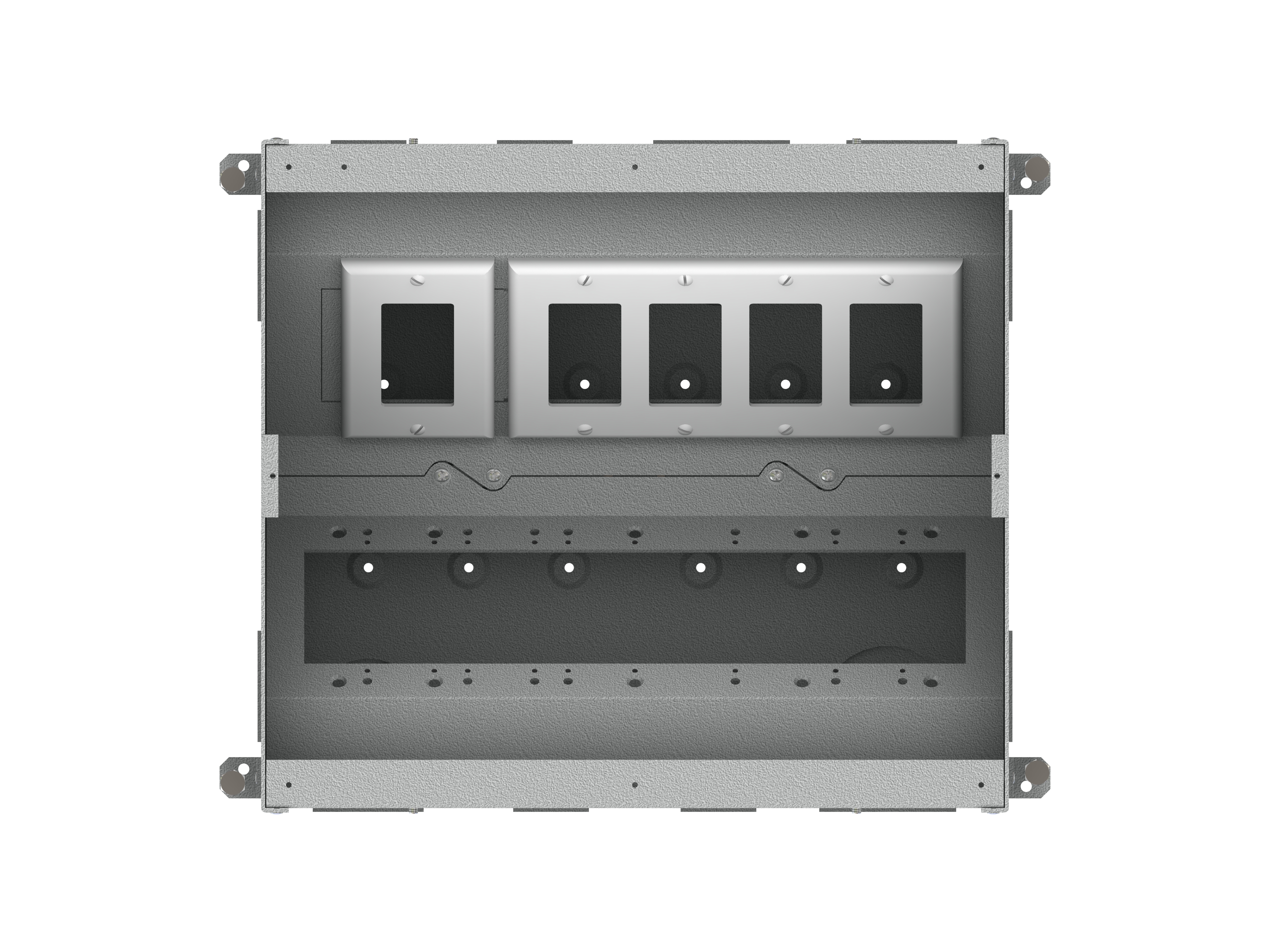 The unit includes all of the necessary internal plates and brackets to make “pre” and “post” pour compartment changes quick and easy. Using this system, both high and low voltage gang configurations, along with compartment isolation, can be implemented “on the fly”. This makes just about any cabling/connector scenario possible.