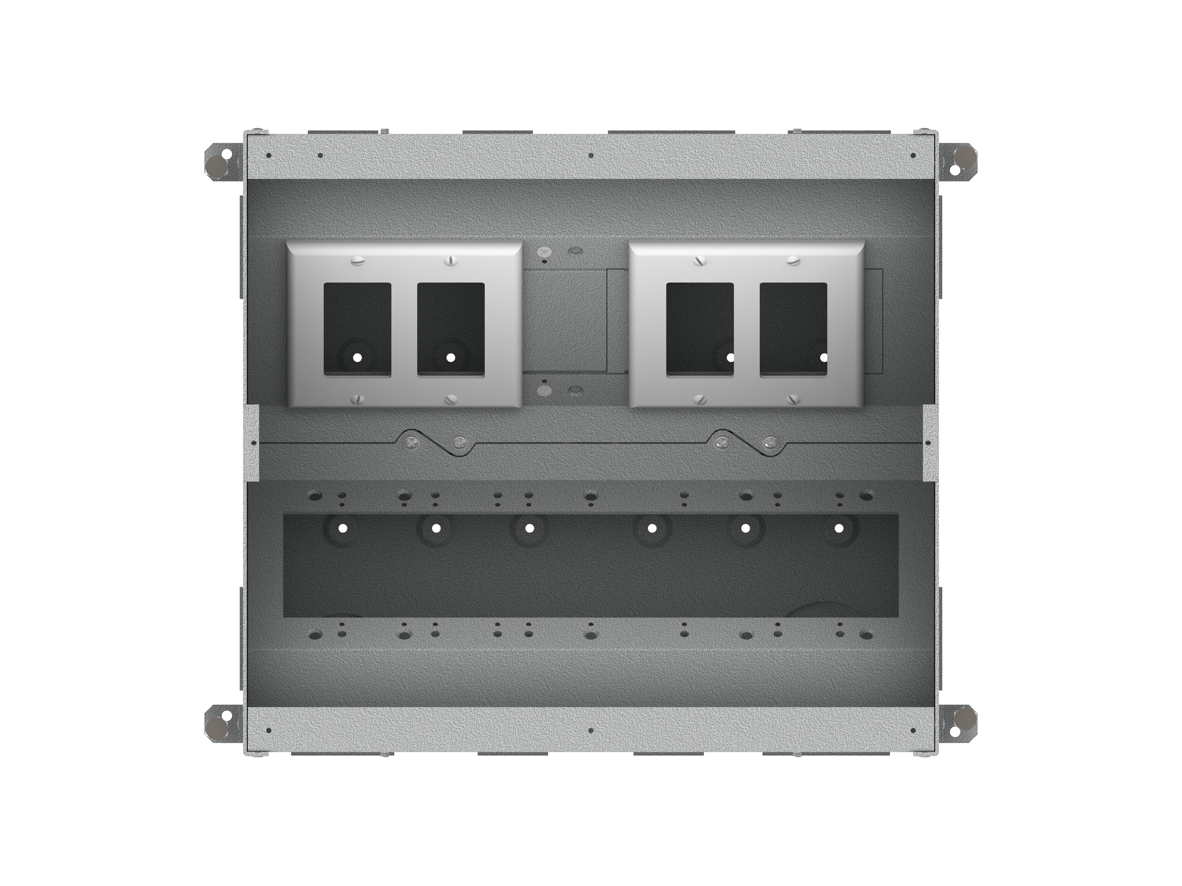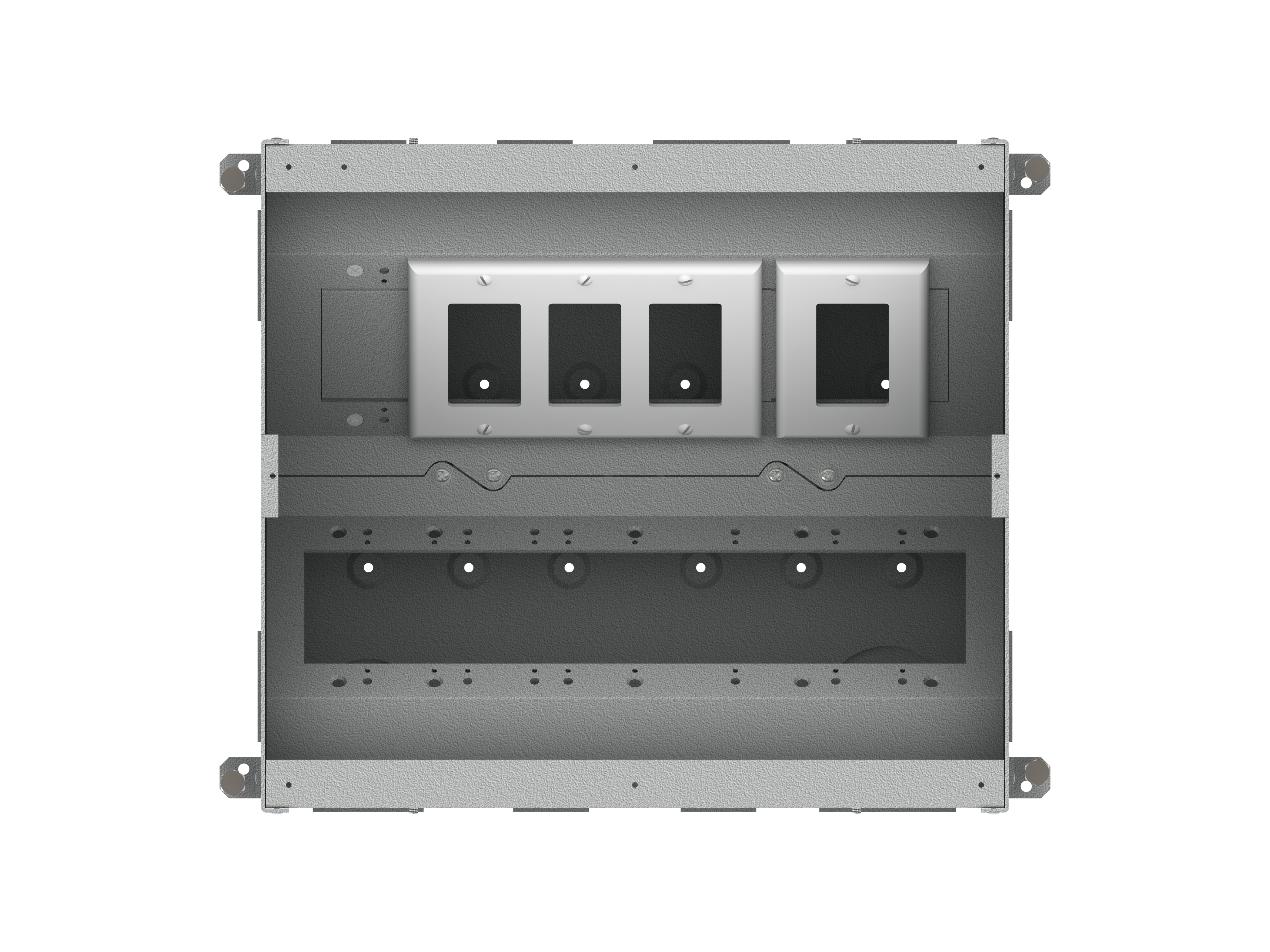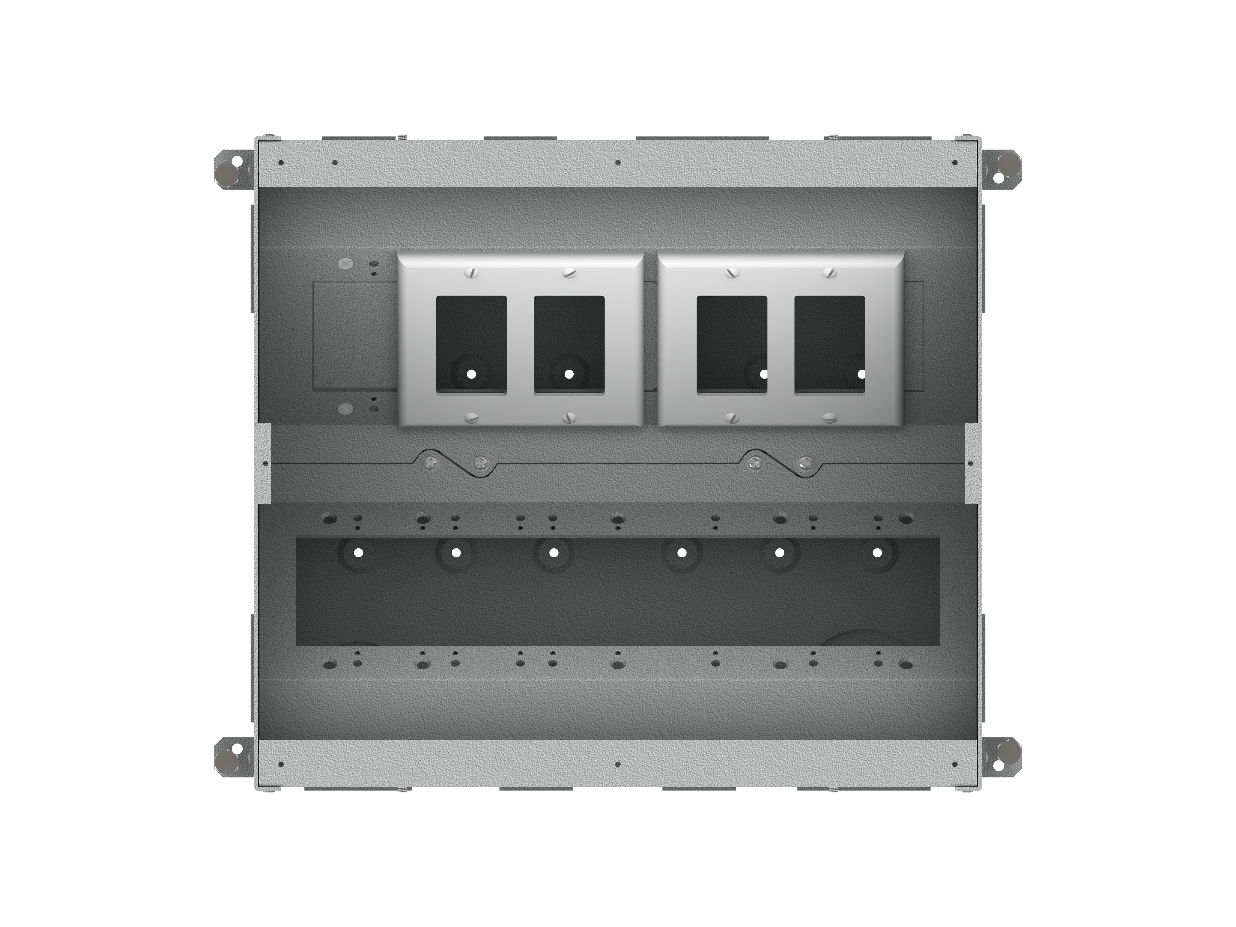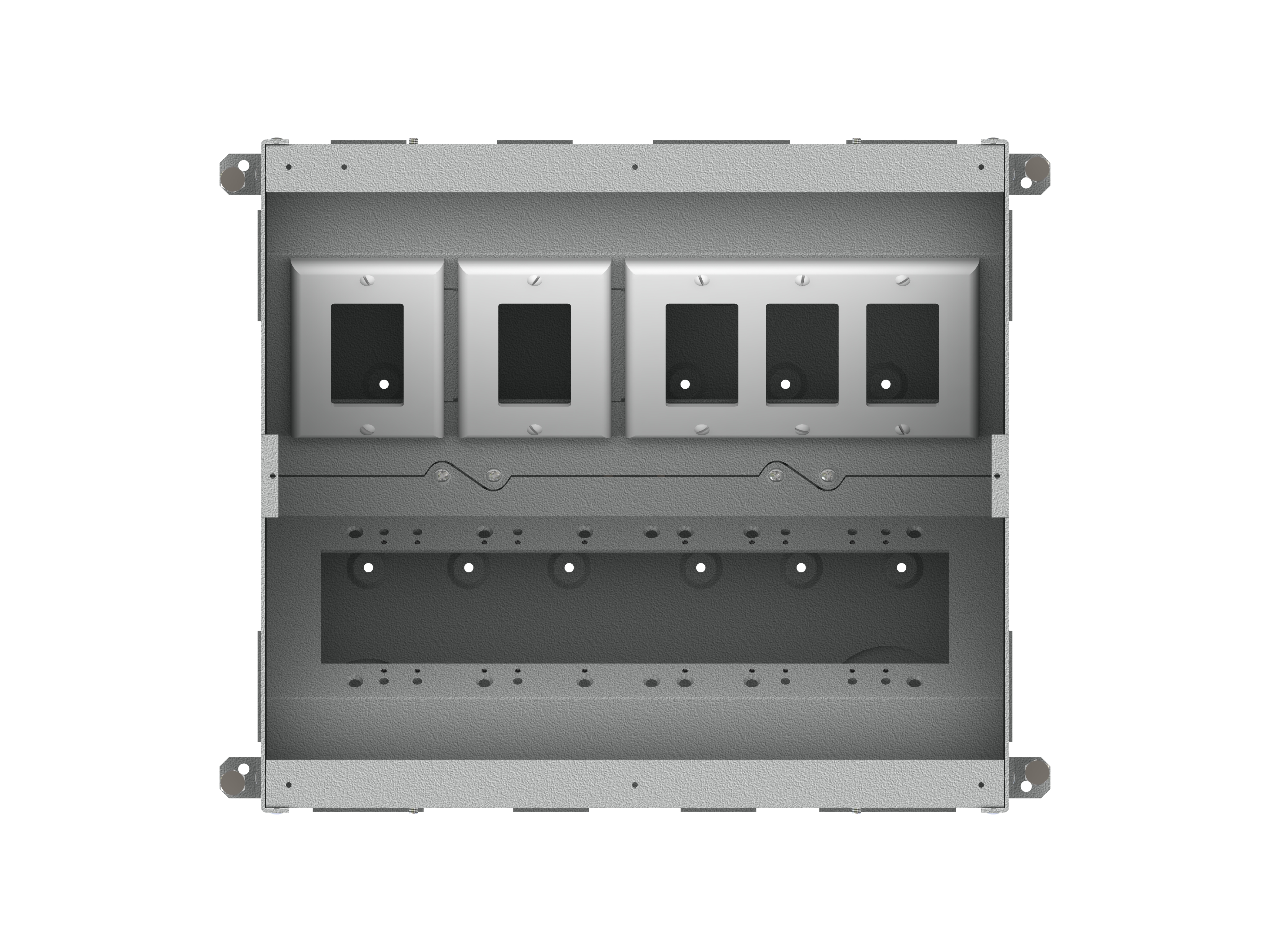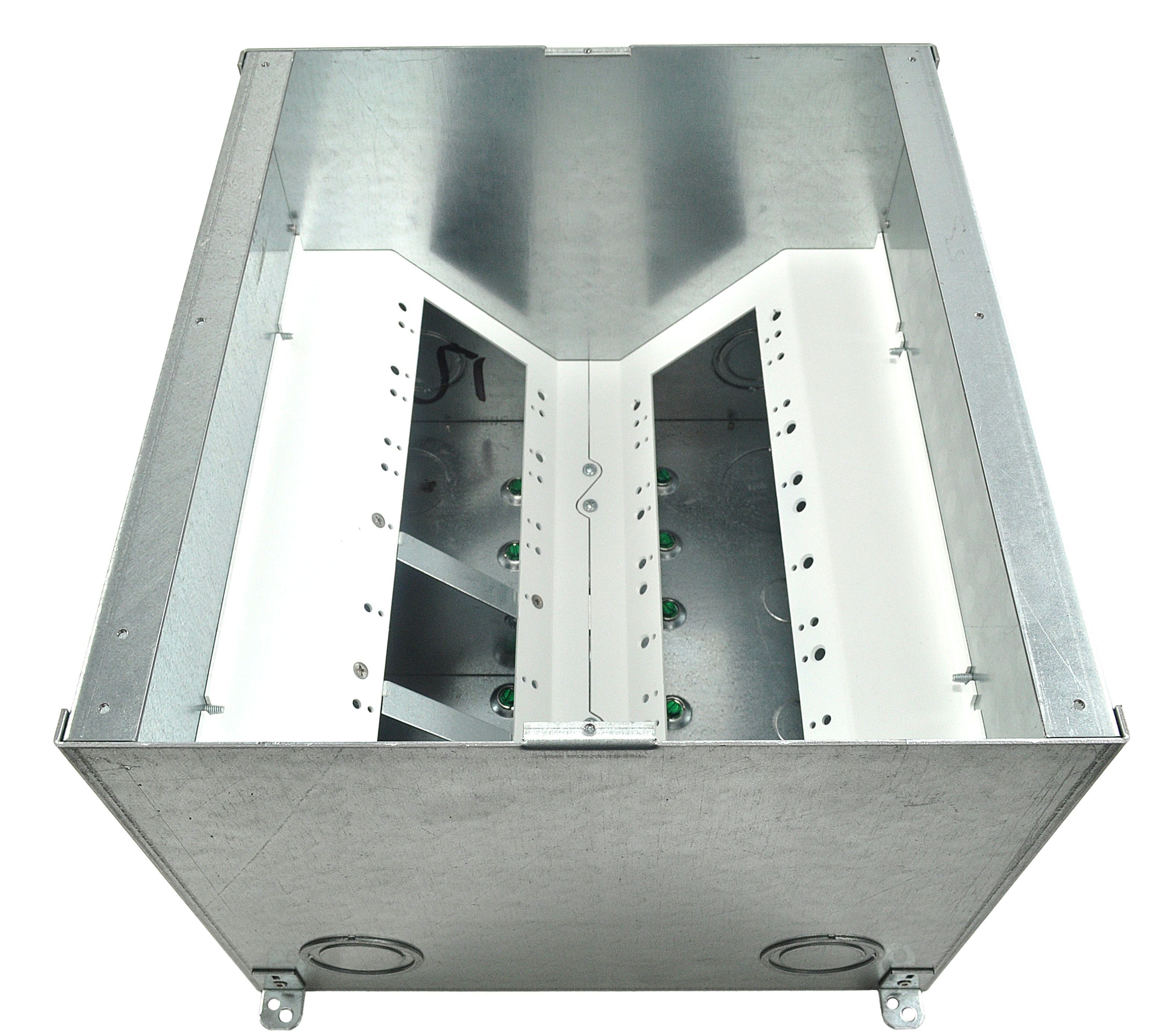 The unit includes all of the necessary internal plates and brackets to make “pre” and “post” pour compartment changes quick and easy. Using this system, both high and low voltage gang configurations, along with compartment isolation, can be implemented “on the fly”. This makes just about any cabling/connector scenario possible.