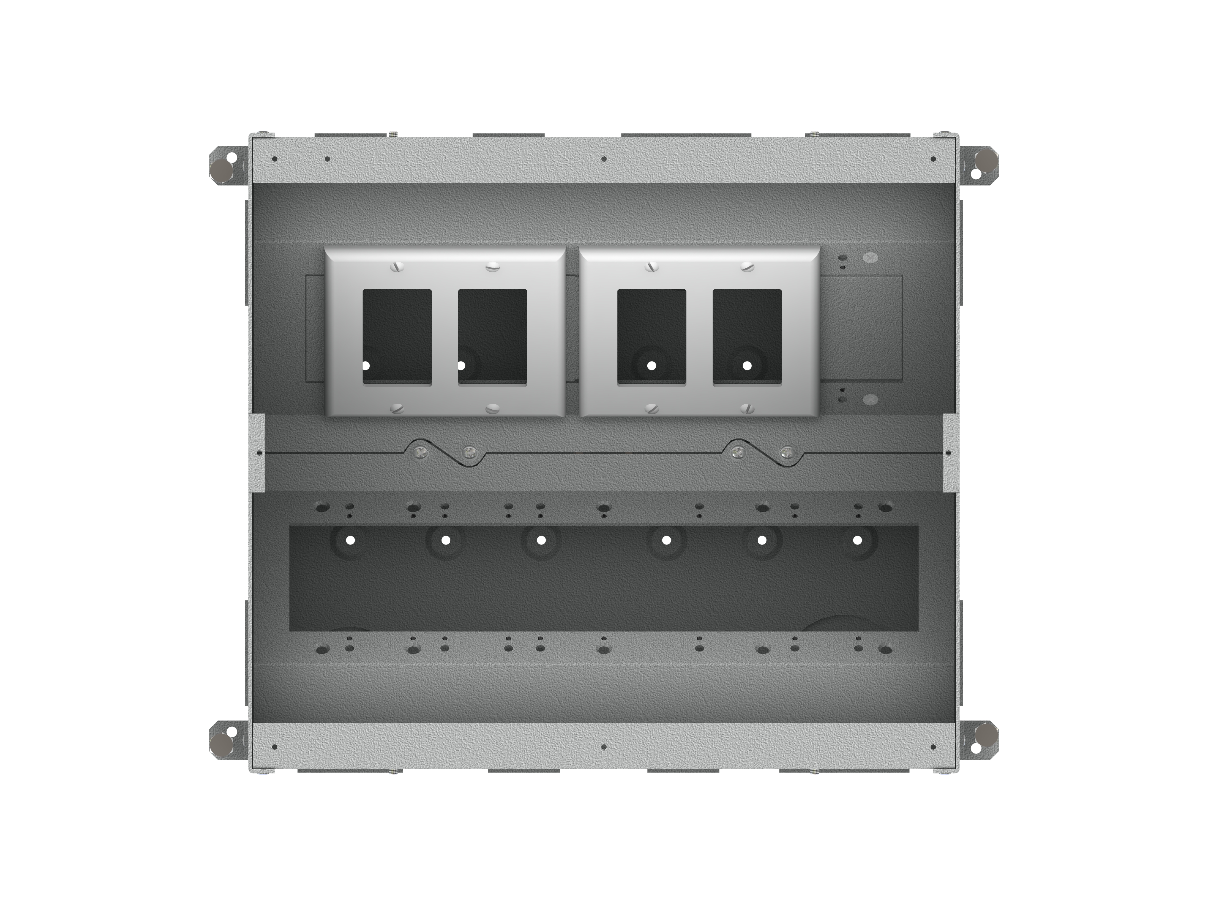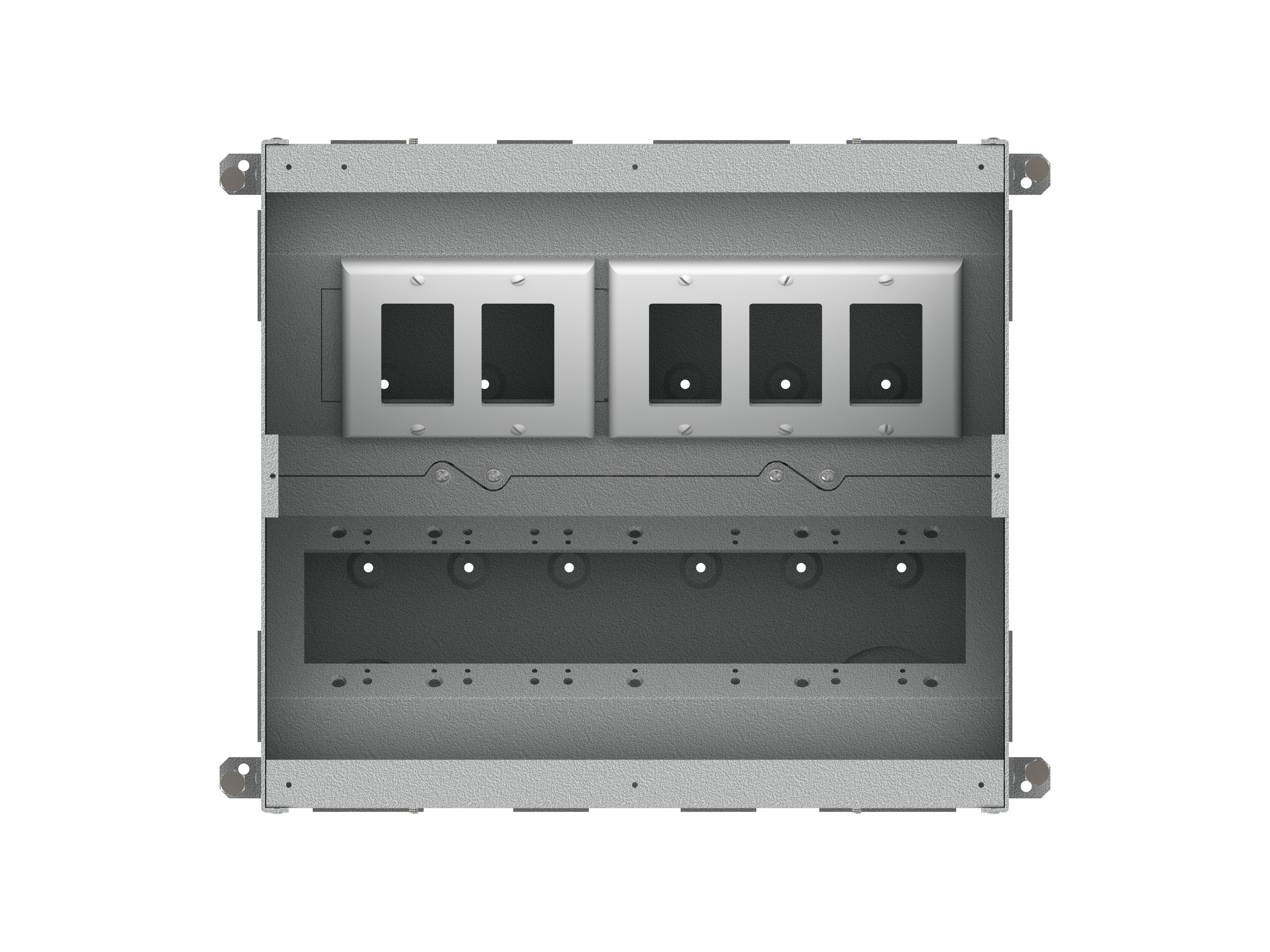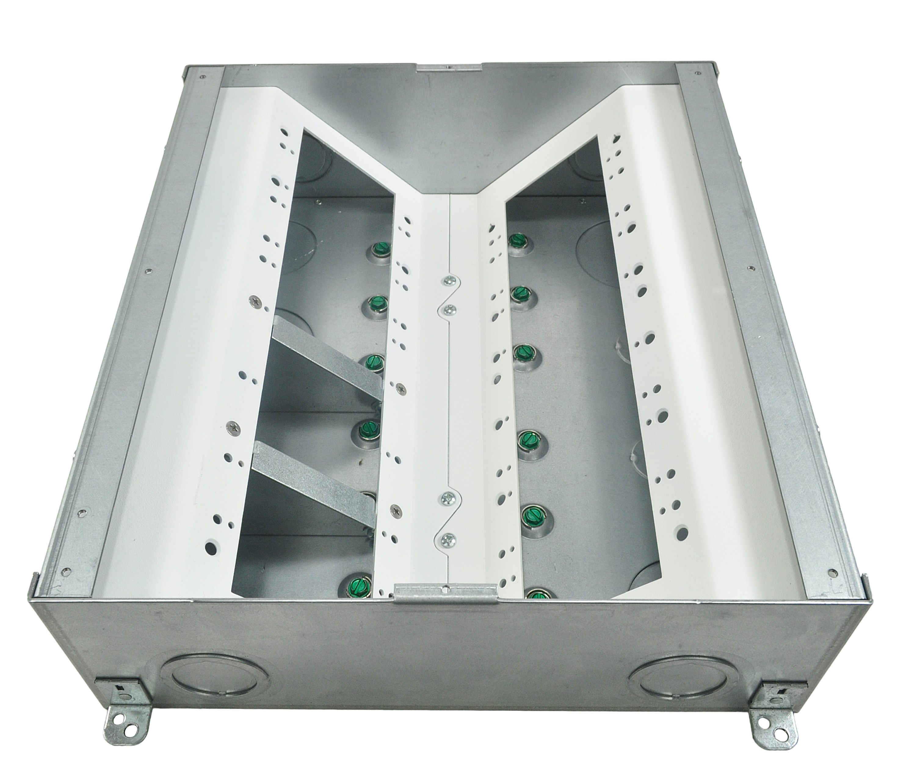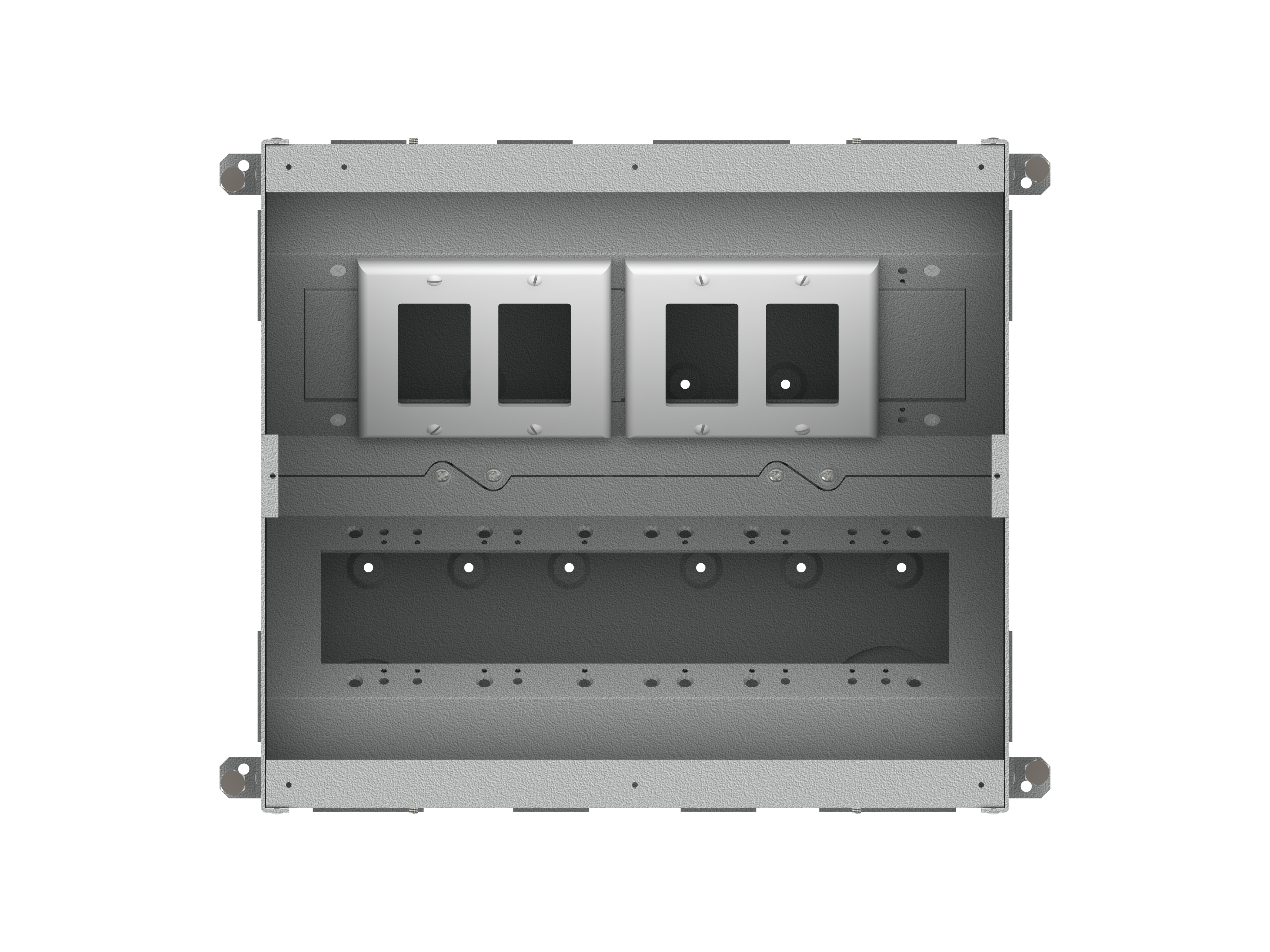The unit includes all of the necessary internal plates and brackets to make “pre” and “post” pour compartment changes quick and easy. Using this system, both high and low voltage gang configurations, along with compartment isolation, can be implemented “on the fly”. This makes just about any cabling/connector scenario possible.