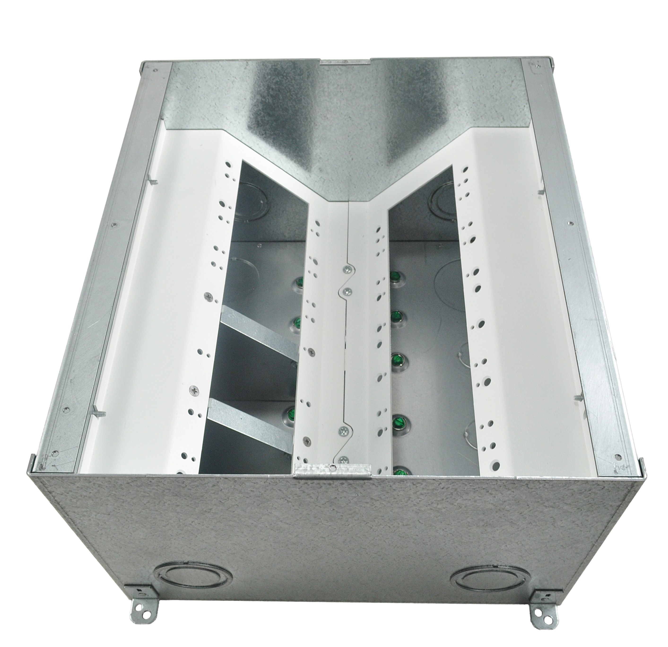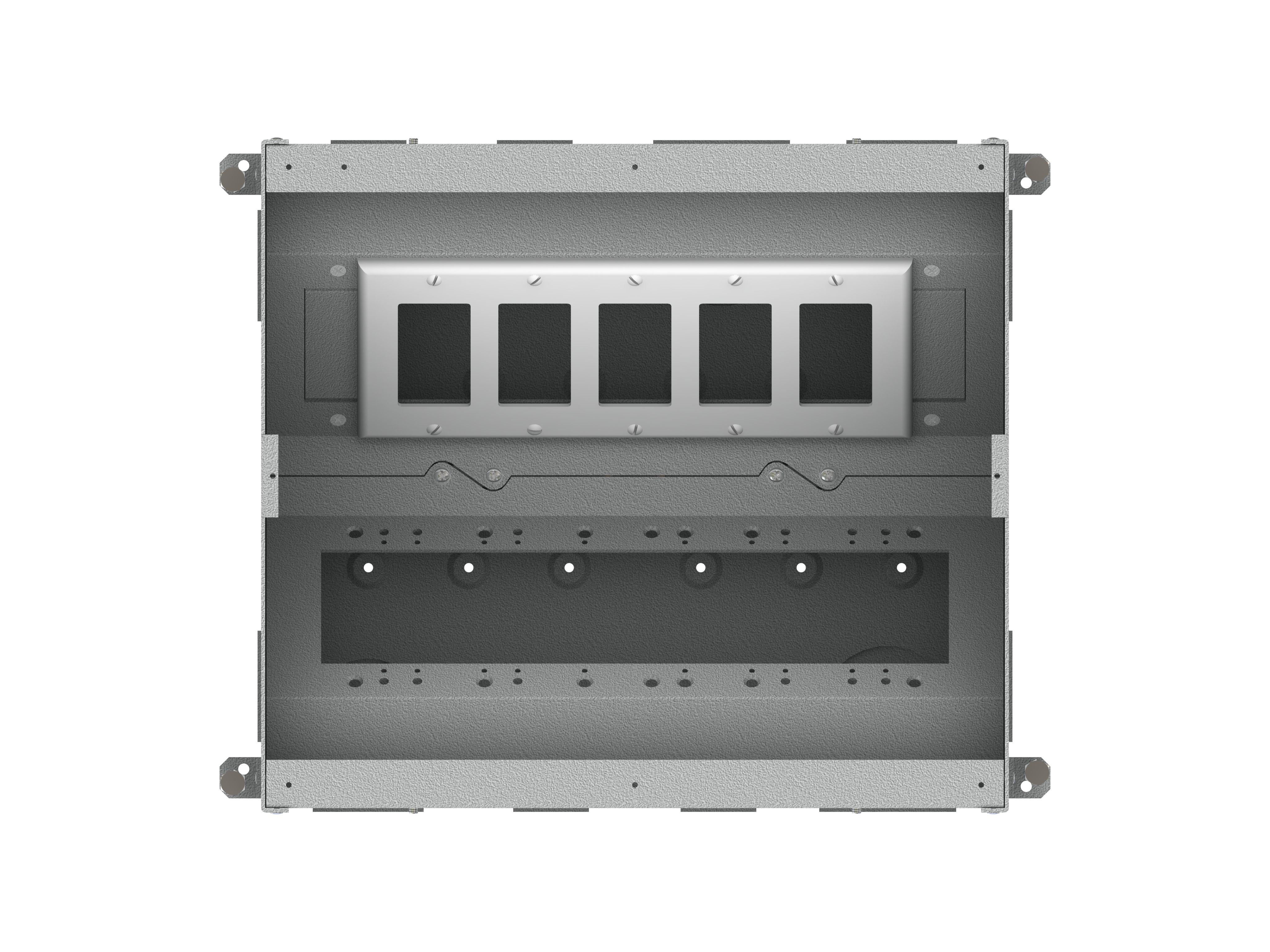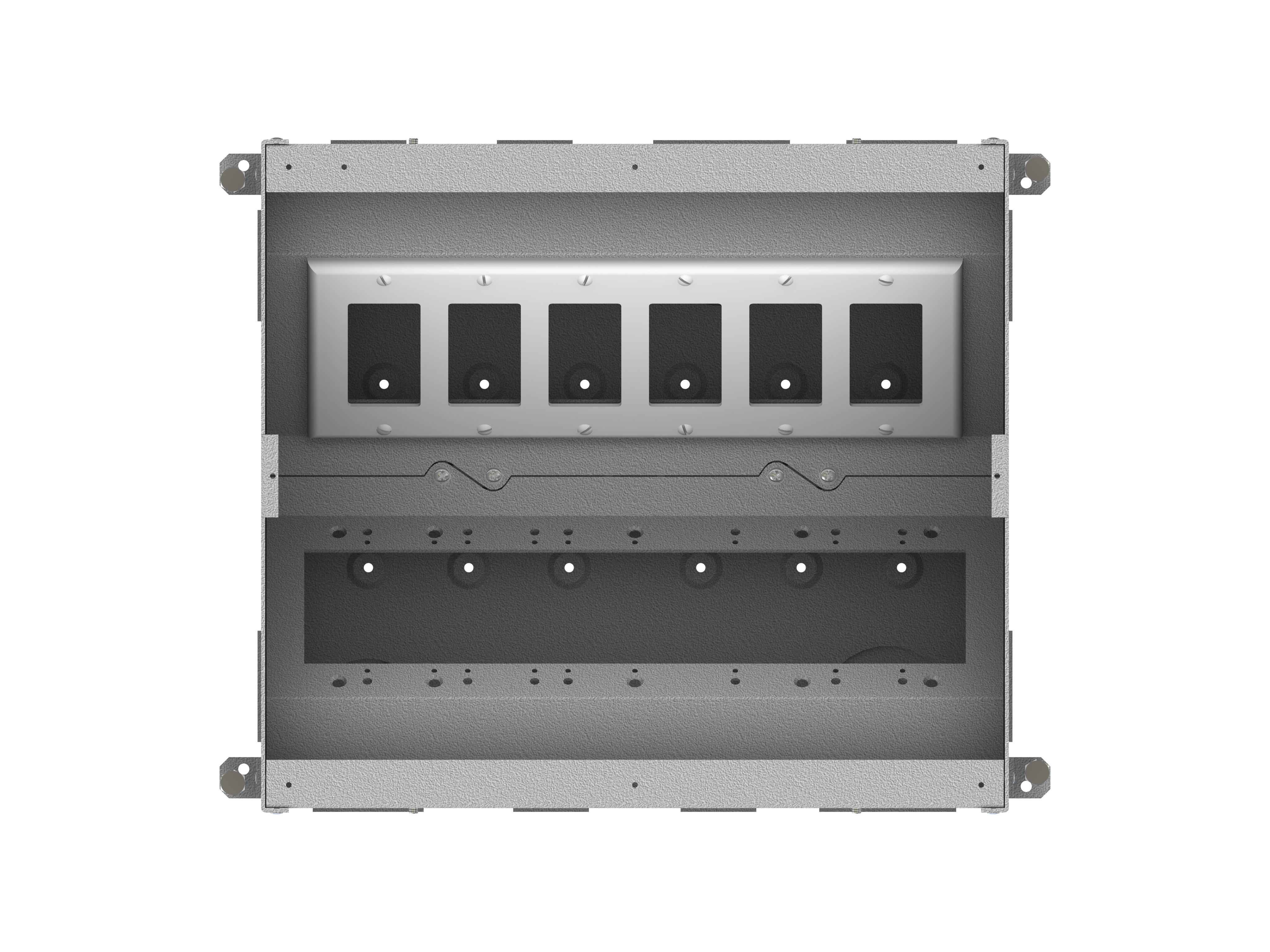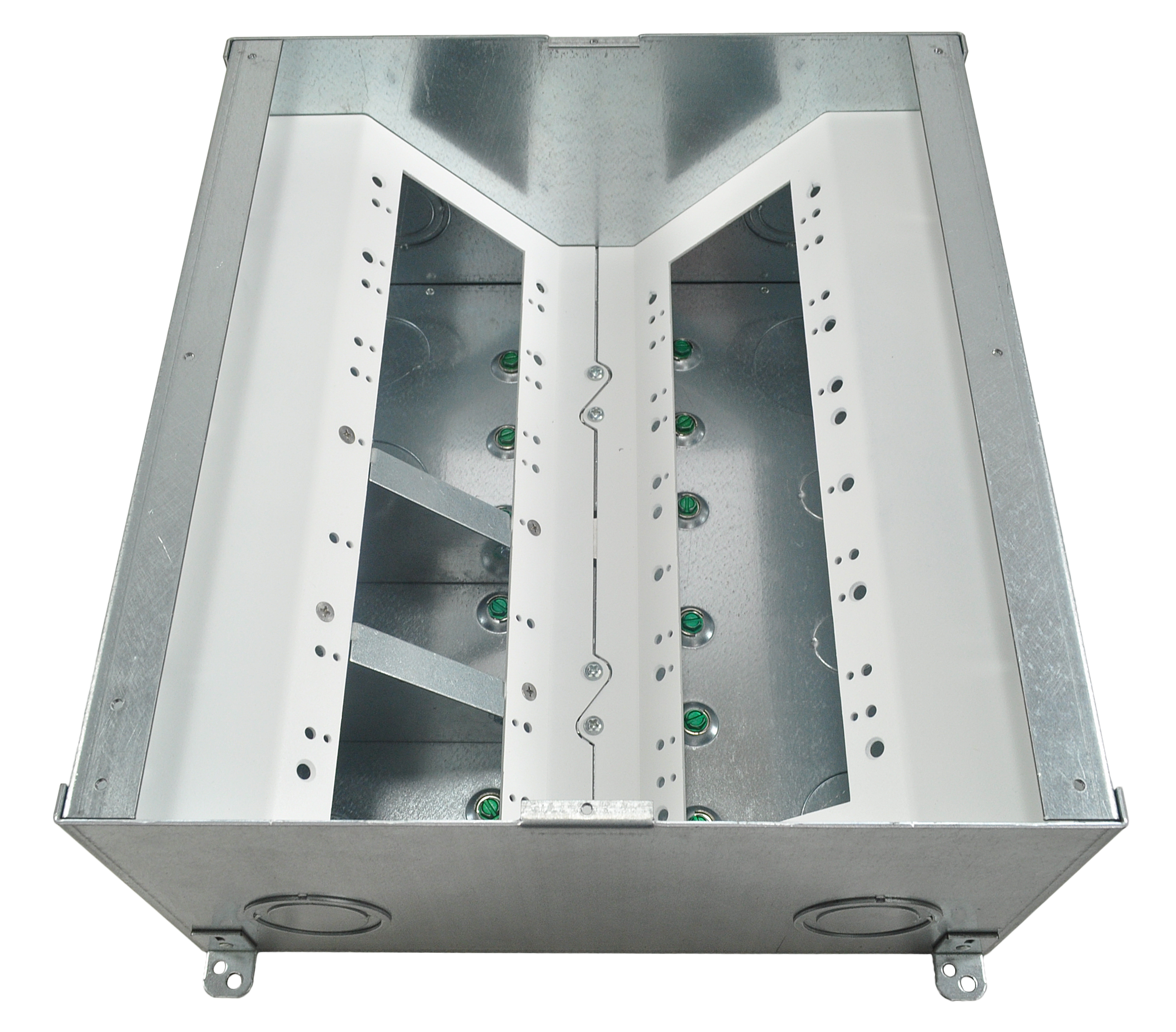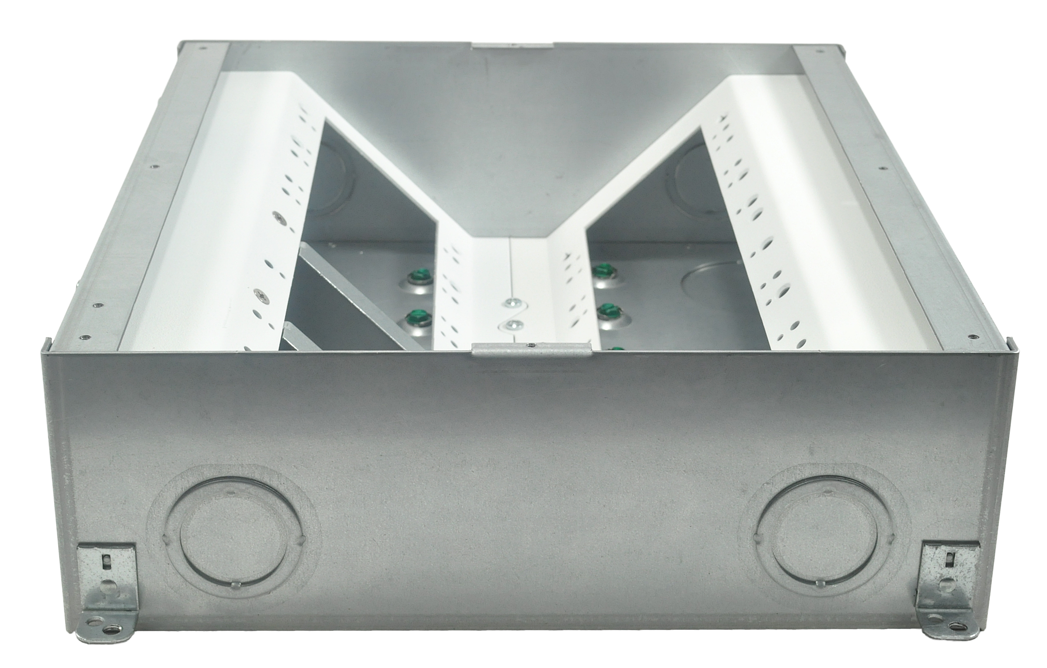The unit includes all of the necessary internal plates and brackets to make “pre” and “post” pour compartment changes quick and easy. Using this system, both high and low voltage gang configurations, along with compartment isolation, can be implemented “on the fly”. This makes just about any cabling/connector scenario possible.