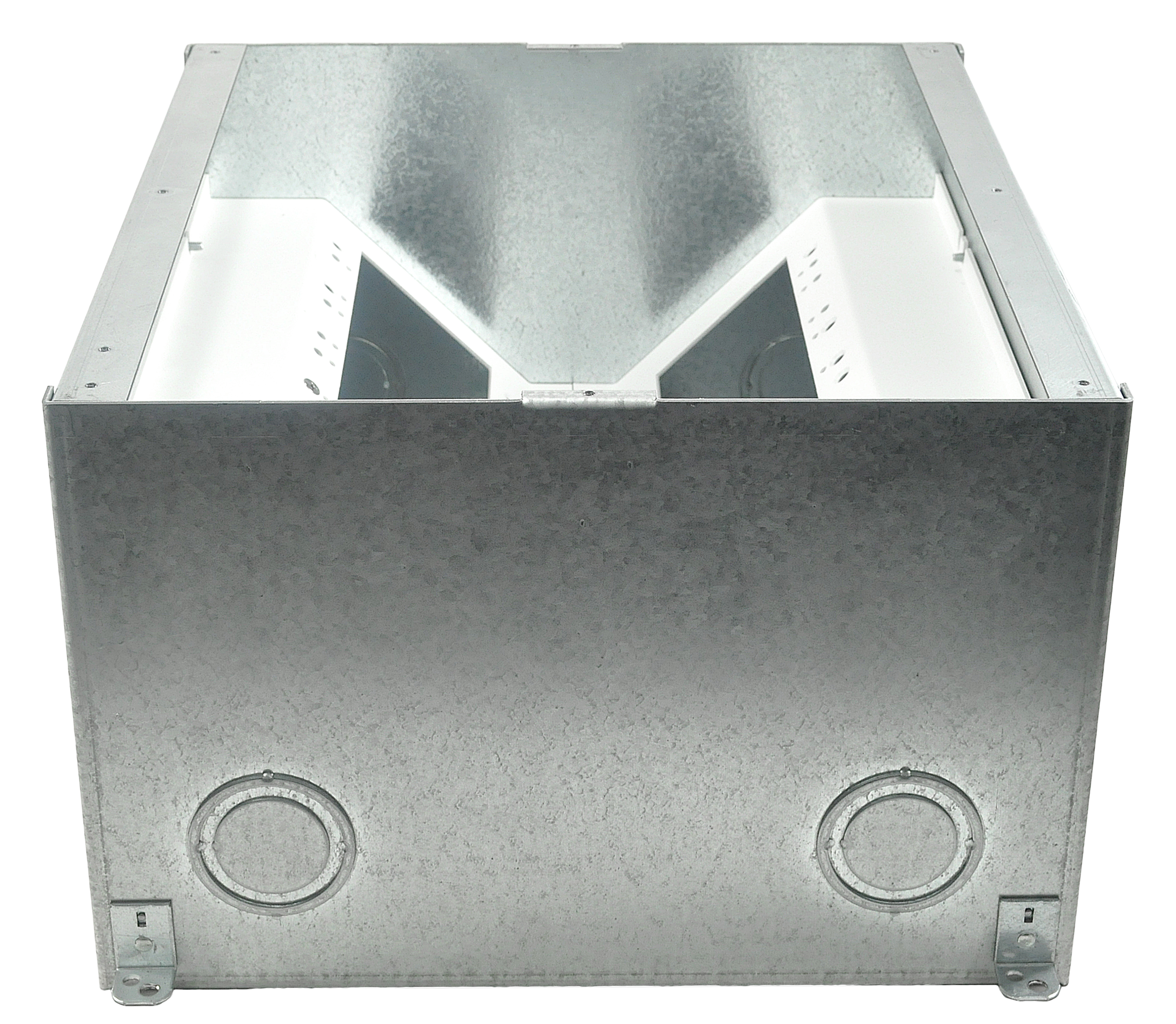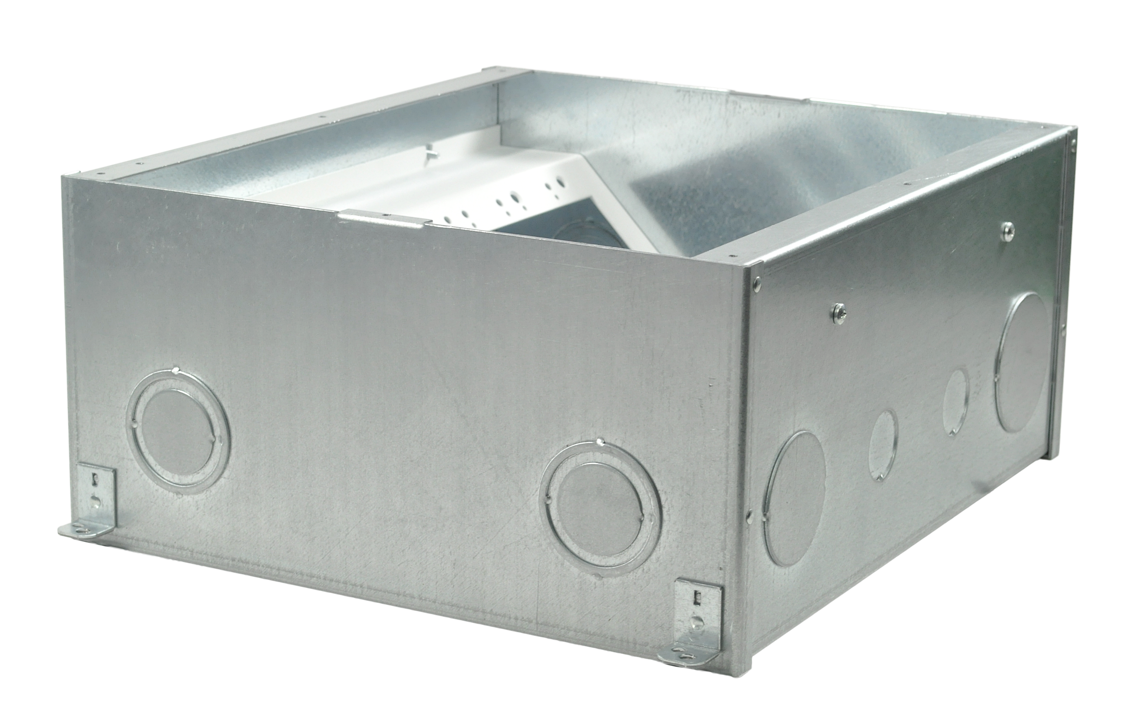 The innovation continues to the “transformable” box bottom. The FL-600P’s internal brackets can be arranged to provide numerous options for both high and low voltage standard gang openings making it the most flexible and easiest to in-stall floor box available. Removable center dividers make passing cables through the various compartments a snap. Integral “Easy Pour” leveling feet are standard on all of the box bottoms. Several box depths are available and are UL listed.