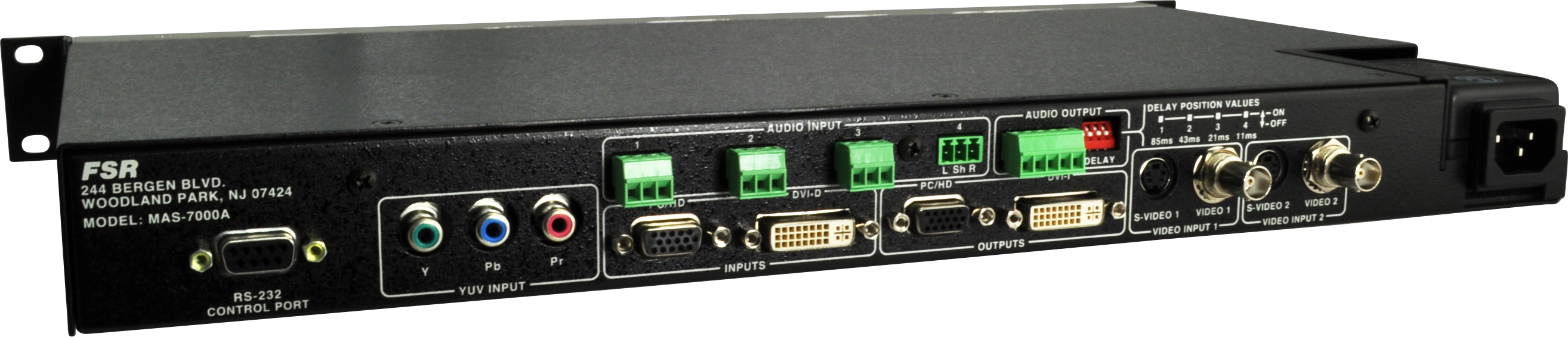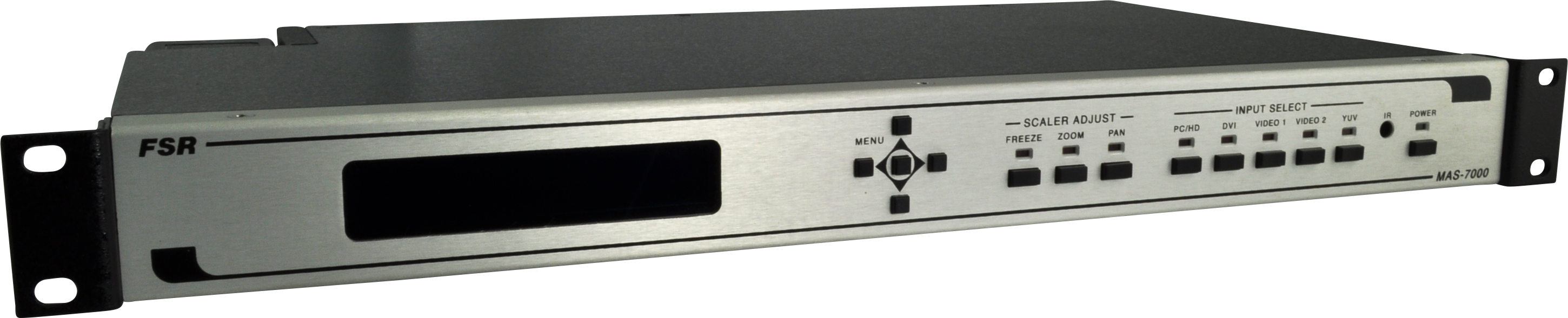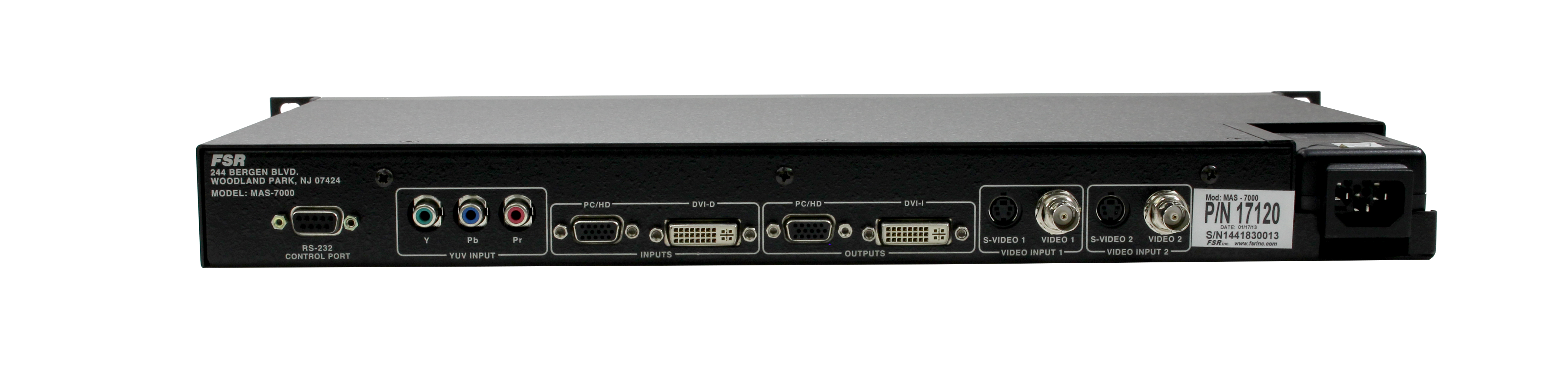 The MAS-7000 is a multi-purpose Video Switcher/Scaler is ideal for boardroom and house of worship presentation systems. The MAS-7000 provides high quality scaling from Standard Definition, High Definition and Computer video sources to resolutions that match your projector, plasma or HD display.