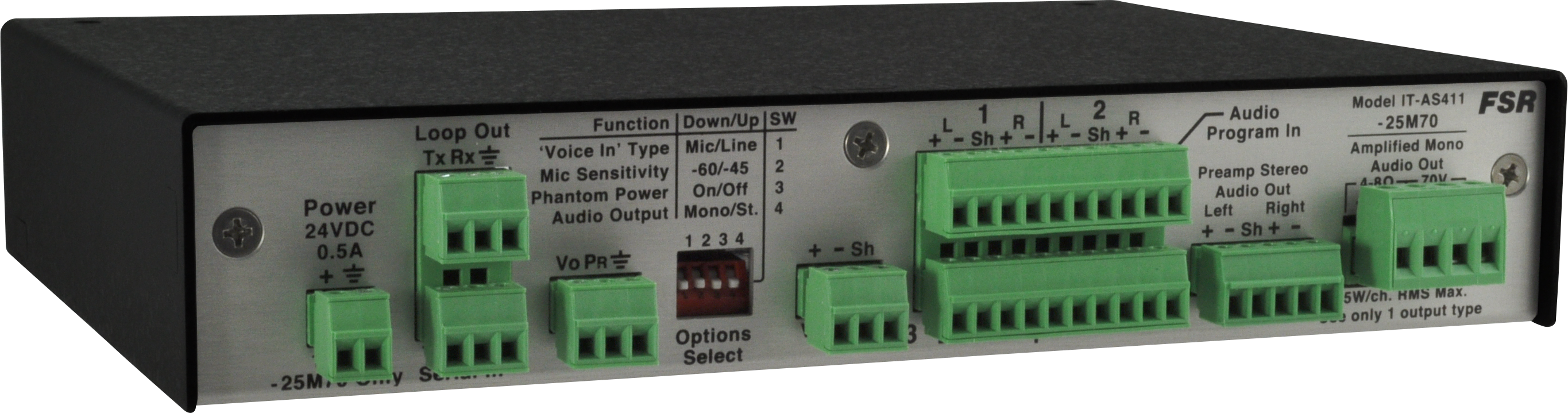 The IT-AS411 Series Audio Switchers are 4x1 audio switchers that have an extra mic/line level input for a voice lift system or direct microphone input. All models have four switched program audio inputs and an independent mic or line level input that is summed (mixed) with the selected active program audio.
