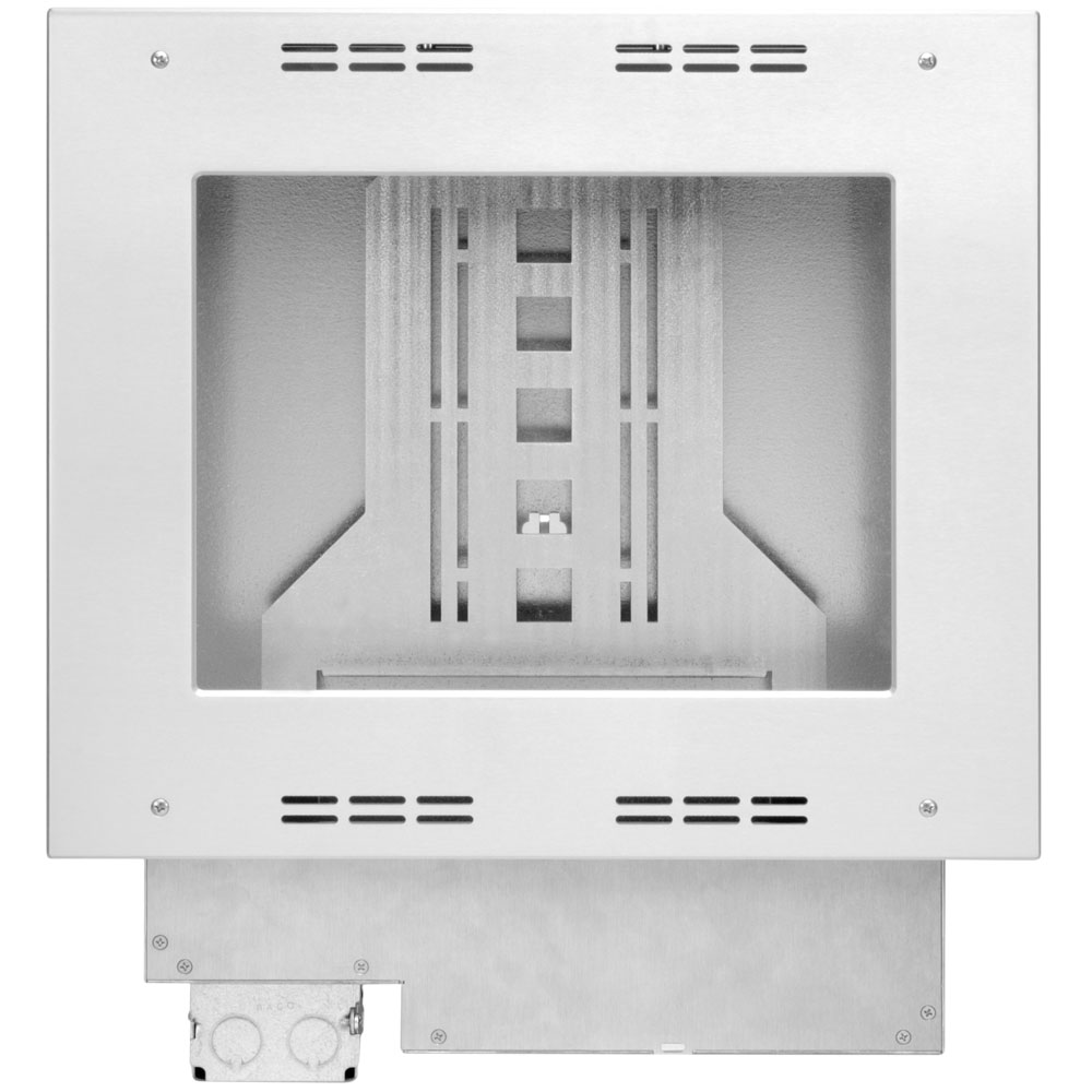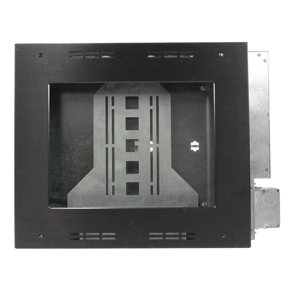 The screen-surround bezel is made of aluminum, and is available in clear or black anodized finishes suitable for painting. AV connections enter the back box through the top or bottom via standard 1”-1 1/4” knockouts. AC power is available in a 2’ X 3” UL-listed Gem box mounted to the bottom of the back box.